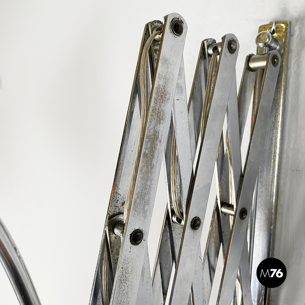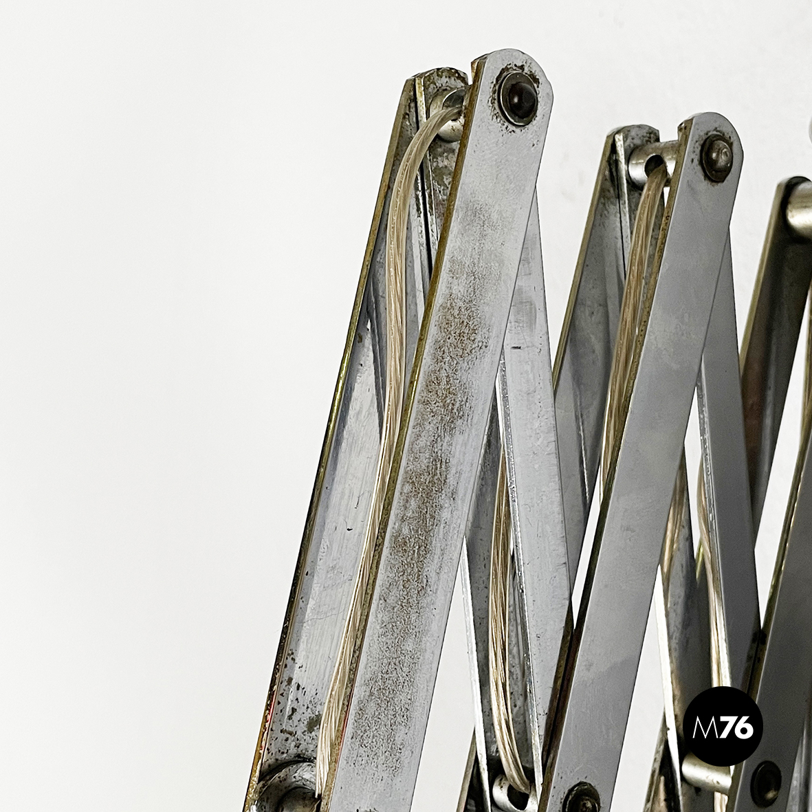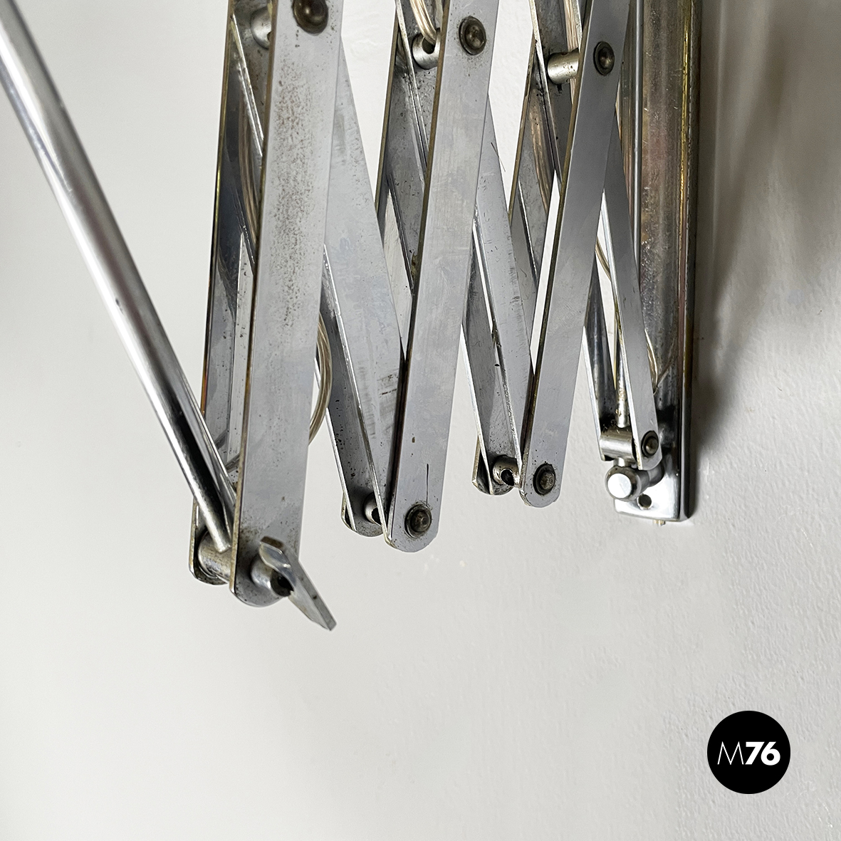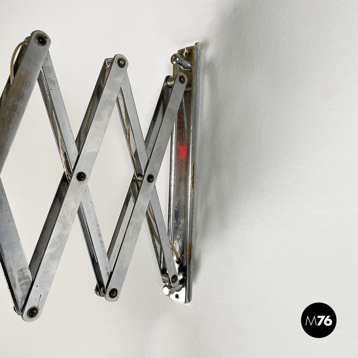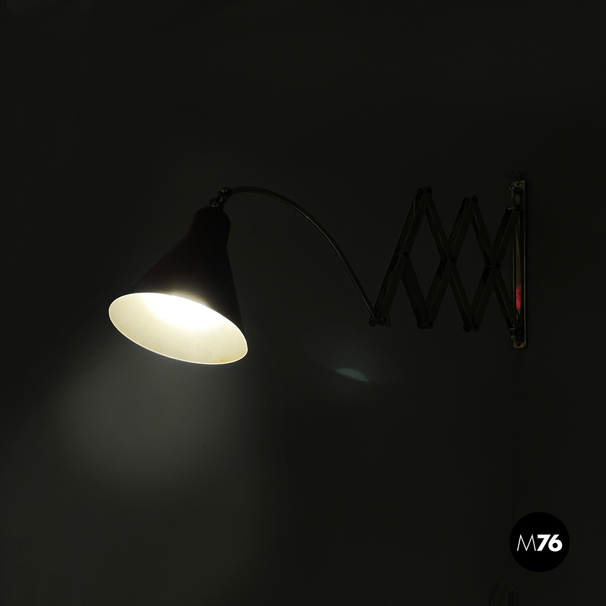 Lampada da parete a pantografo con struttura a braccio regolabile in metallo. Il paralume orientabile e conico in metallo verniciato rosso è connesso alla struttura grazie ad un tondino di metallo curvato. Attacco a parete rettangolare.