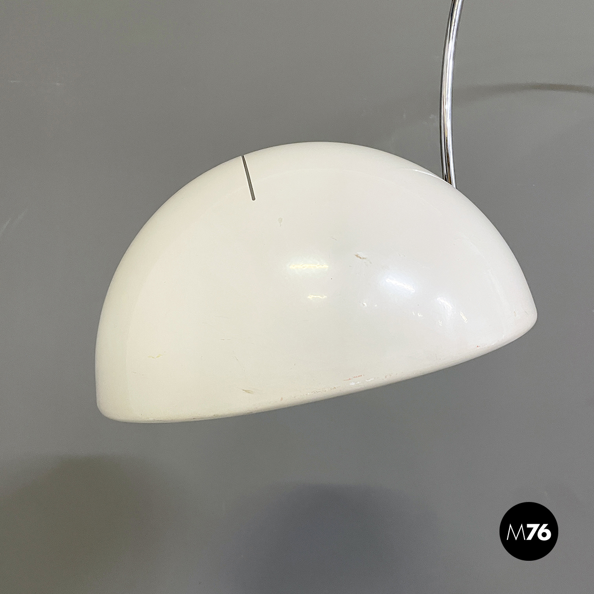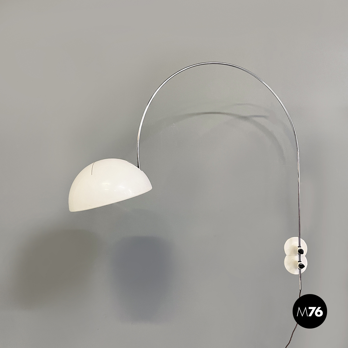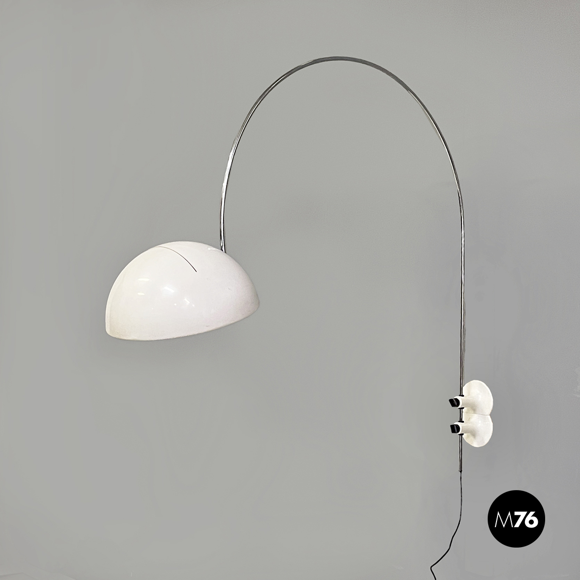 Lampada da parete modello Coupé 1159 con paralume orientabile a cupola in metallo laccato bianco. All’interno del paralume è presente l’interruttore di accensione. La struttura ad arco orientabile è in acciaio cromato mentre la base a forma di otto è in metallo laccato bianco. Alla base sono presenti due blocchi tondi in plastica nera che se sbloccati permetto alla struttura di scorrere.