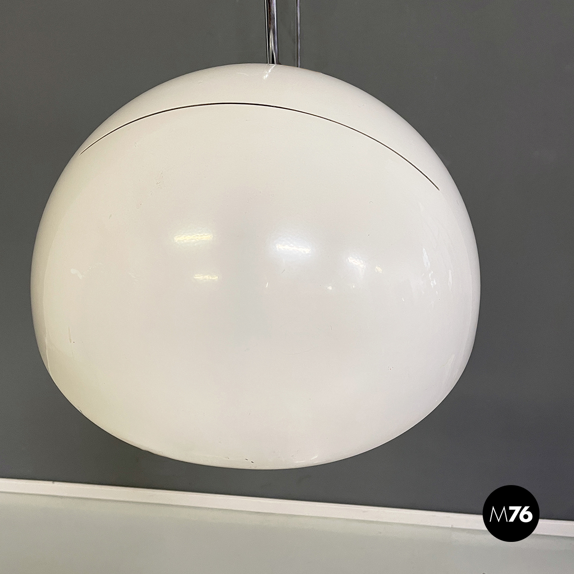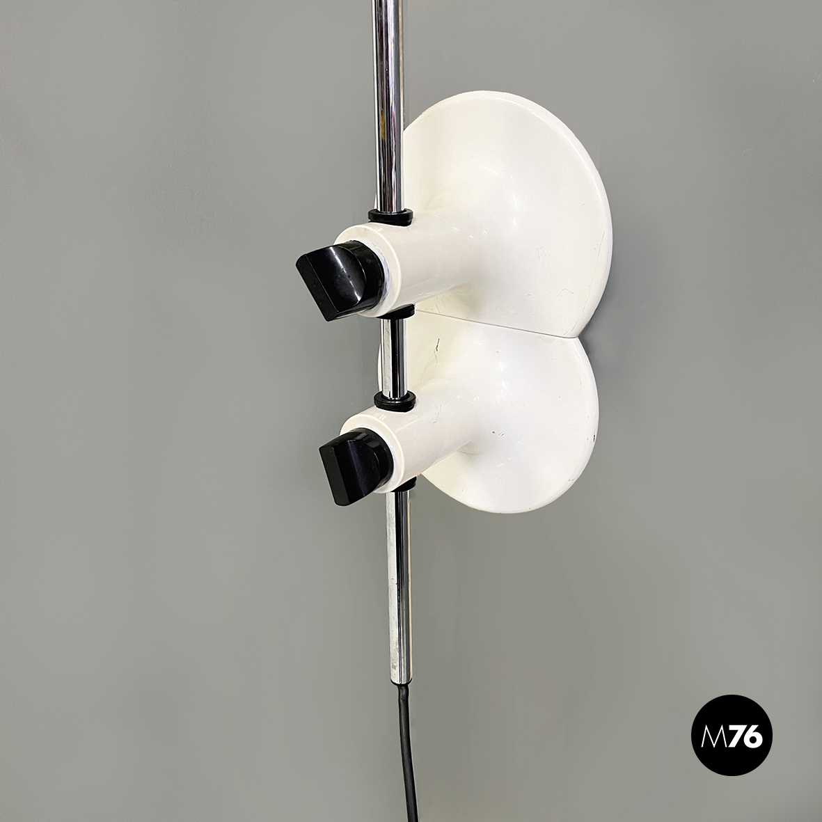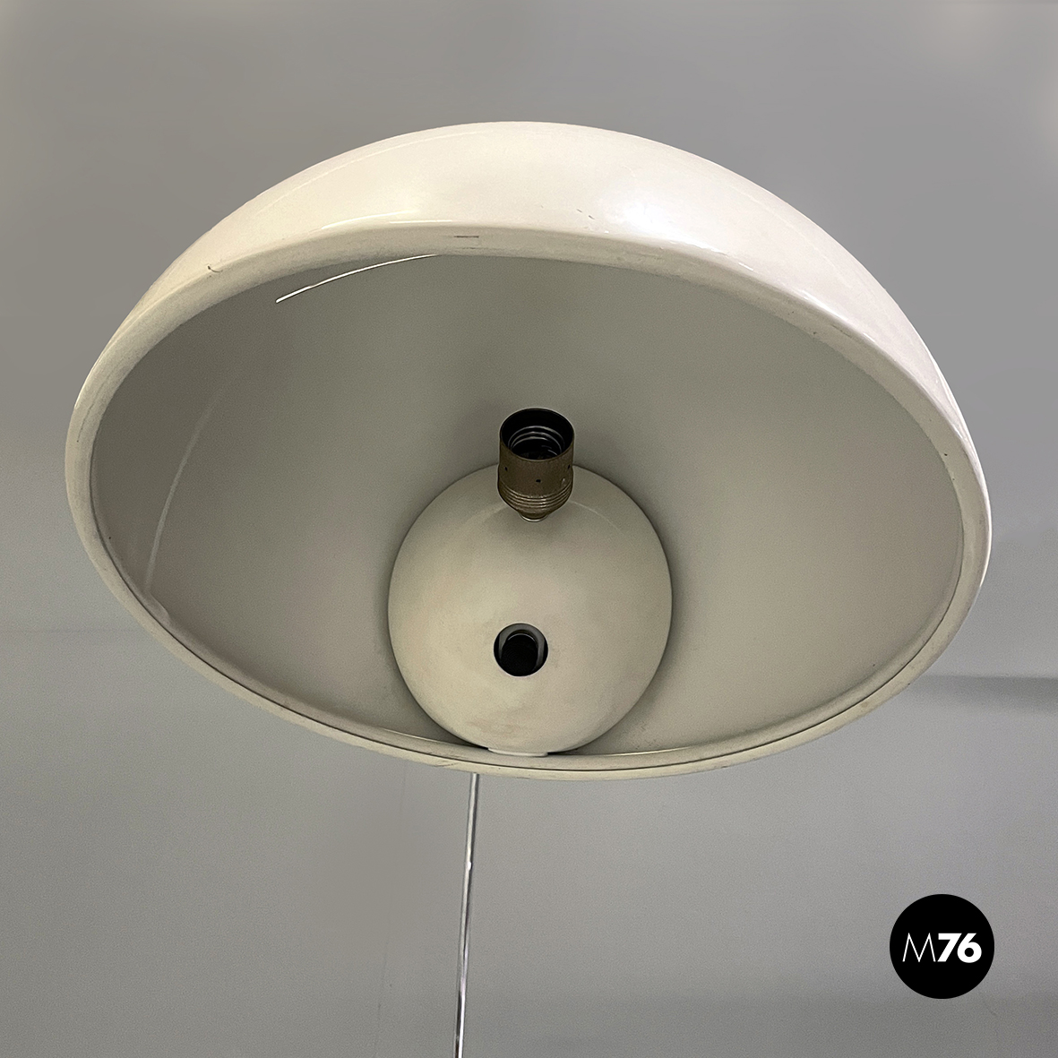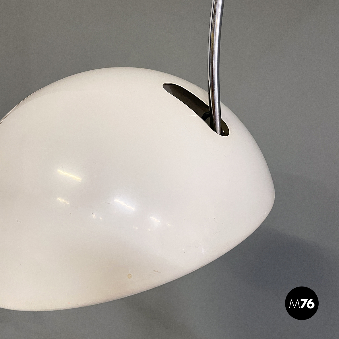 Lampada da parete modello Coupé 1159 con paralume orientabile a cupola in metallo laccato bianco. All’interno del paralume è presente l’interruttore di accensione. La struttura ad arco orientabile è in acciaio cromato mentre la base a forma di otto è in metallo laccato bianco. Alla base sono presenti due blocchi tondi in plastica nera che se sbloccati permetto alla struttura di scorrere.