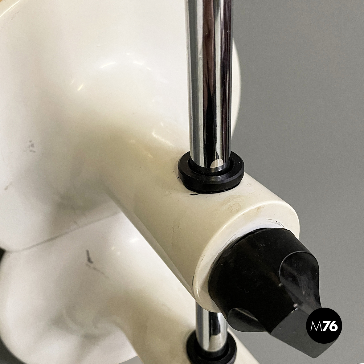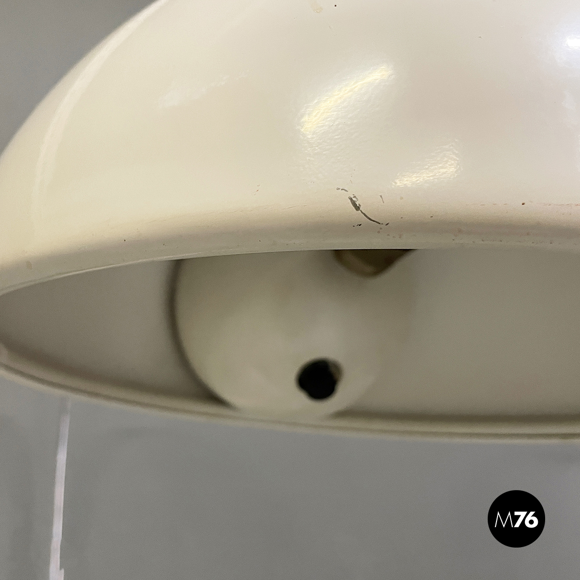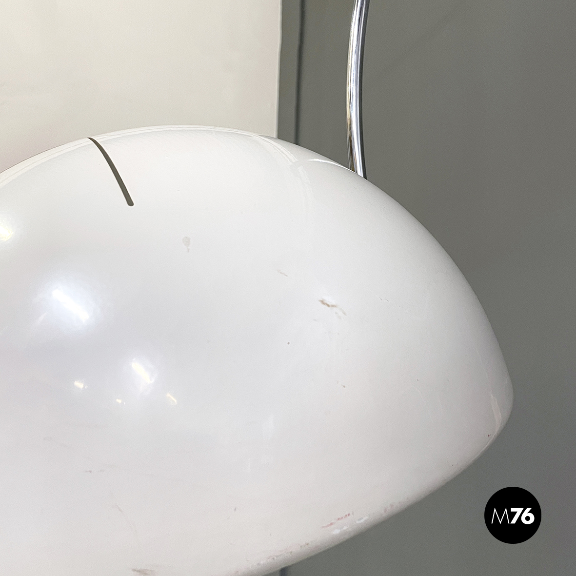 Buone condizioni. La lampada a braccio presenta segni sparsi e piccole mancanze di vernice sparse soprattutto sul profilo del paralume e alla base. L’acciaio presenta leggeri segni del tempo.