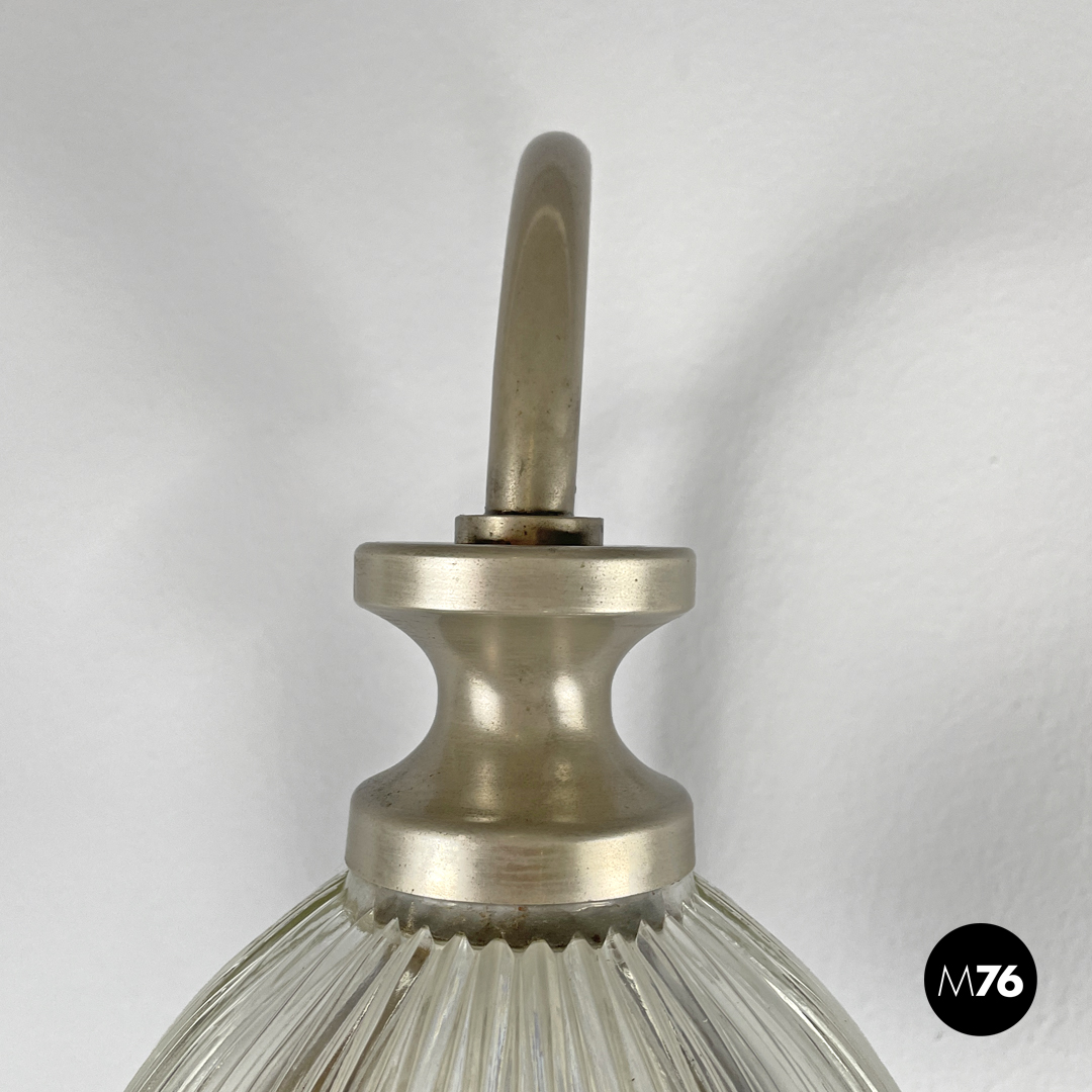 Lampada da parete o applique in metallo. Lo stelo regolabile allungato è in tubolare di metallo nella parte alta curva verso il basso dove si trova il punto luce con paralume in vetro stampato trasparente. L’attacco alla parete è rettangolare verticale.