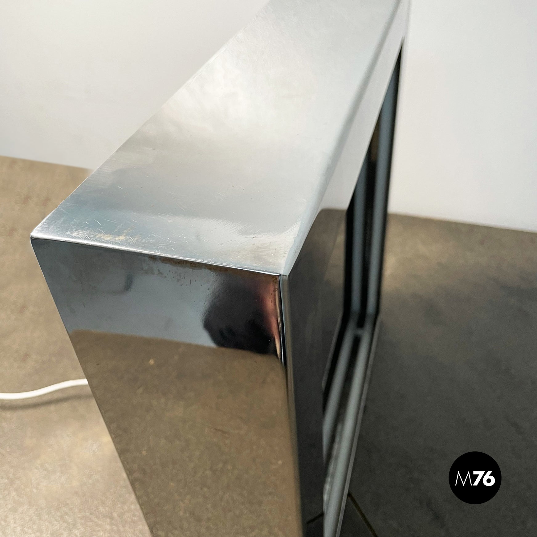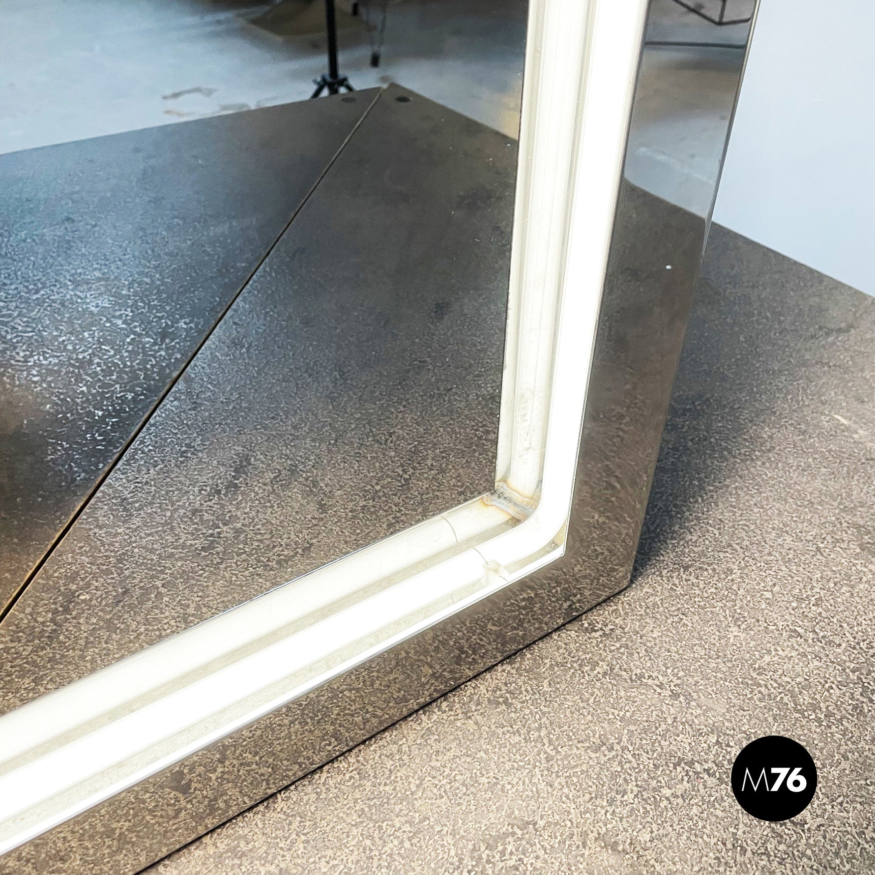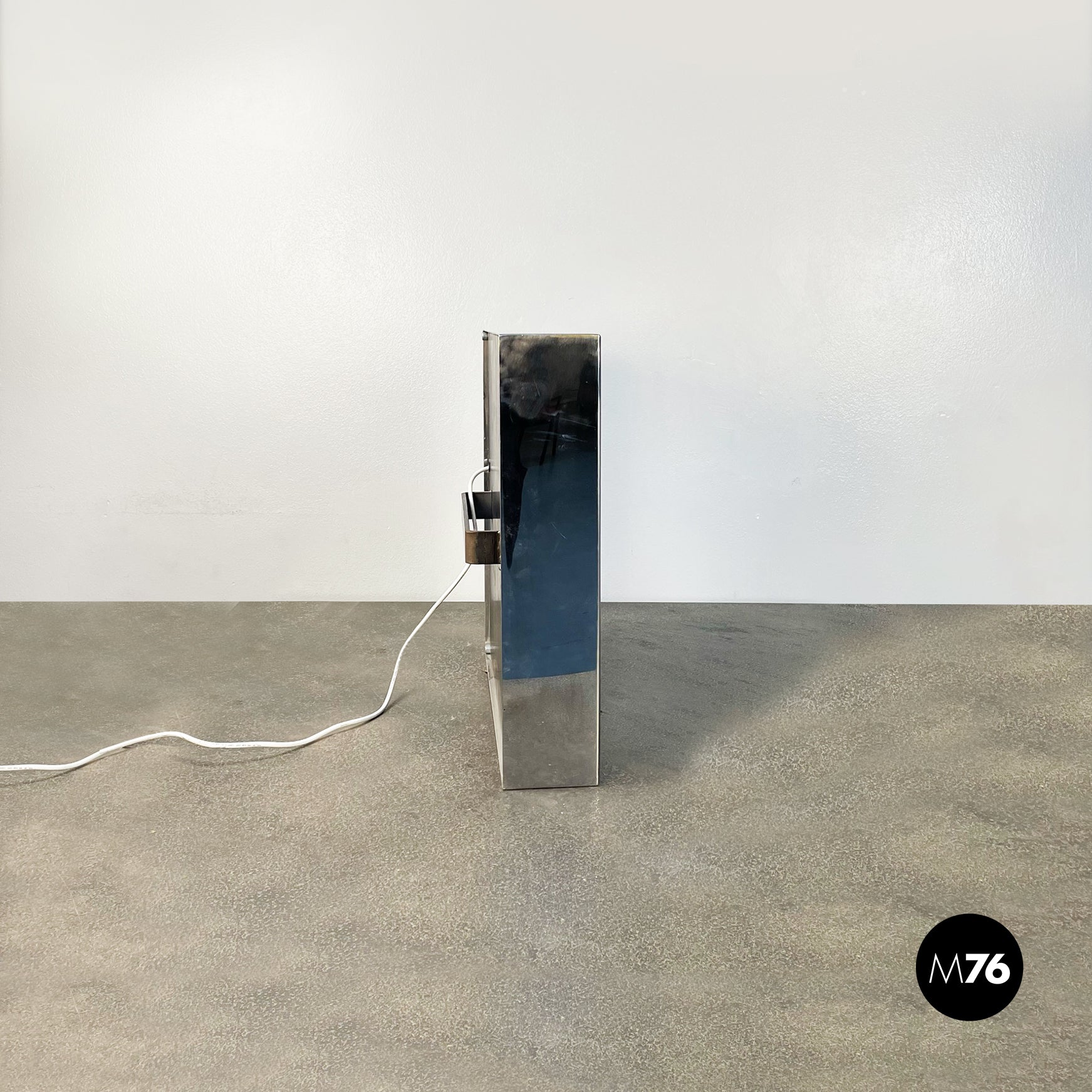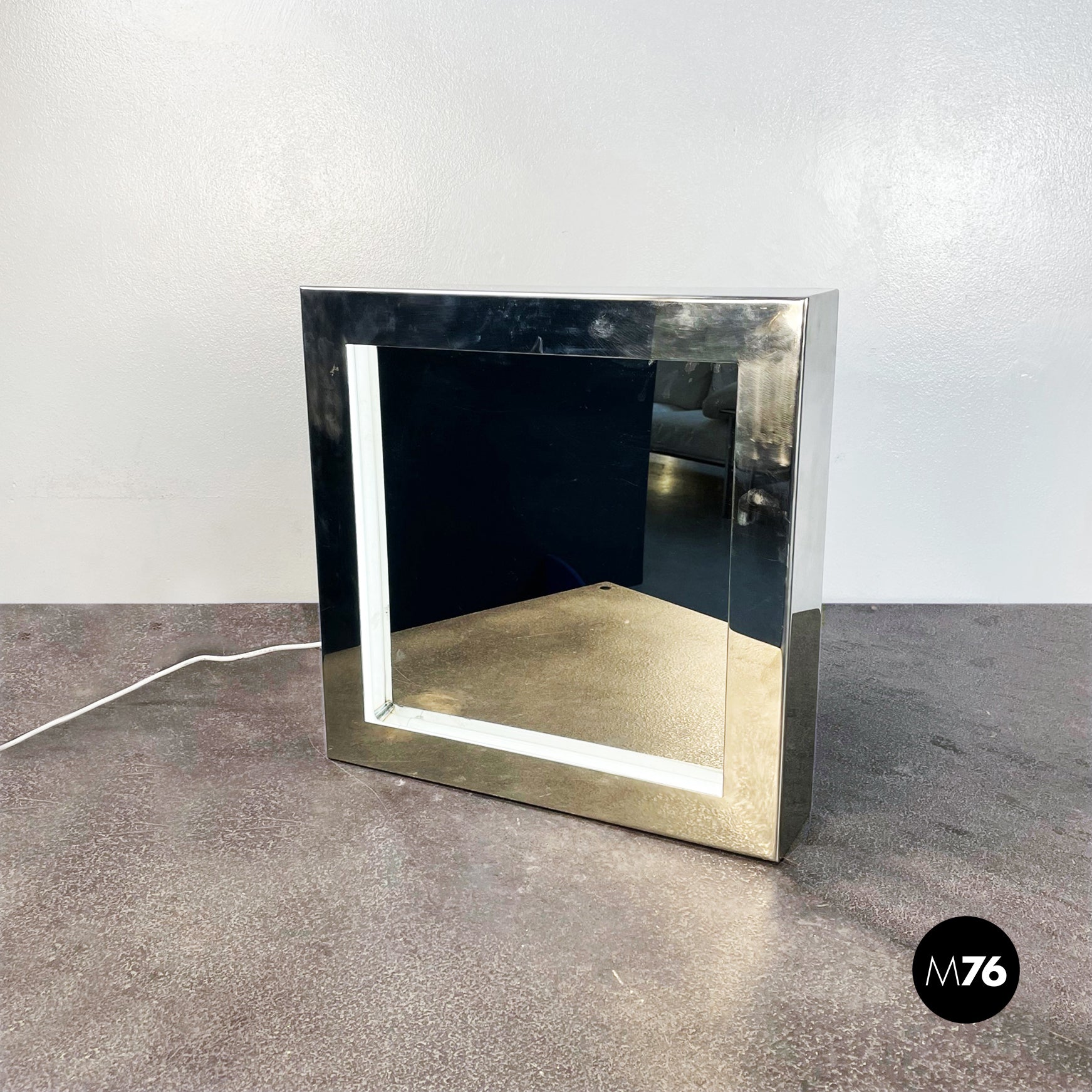 Lampada da parete o da tavolo modello Iceberg di forma quadrata in acciaio satinato con un neon bianco inserito nella struttura e parte frontale di forma quadrata specchiata.