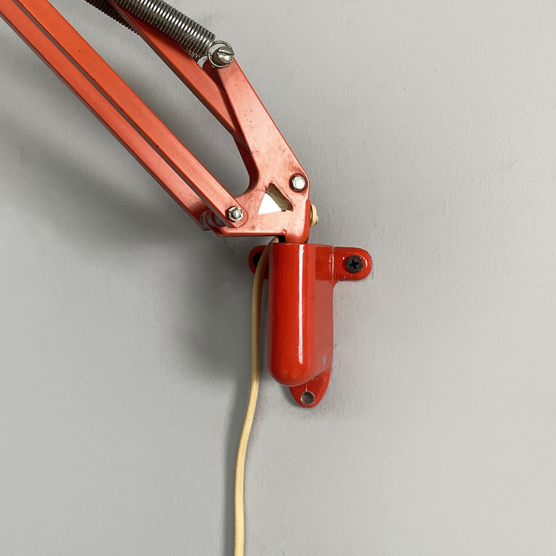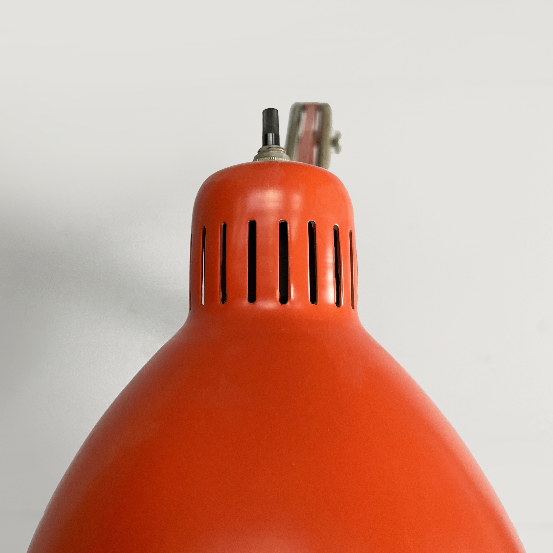 Lampada a braccio da parete modello Naska Loris in metallo. Il paralume orientabile di forma conica è in metallo rosso-arancione esternamente e bianco interamente. Nella parte superiore del paralume presenta l’interruttore nero. La struttura è composta da due bracci orientabili in metallo rosso- arancione, composti da due listelli a sezione rettangolare. Attacco a parete in metallo rosso-arancione.