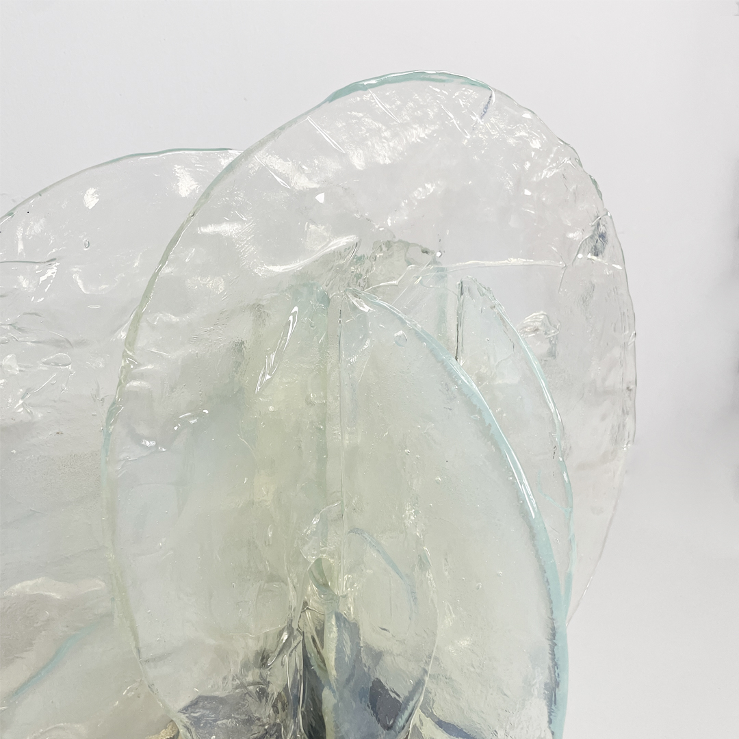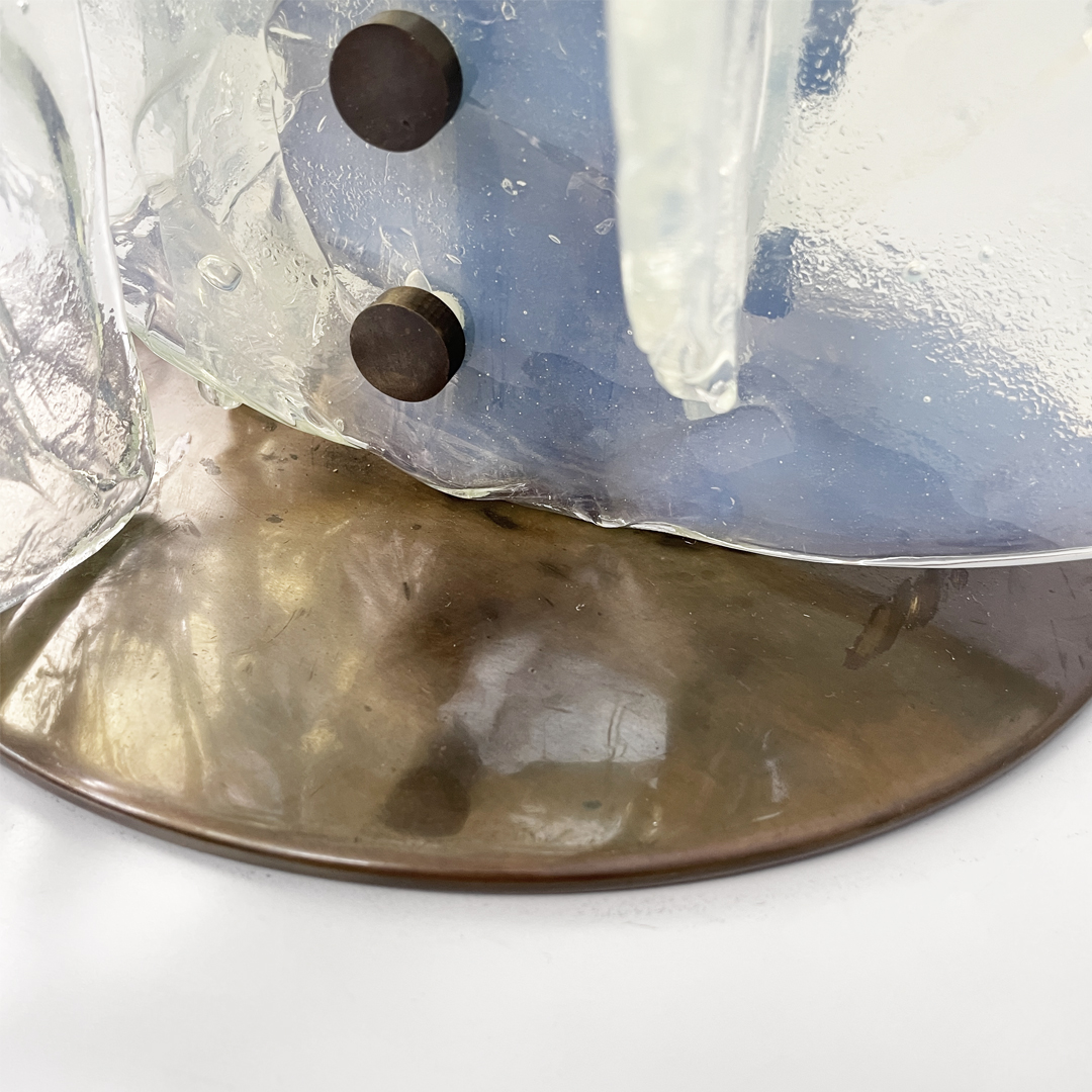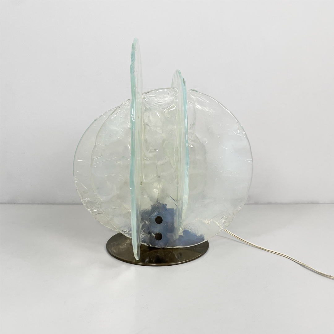 Lampada da tavolo modello 335 con base in rame spazzolato. La struttura è composta da dischi in vetro di Murano, perfettamente combinati tra loro. I vetri pulegosi si incastrano grazie alle scanalature presenti.