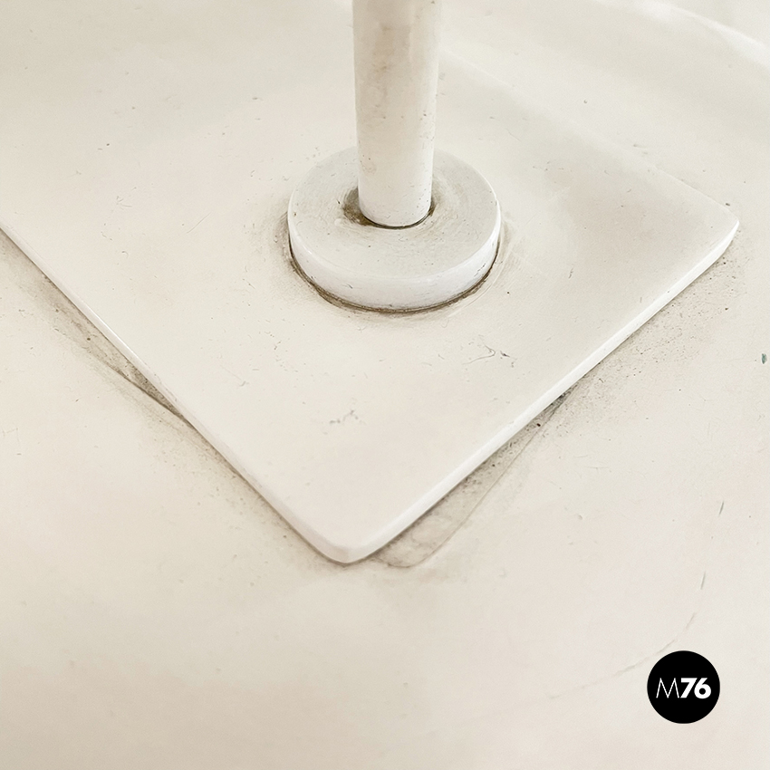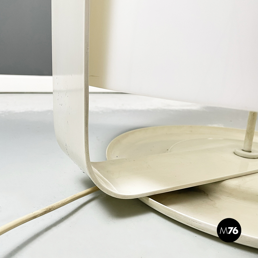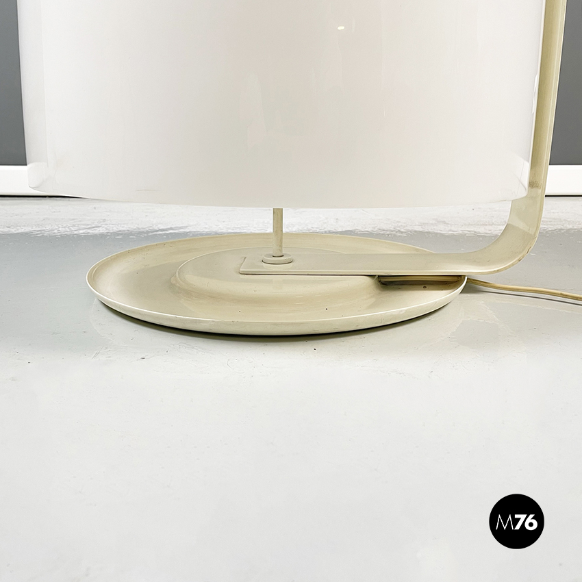 Lampada da tavolo modello Alvise con base tonda in metallo verniciato bianco-beige. Il paralume cilindrico con gli angoli arrotondati in plastica acrilica bianca è a tre luci. Il paralume è sorretto esternamente da una striscia di metallo la quale segue la silhouette del paralume e internamente da un’asta di metallo. Questa struttura poi si ricongiunge alla base.