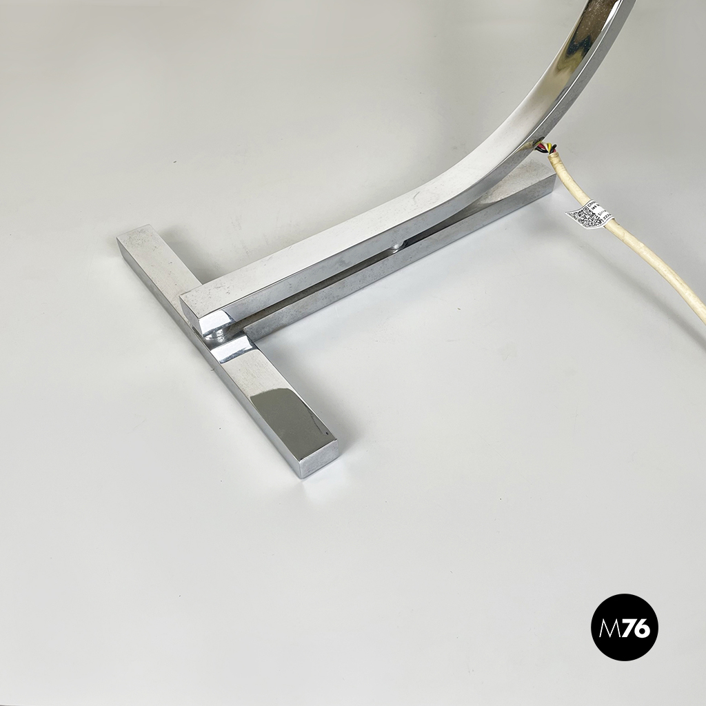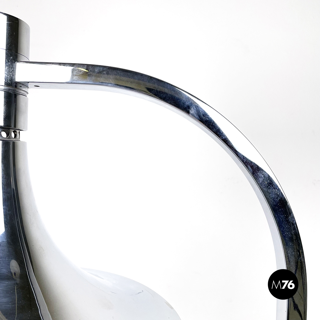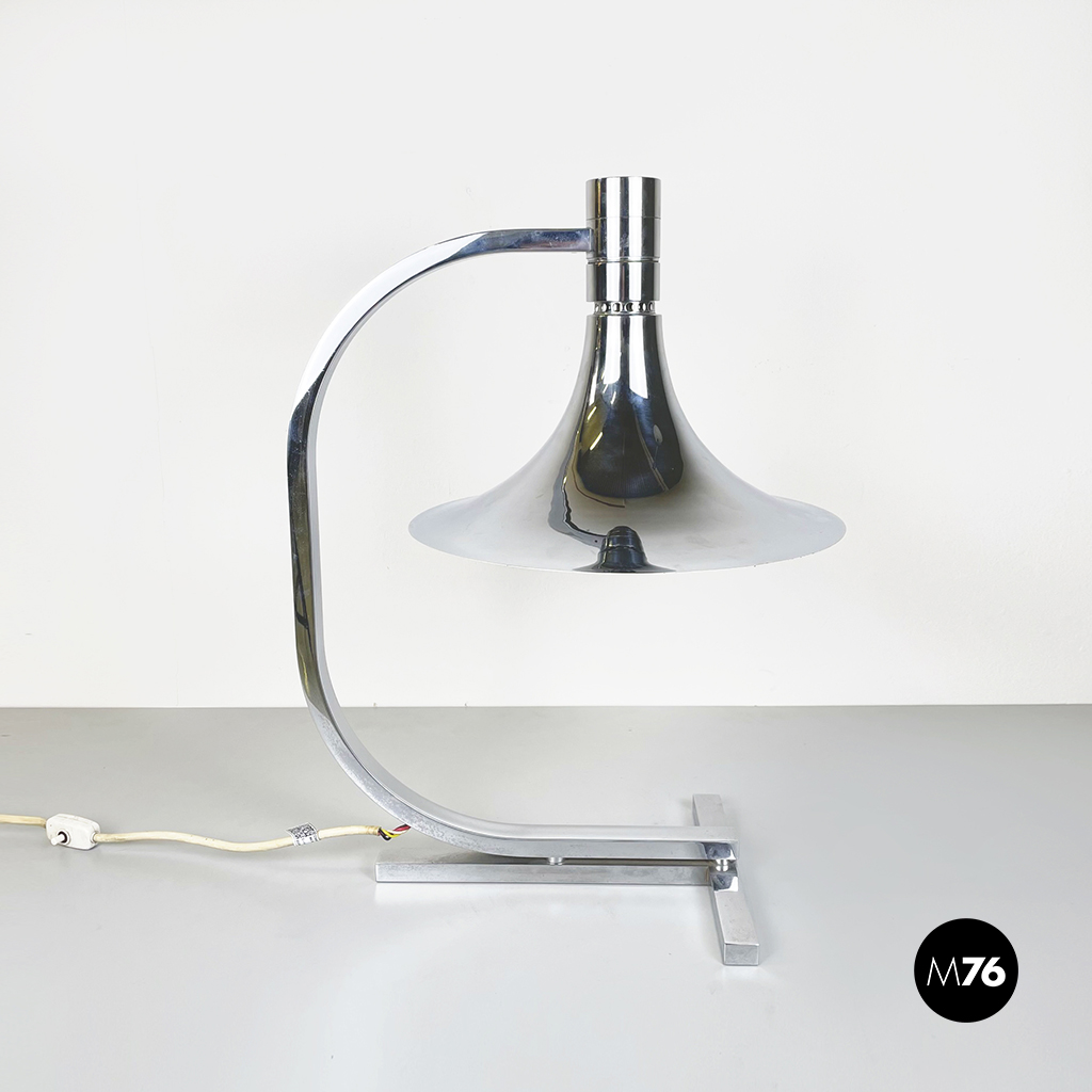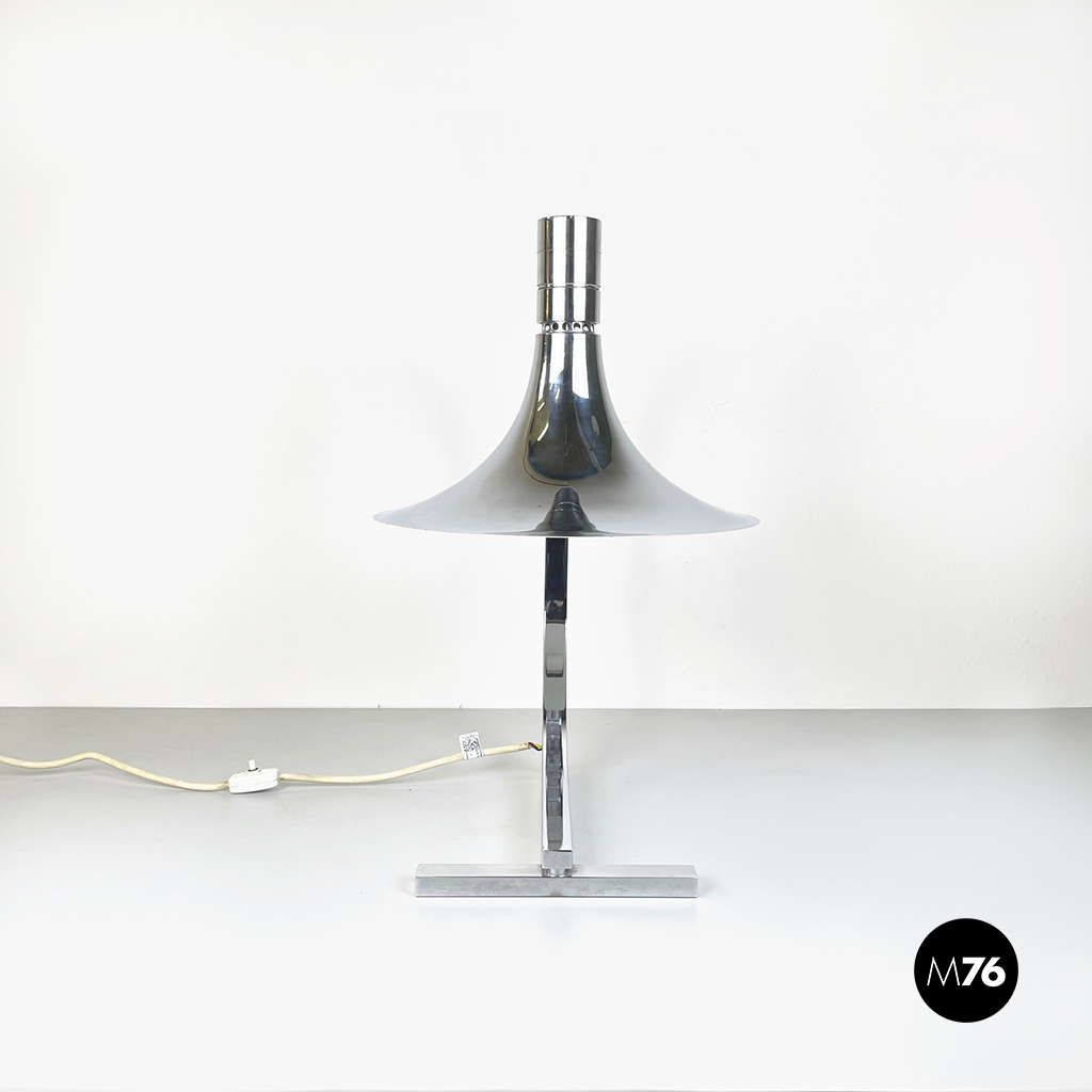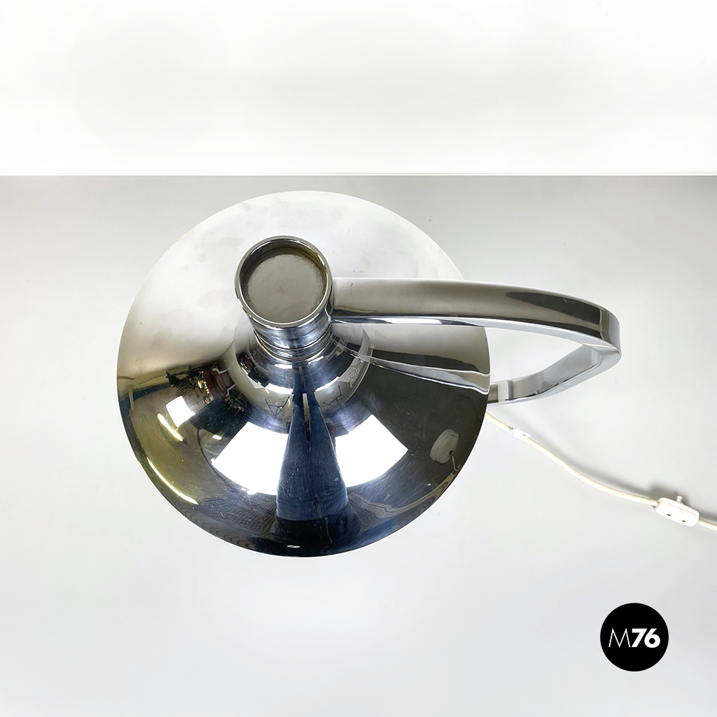 Lampada da tavolo appartenente alla serie AM/AS con struttura e paralume interamente in acciaio cromato. Il paralume a base tonda è esternamente in acciaio cromato e internamente in acciaio smaltato bianco. La struttura è composta da un braccio ricurvo a sezione quadrata. Questa serie di lampade presentano la particolarità di poter intercambiare il paralume con qualunque altro della stessa serie.