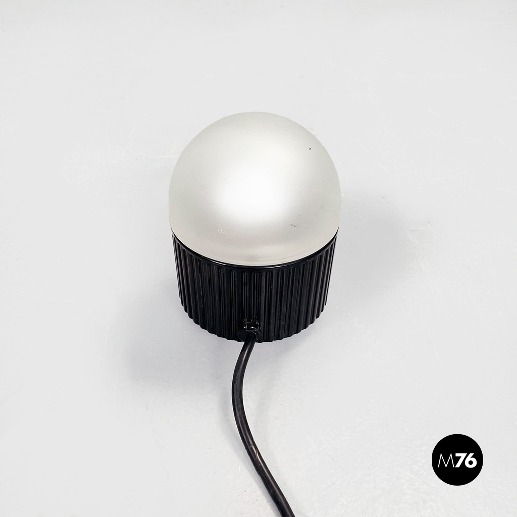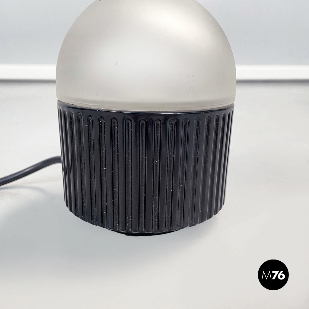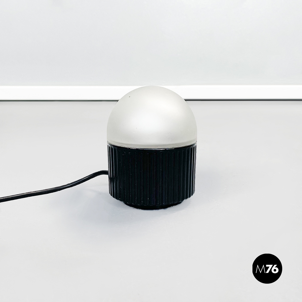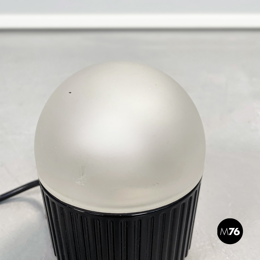 Lampada da tavolo modello Bulbo a base tonda in alluminio verniciato nero e vetro opalino. Il paralume in vetro è semisferico. La base in metallo è di forma cilindrica.