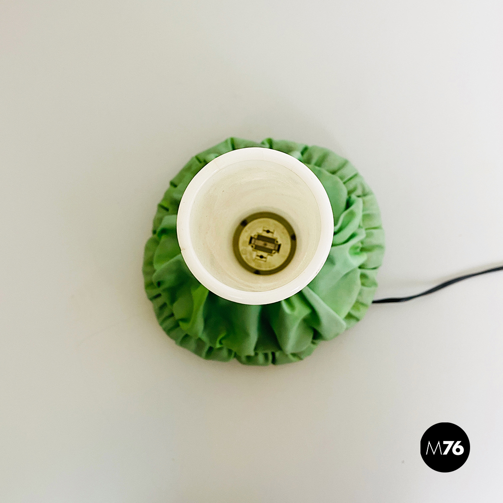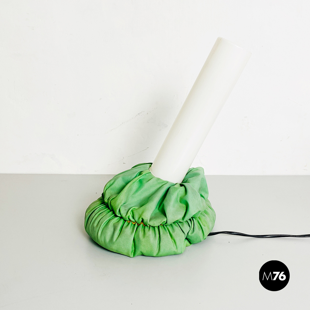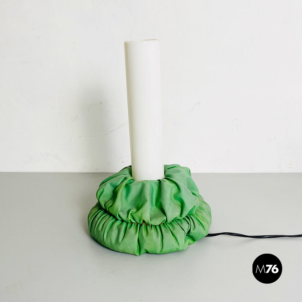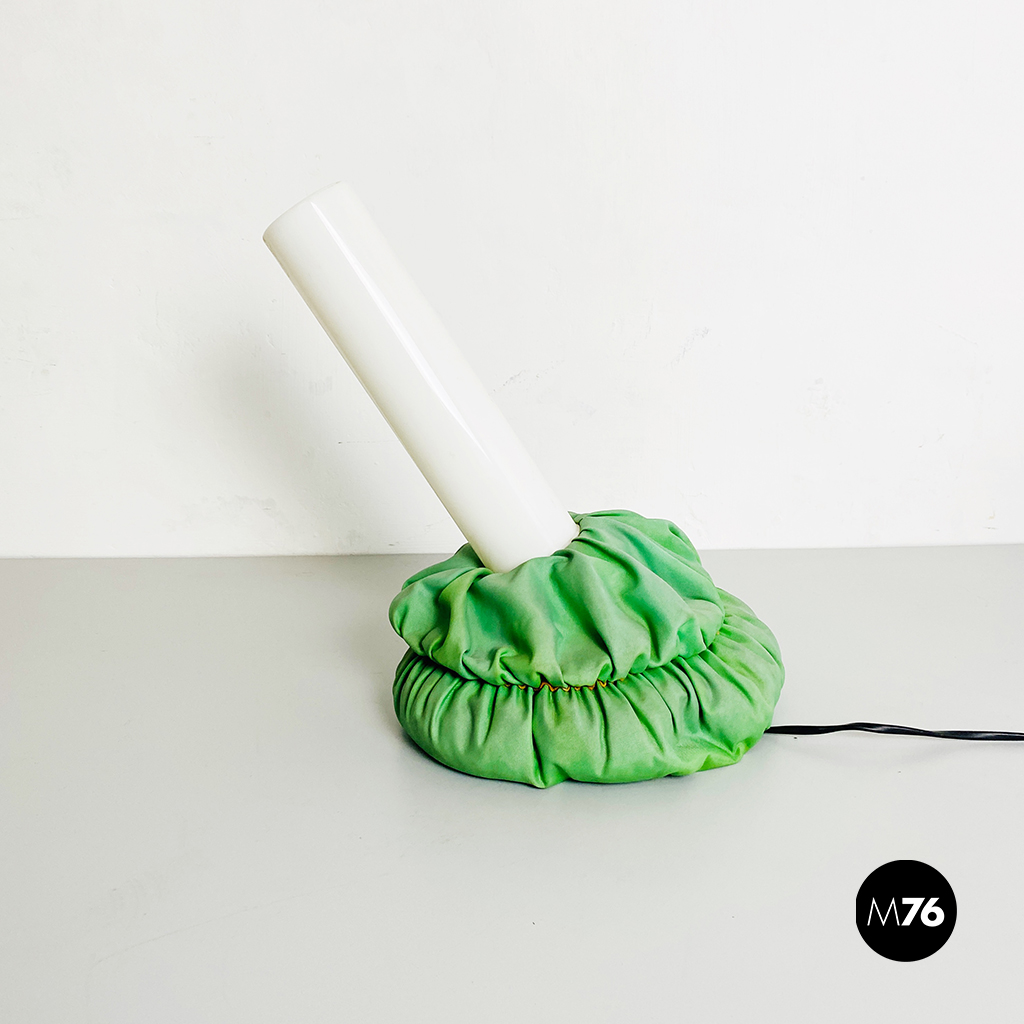 Lampada da tavolo modello Cloche con diffusore in plastica orientabile e base in tessuto verde.
