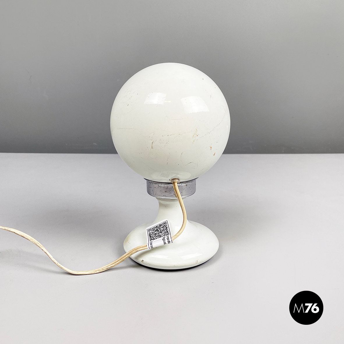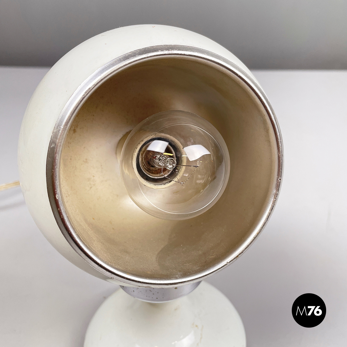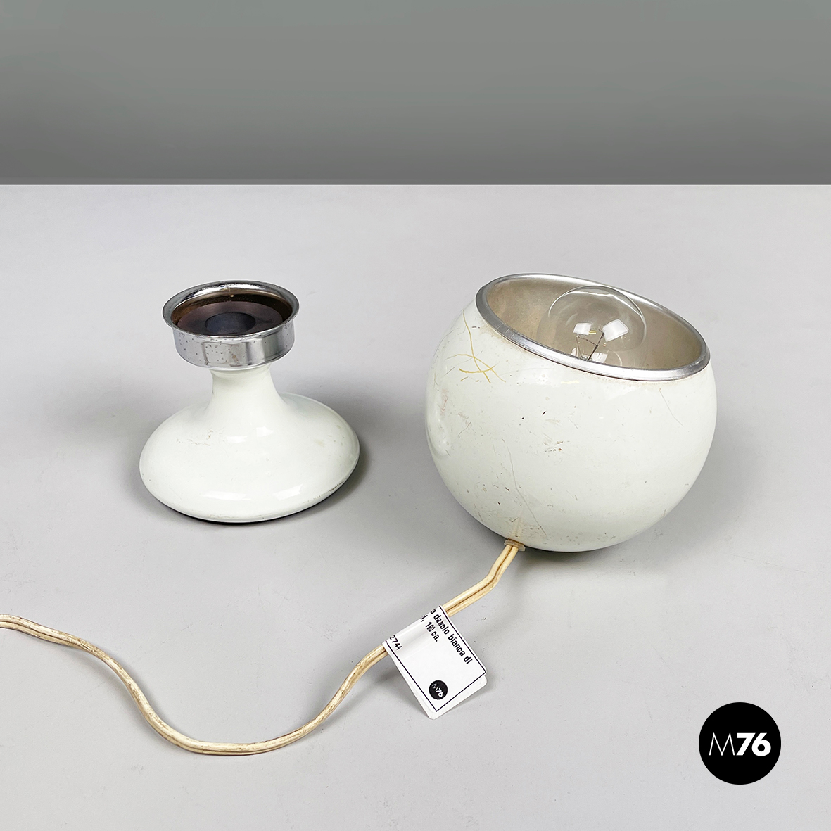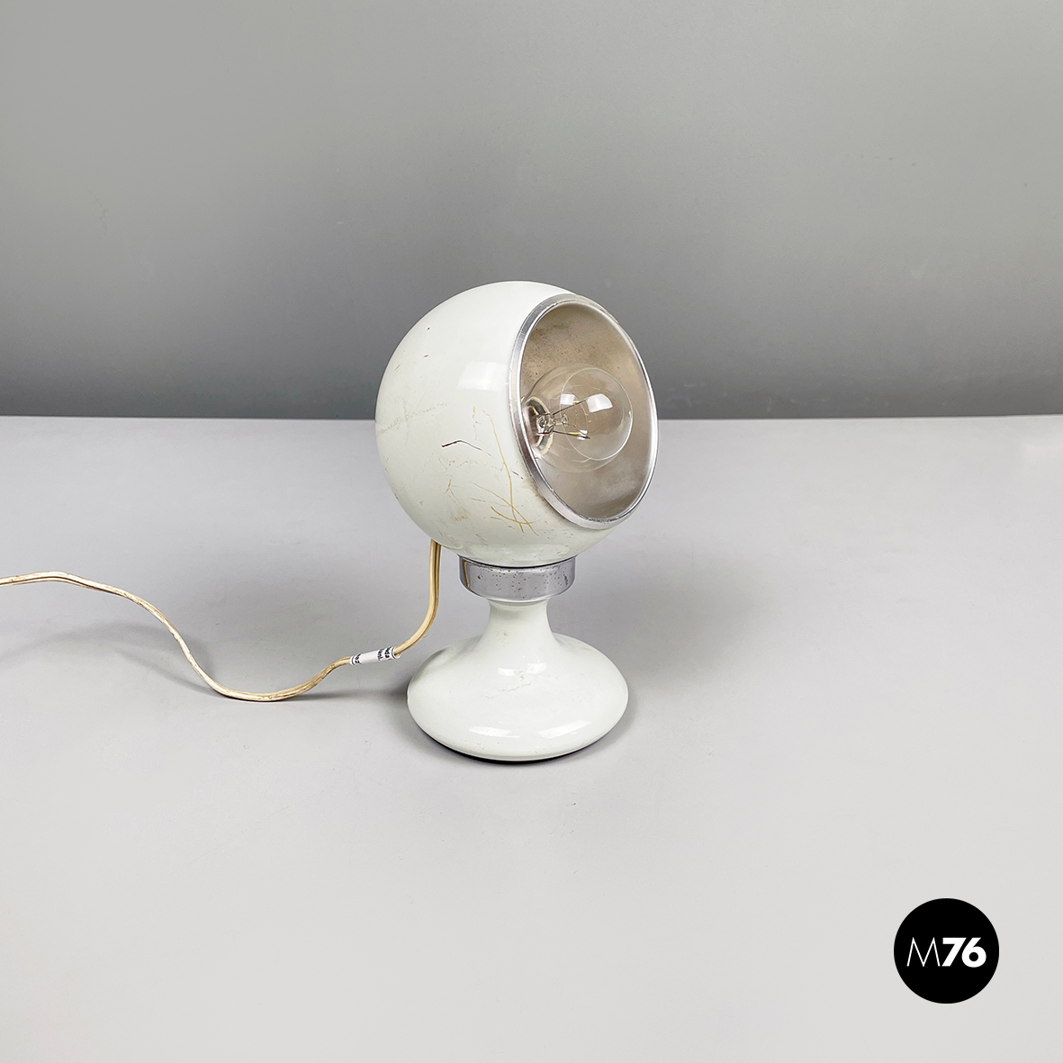 Lampada da tavolo orientabile a base tonda in acciaio e metallo verniciato bianco. Il diffusori semi-sferico è unito alla struttura attraverso un attacco magnetico il quale gli permette di essere posizionate come si preferisce. La struttura si assottiglia al centro e si allarga verso la base.