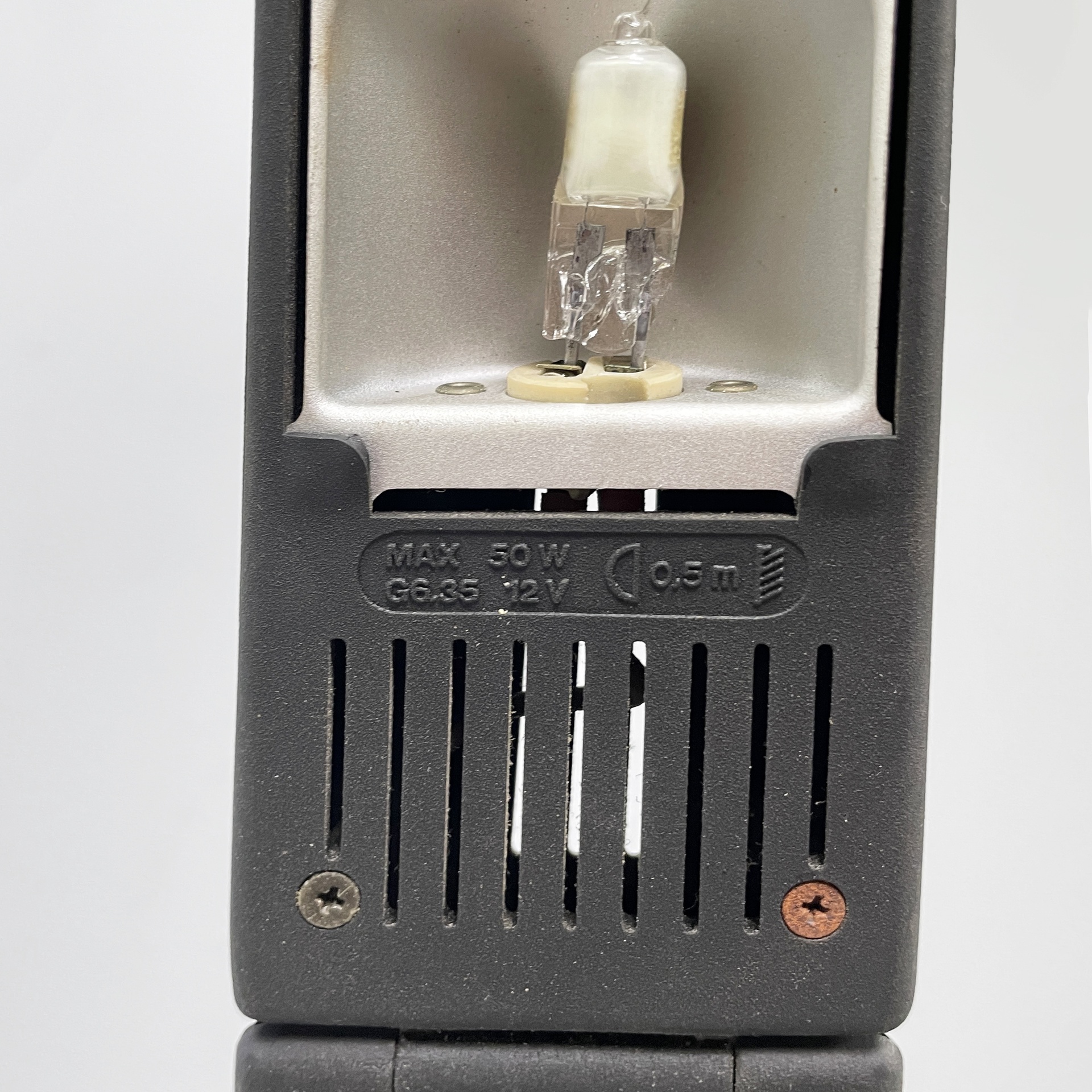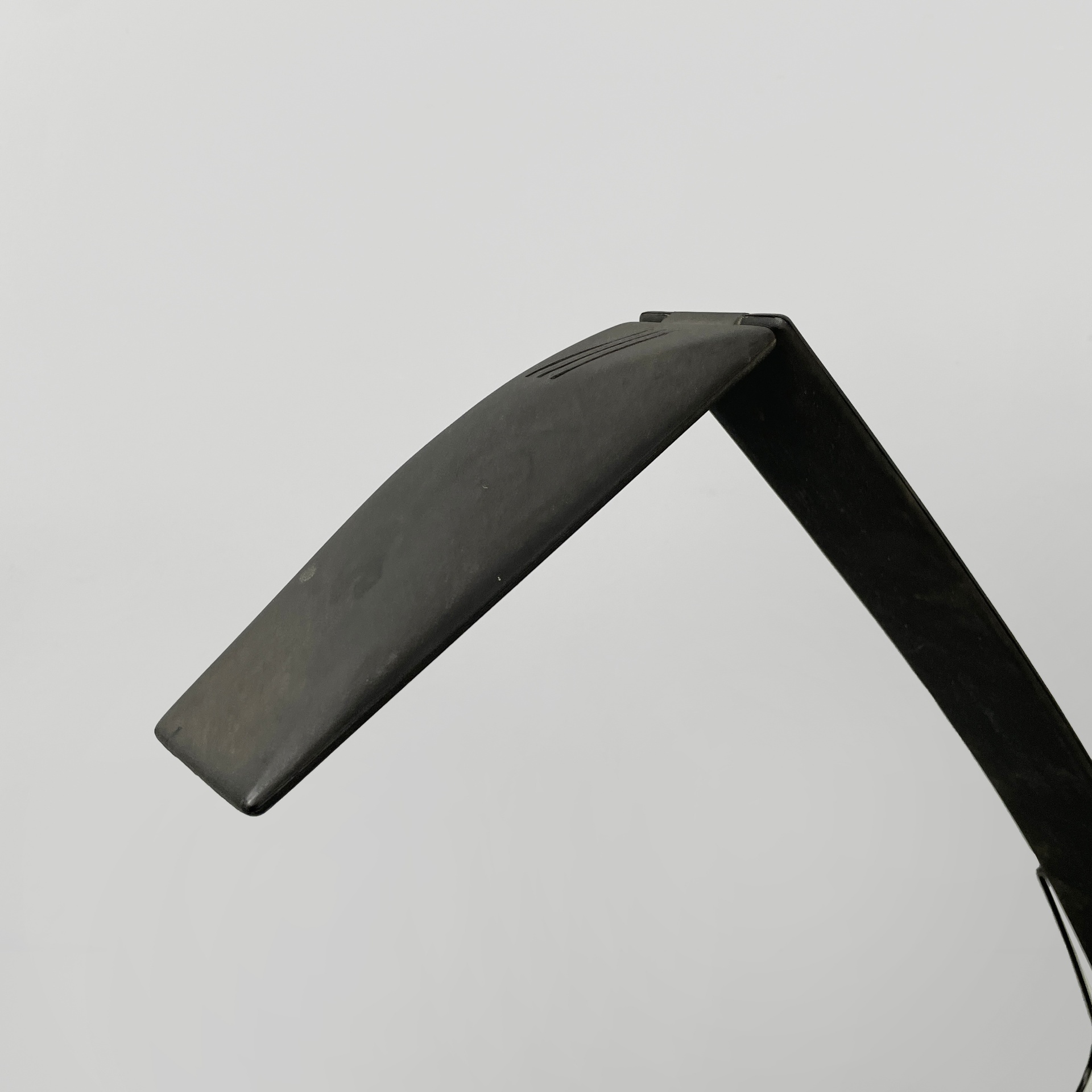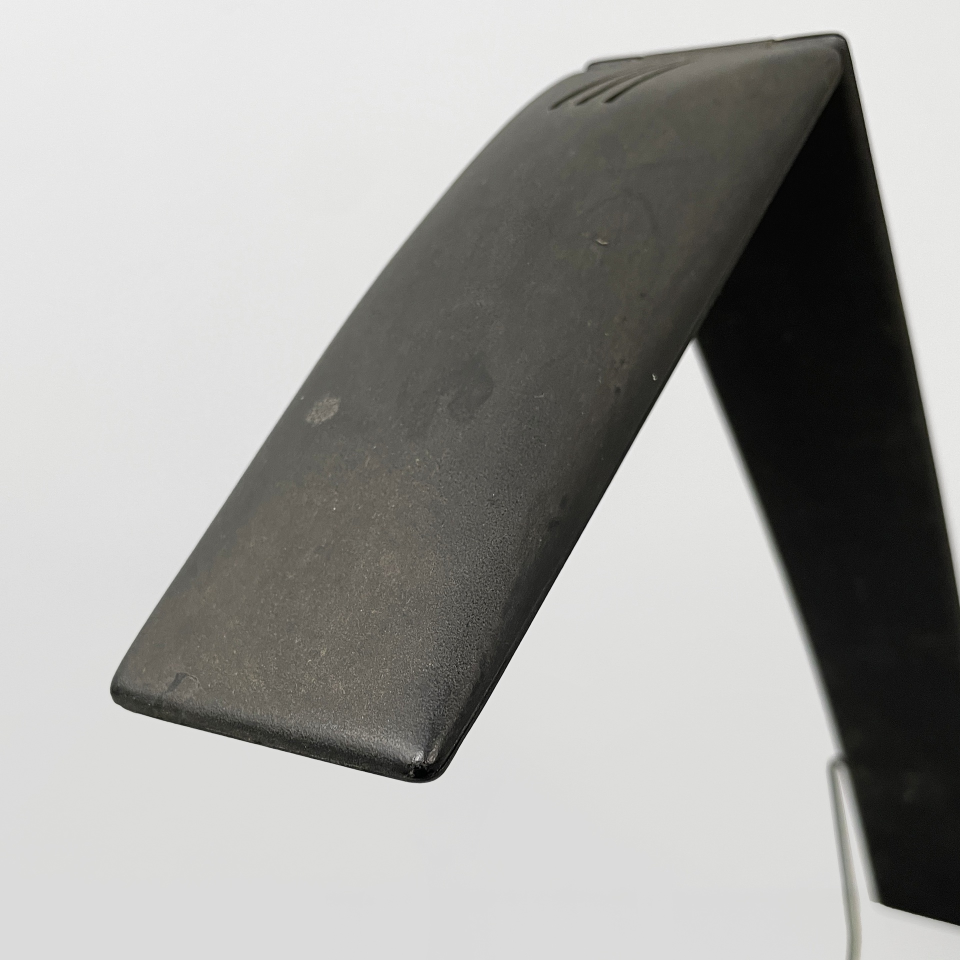 Lampada da tavolo orientabile modello Dove in metallo nero e plastica nera-grigio scuro. Il diffusore e la struttura a braccio sono composti da due listelli in plastica sottili, sostenuti da due tondini di metallo. La base tonda in plastica nera presenta l’interruttore. La lampada ha due gradi di intensità luminosa. La lampada presenta lampadina alogena.