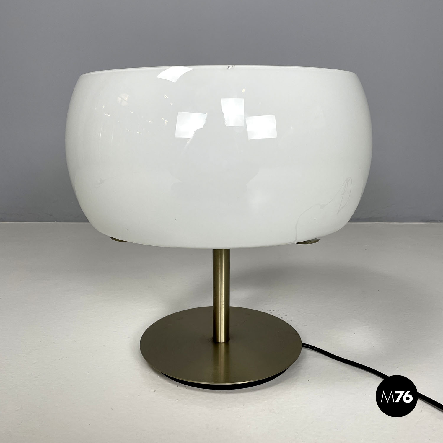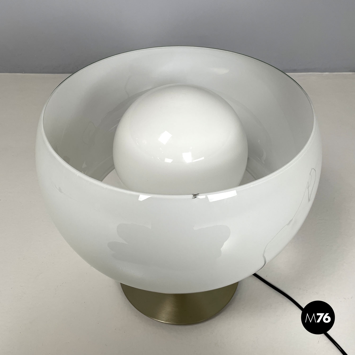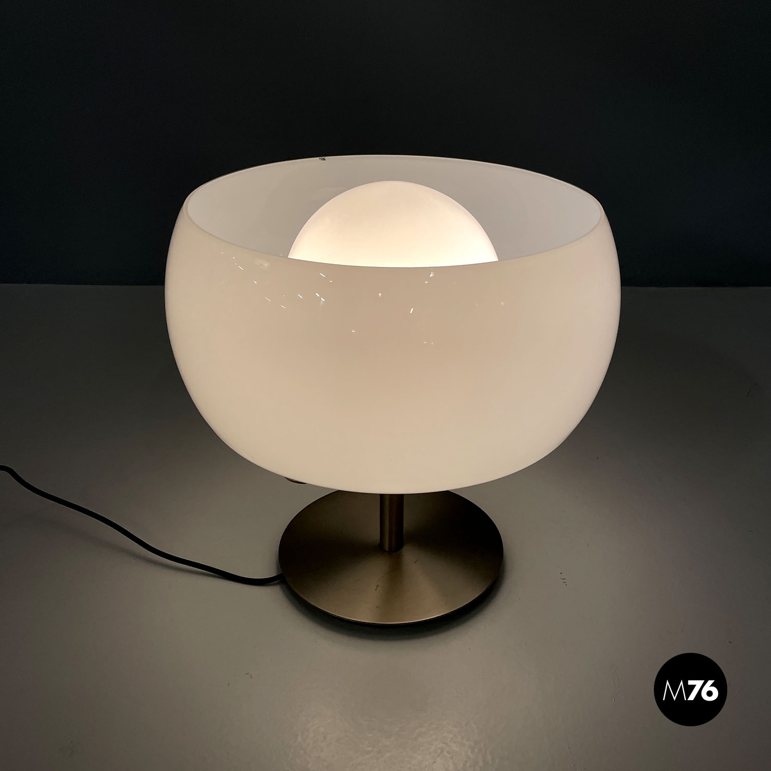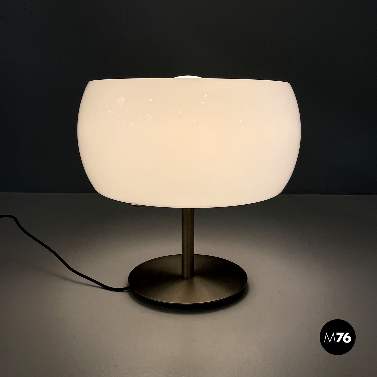 Lampada da tavolo modello Erse a base tonda. La struttura è composta dalla base e da uno stelo centrale che sono in metallo nichelato di colore bronzato. Il paralume è tondo in vetro opalino bianco lucido con una sfera interna di diametro inferiore.