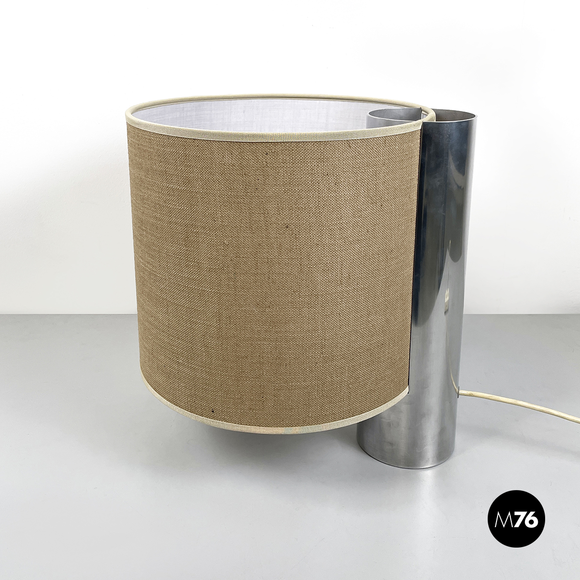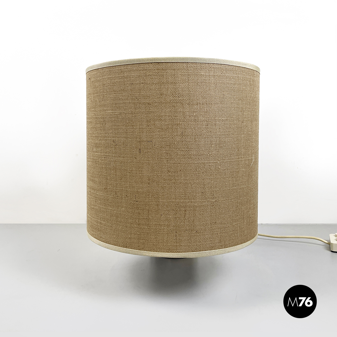 Lampada da tavolo modello Fluette con doppia lampadina e paralume cilindrico in tessuto beige con passamaneria sui profili. La struttura cilindrica in metallo è posizionata lungo il profilo. Presenta un interruttore con doppio pulsante infatti le due lampadine hanno accensione indipendente.