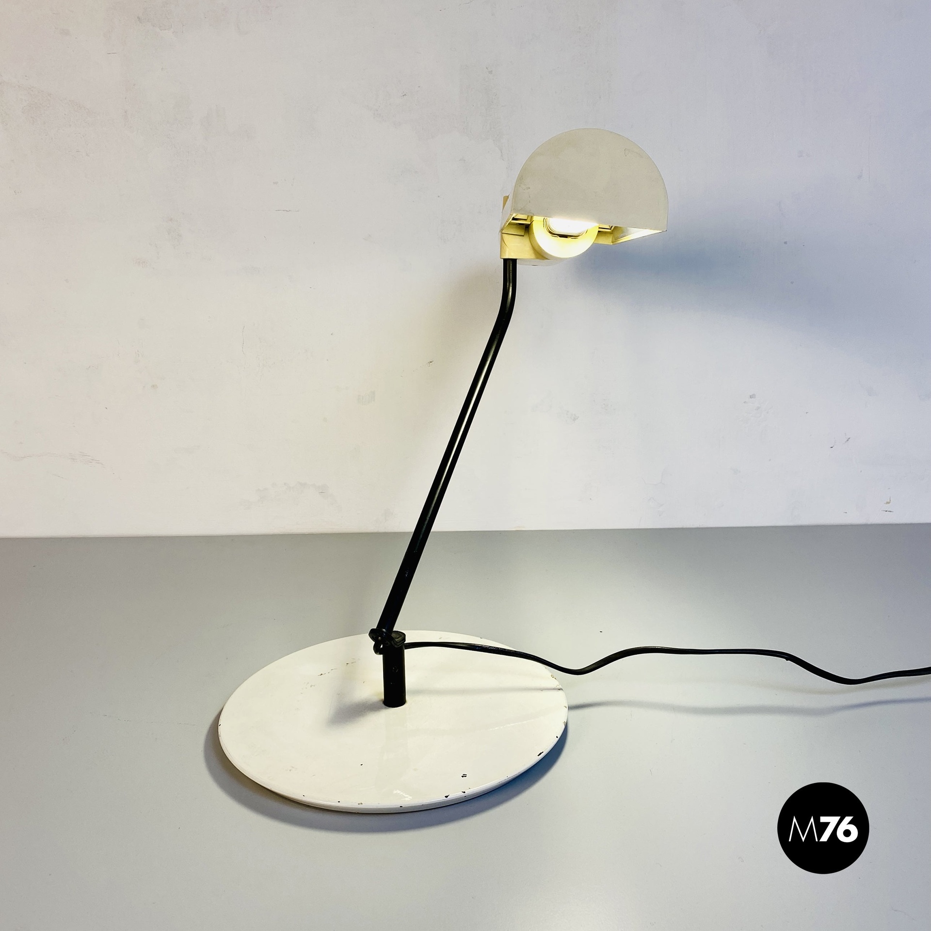 Lampada da tavolo direzionabile con base tonda in metallo e paralume in plastica bianca orientabile.