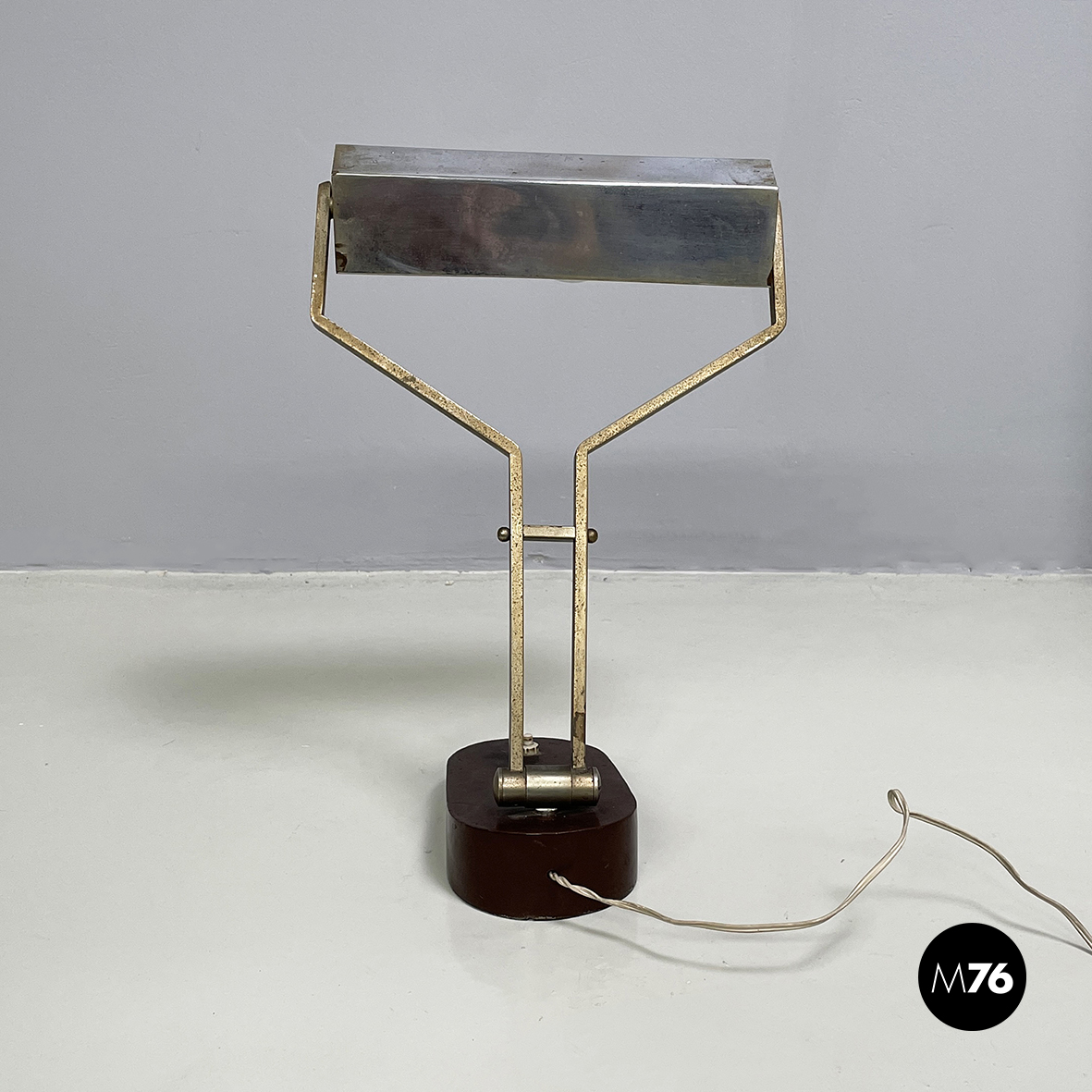 Lampada da tavolo o da scrivania ministero con base ovale in metallo verniciato marrone. Il paralume a base rettangolare in metallo è orientabile. La struttura orientabile è composta da listelli in metallo a sezione squadrata. Interruttore sulla base.