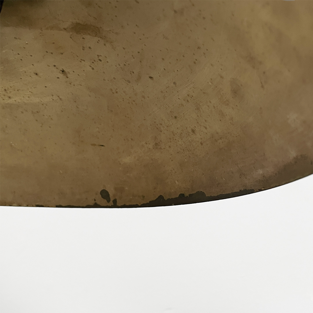 Lampada da tavolo a base tonda. L’ampio paralume tondeggiante è in ottone ed è sorretto da tre braccia.