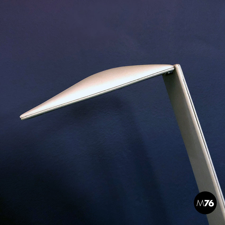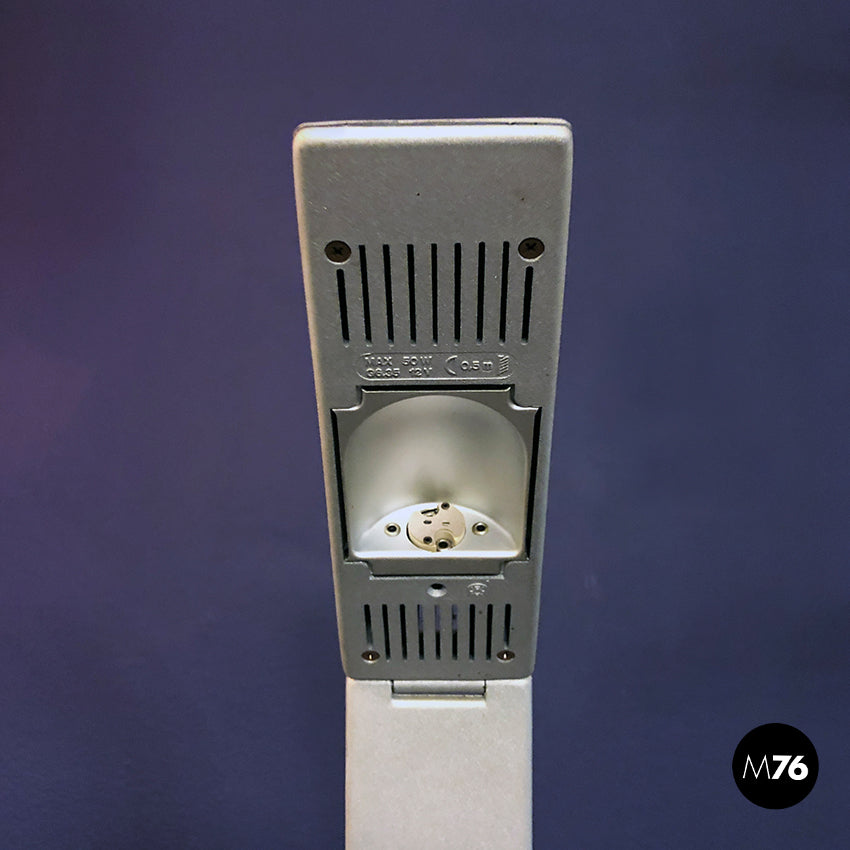 Lampada da tavolo regolabile con struttura in plastica e snodi in metallo.