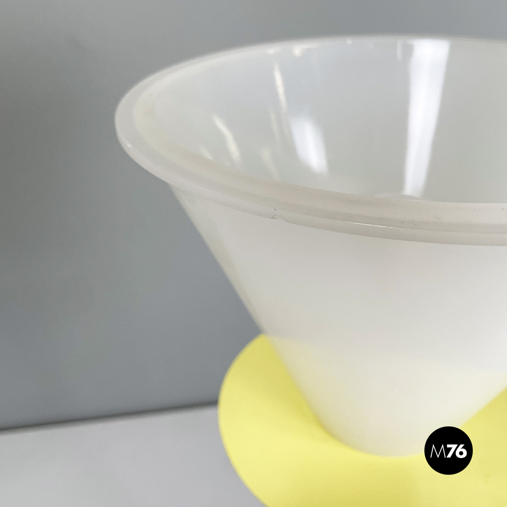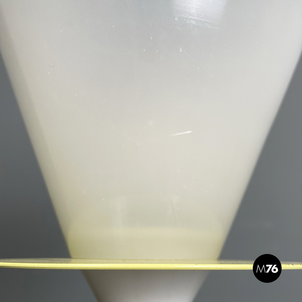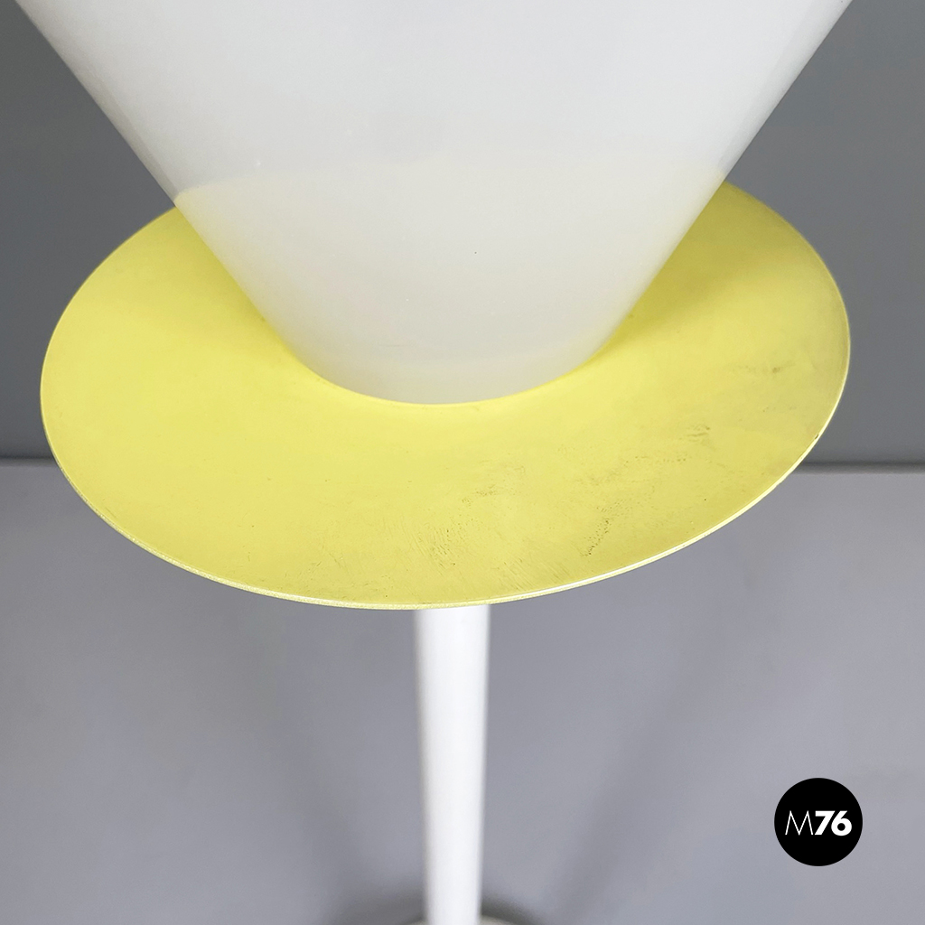 Lampada da tavolo con paralume e base tonda in vetro di Murano bianco e struttura in metallo smaltato bianco con disco di colore giallo giallo.