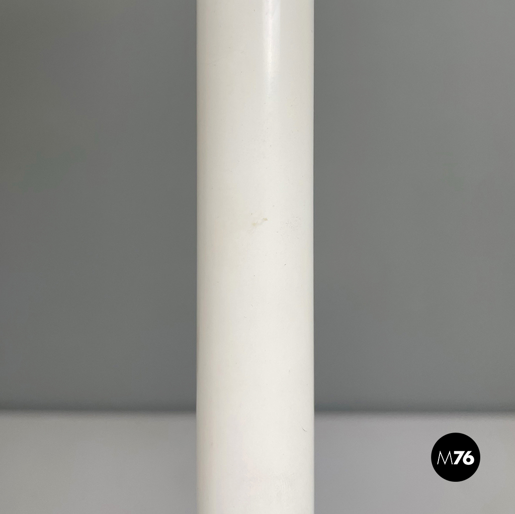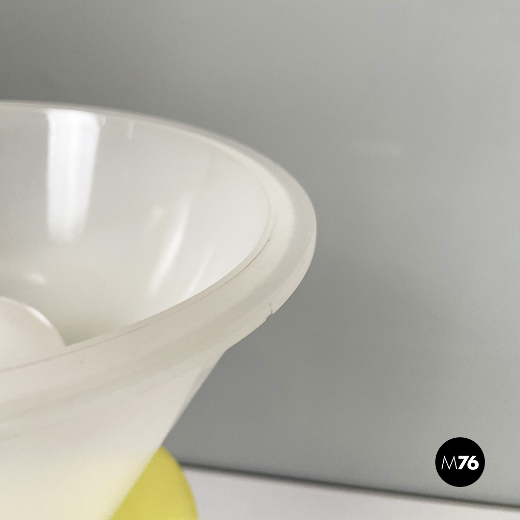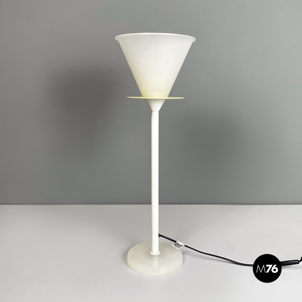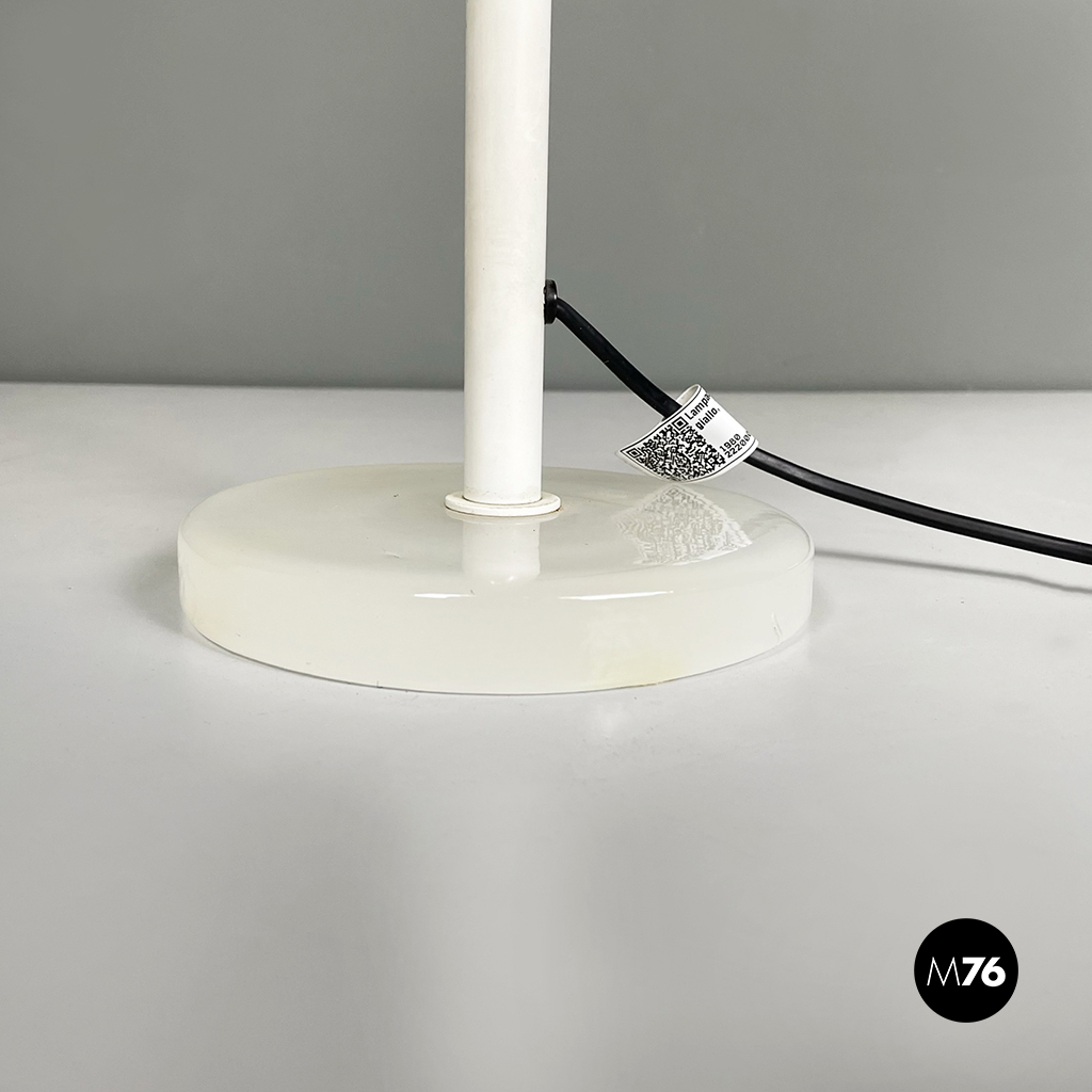 Lampada da tavolo con paralume e base tonda in vetro di Murano bianco e struttura in metallo smaltato bianco con disco di colore giallo giallo.
