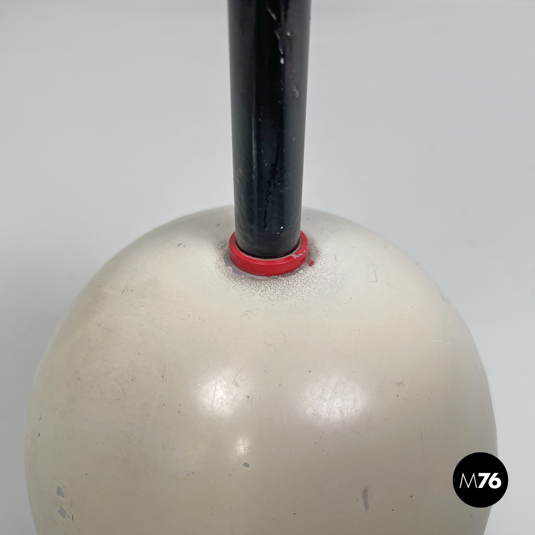 Lampada da tavolo con paralume tondo è in vetro trasparente. Sopra la lampadina è presente una lastra tonda in metallo verniciato bianco utilizzabile per direzionare la luce sostenuta da due tondini di metallo nero. La struttura in tondino di metallo nera si collega alla base a cupola in metallo bianco con dettagli in plastica rossa.
