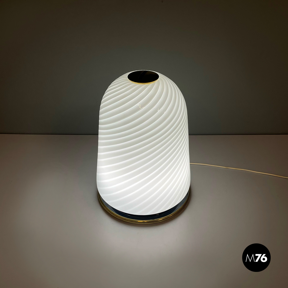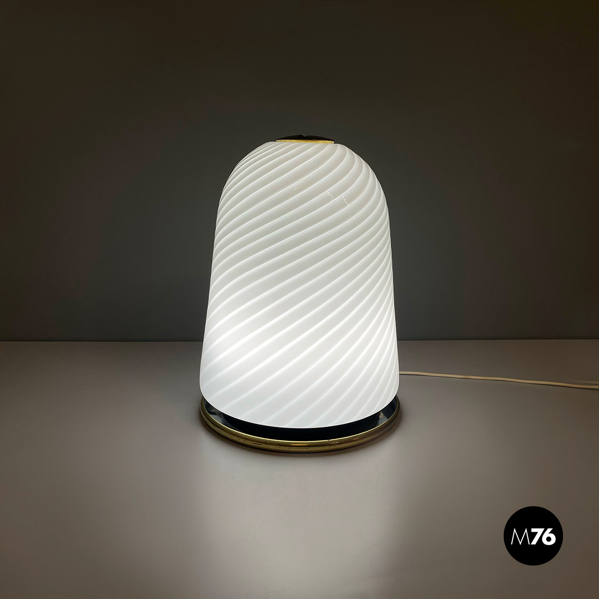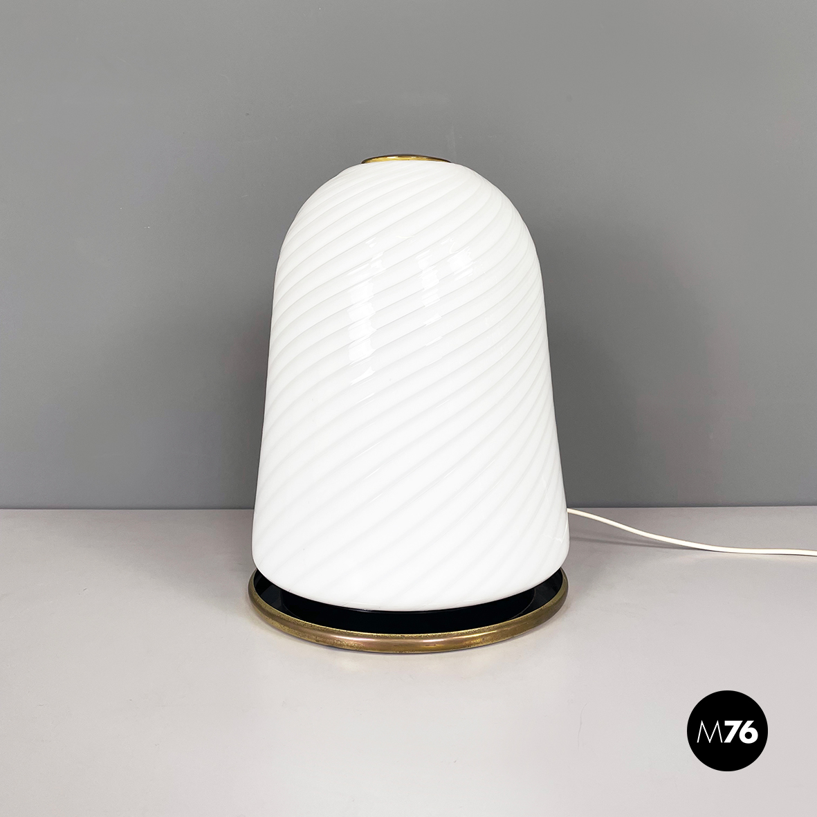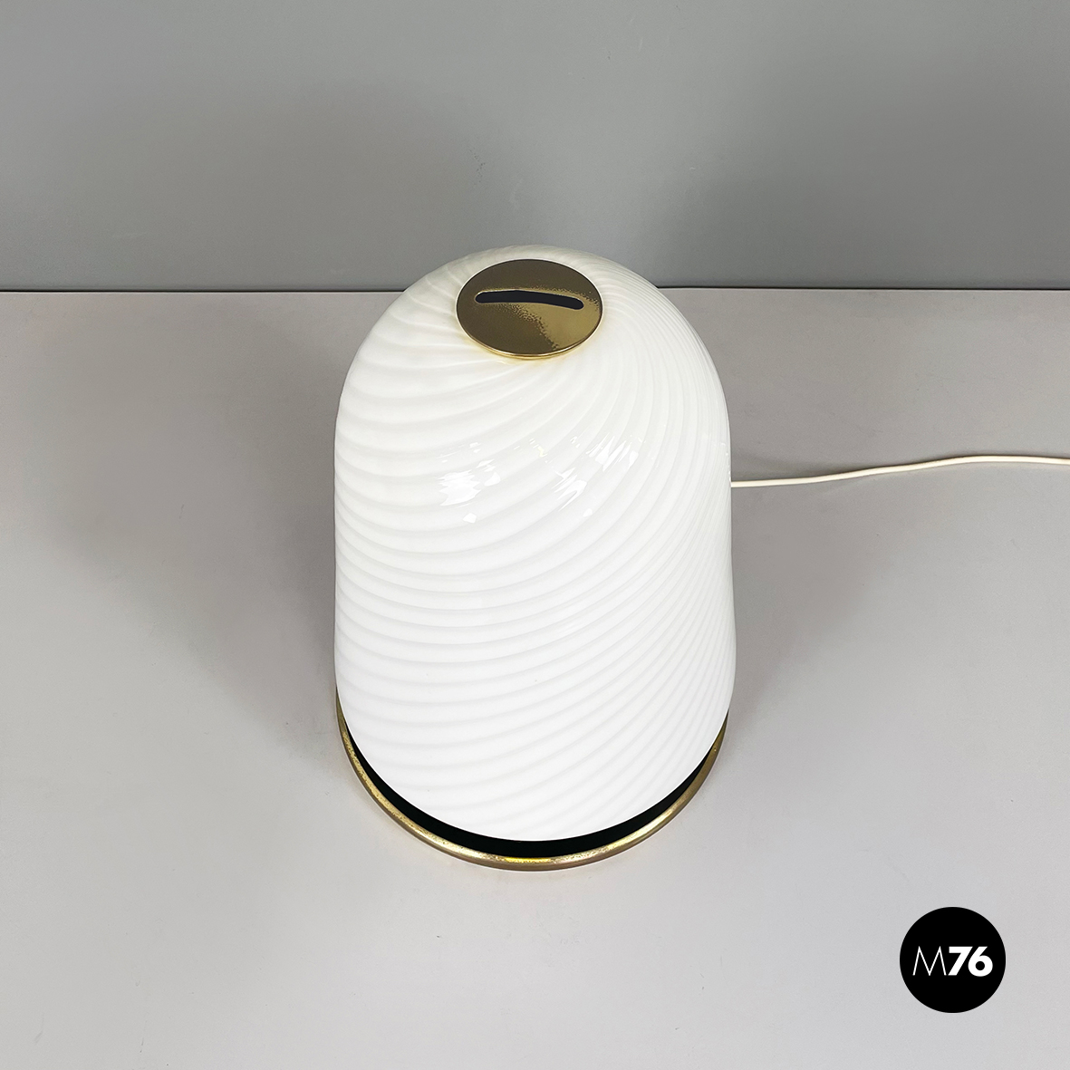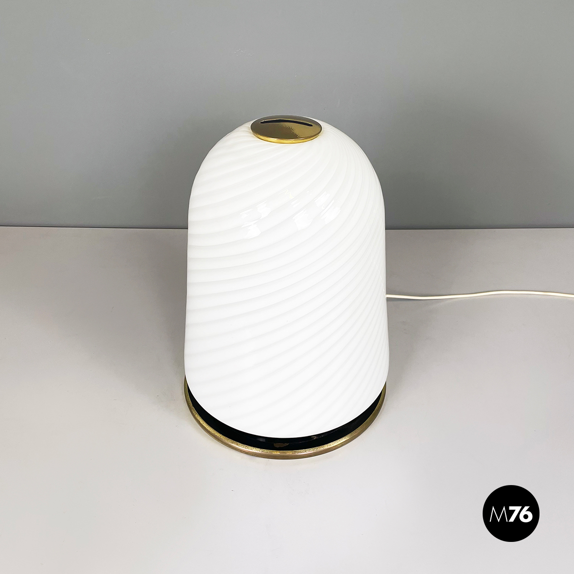 Lampada da tavolo con diffusore a campana in vetro opalino di Murano caratterizzato da un vortice. Nella parte superiore è presente un dettaglio tondo in ottone. La base tonda è in ottone e in metallo verniciato nero. Finemente lavorata a mano.