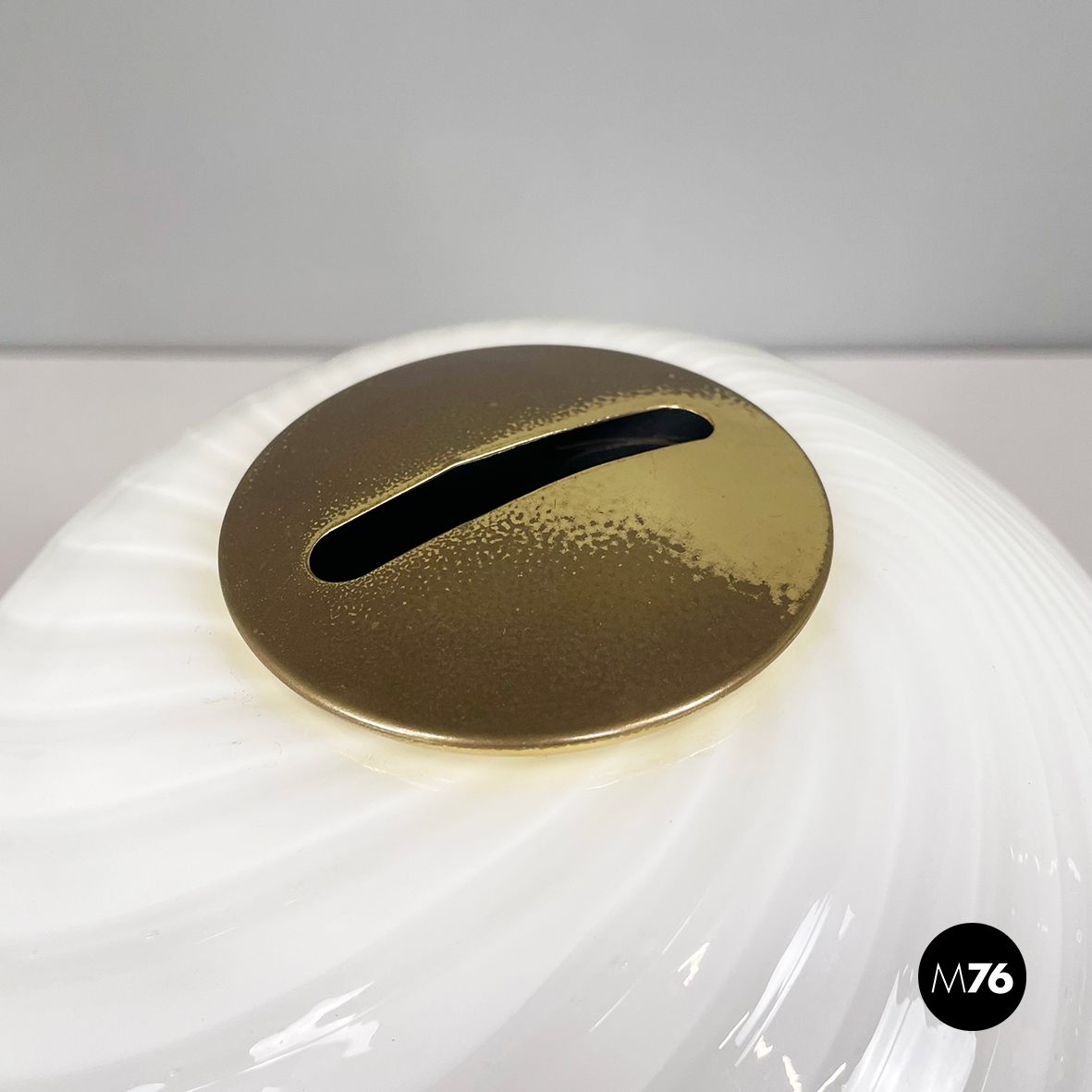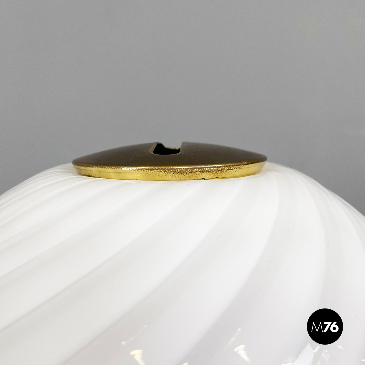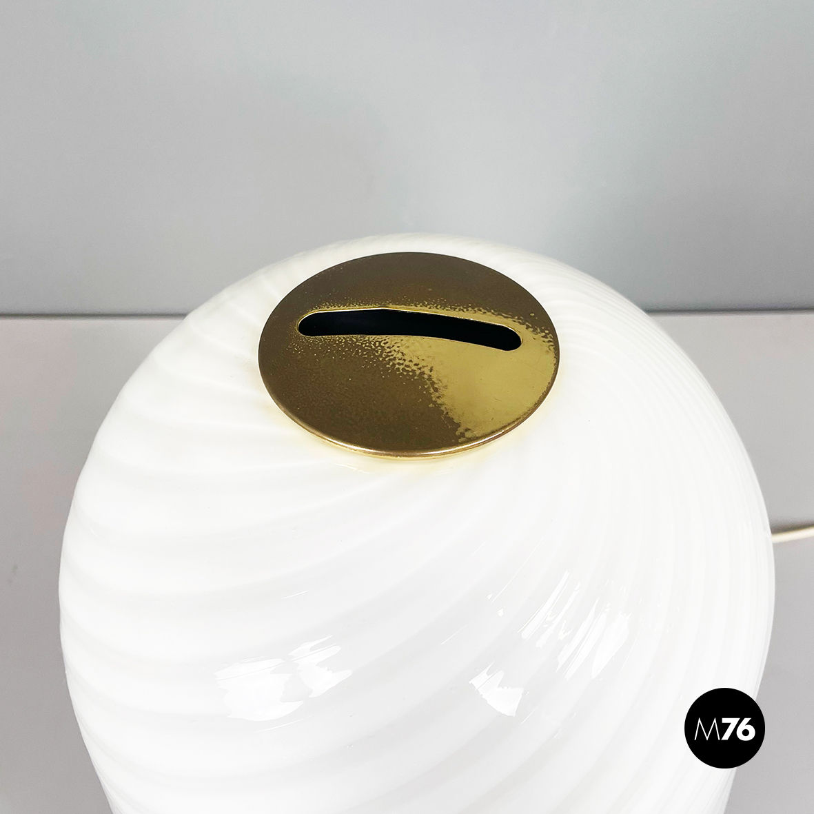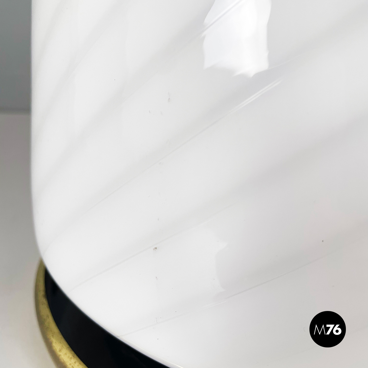 Lampada da tavolo con diffusore a campana in vetro opalino di Murano caratterizzato da un vortice. Nella parte superiore è presente un dettaglio tondo in ottone. La base tonda è in ottone e in metallo verniciato nero. Finemente lavorata a mano.