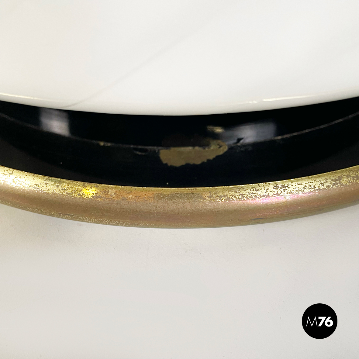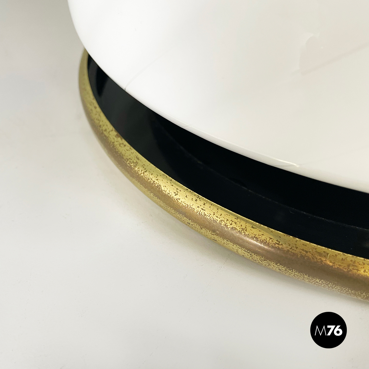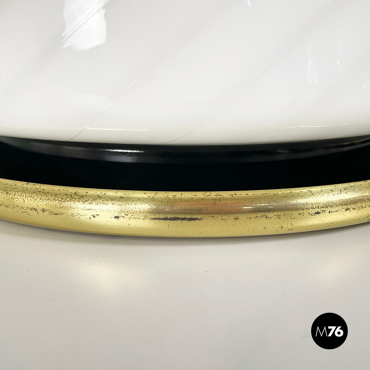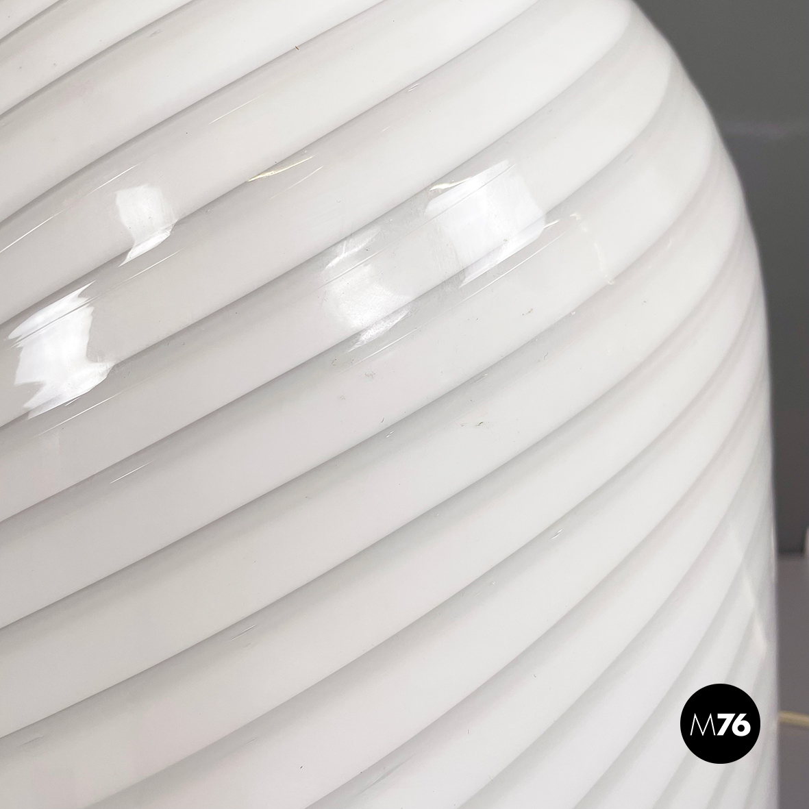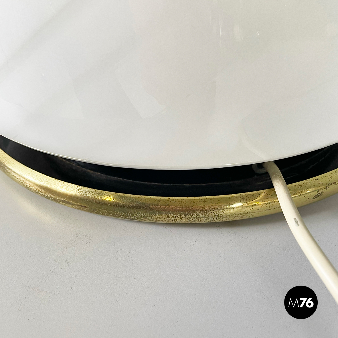 Lampada da tavolo con diffusore a campana in vetro opalino di Murano caratterizzato da un vortice. Nella parte superiore è presente un dettaglio tondo in ottone. La base tonda è in ottone e in metallo verniciato nero. Finemente lavorata a mano.
