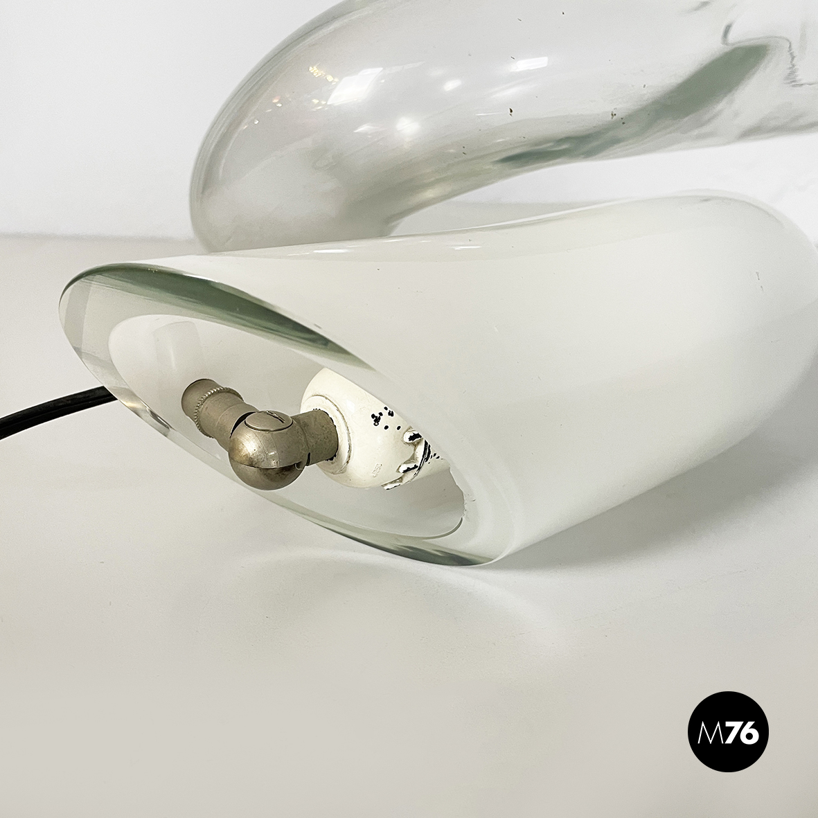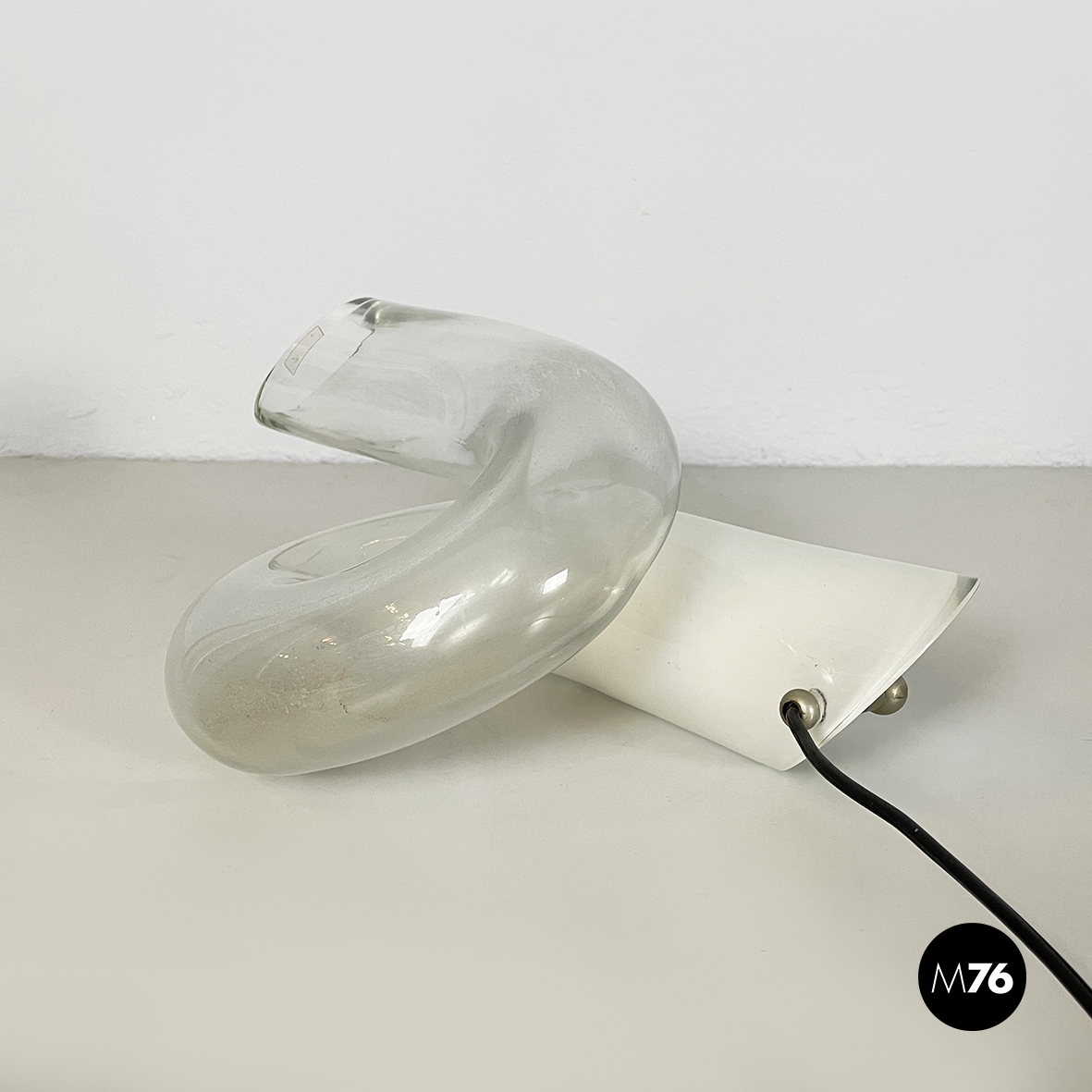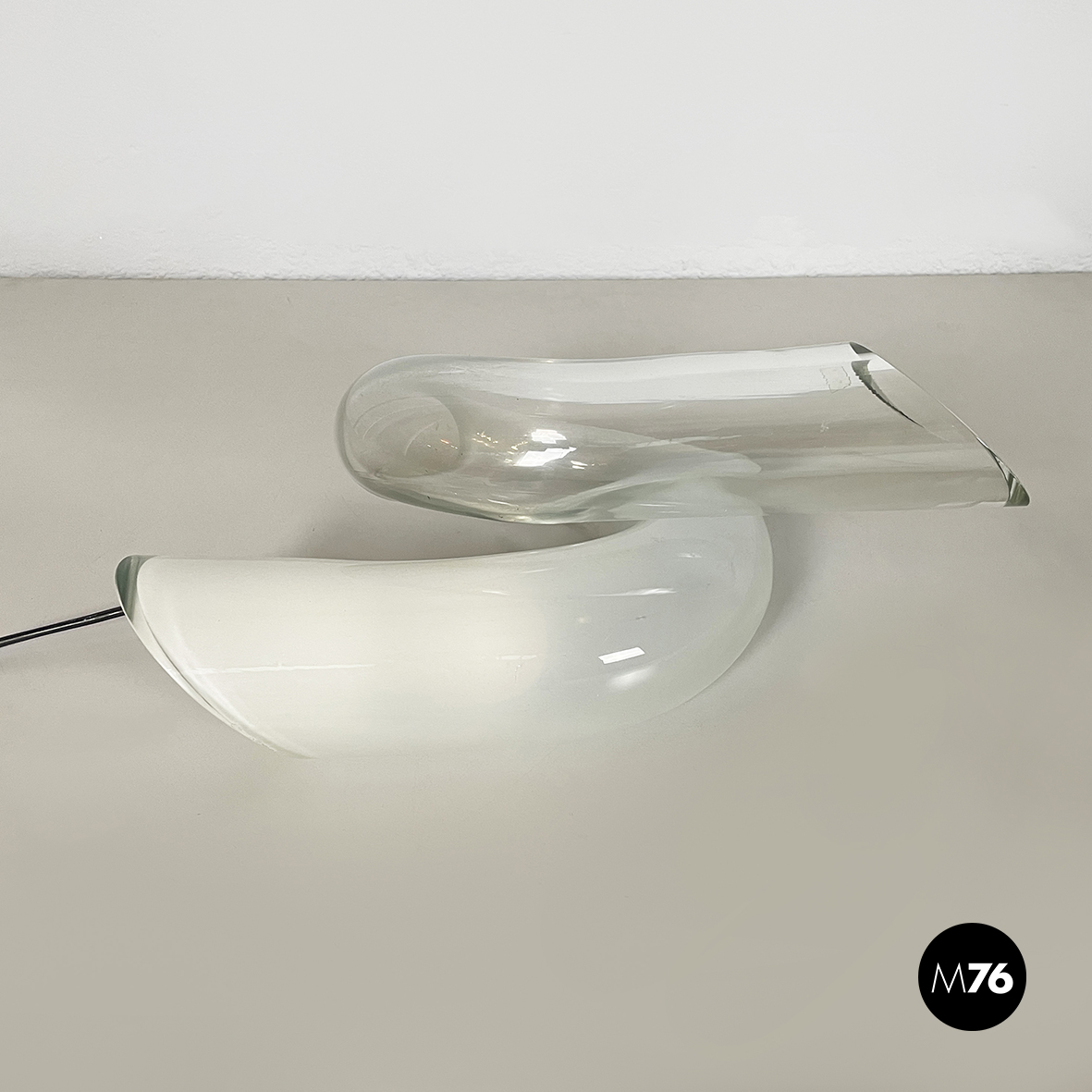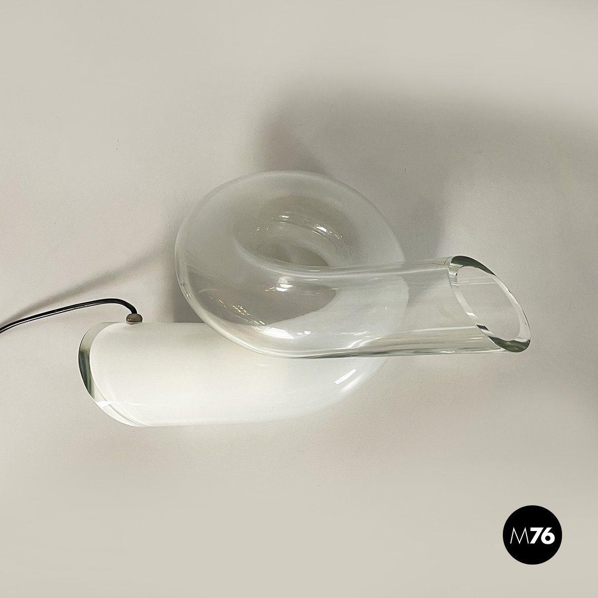 Lampada da tavolo interamente in vetro di grosso spessore che sfuma dal bianco al trasparente. La lampada è composta da un tubolare di vetro annodato su se stesso. I terminali del tubolare sono diagonali. La lampadina è posizionata nella parte di vetro opalino