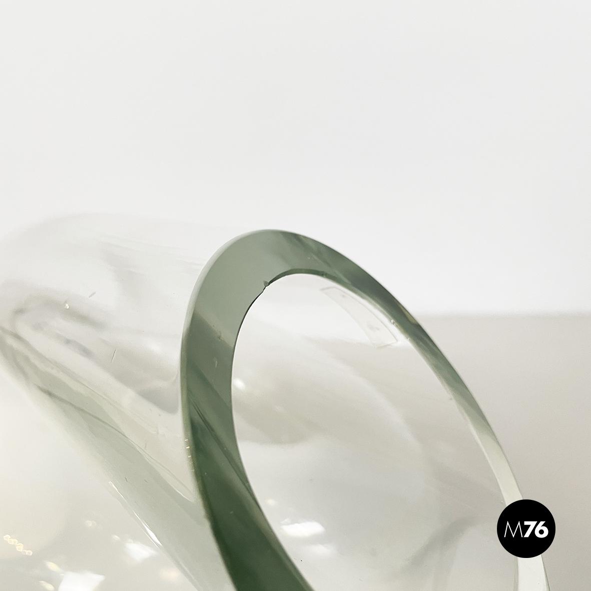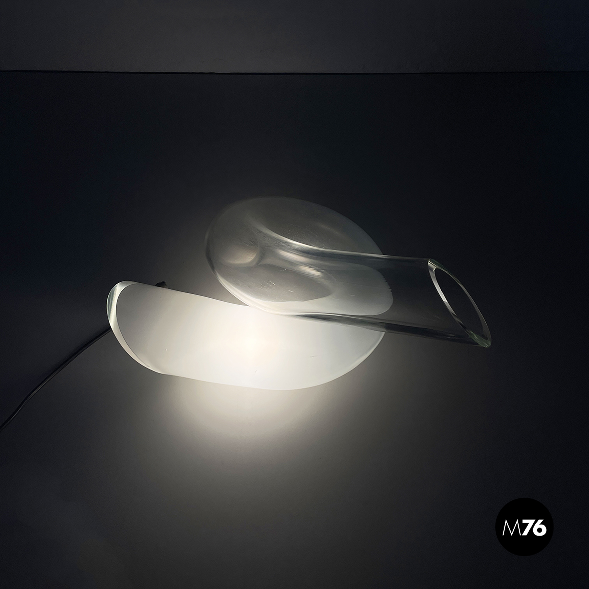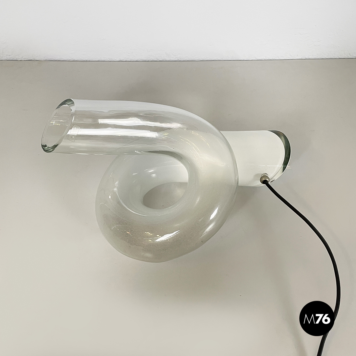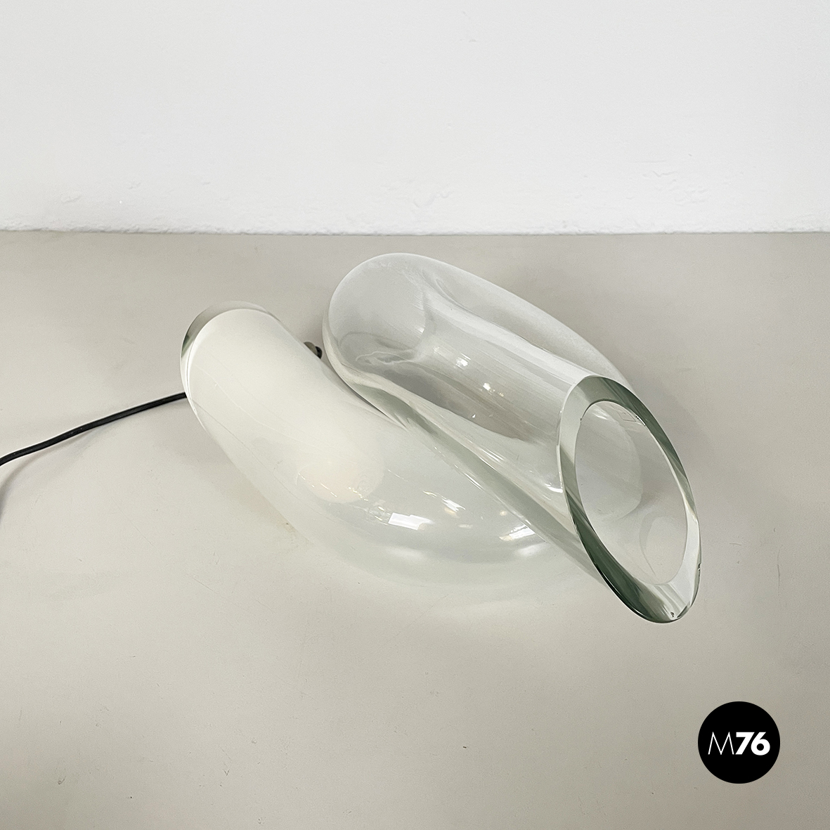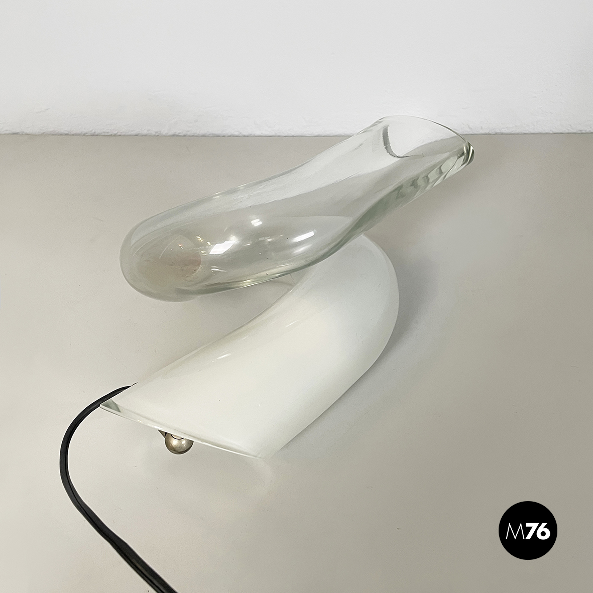 Lampada da tavolo interamente in vetro di grosso spessore che sfuma dal bianco al trasparente. La lampada è composta da un tubolare di vetro annodato su se stesso. I terminali del tubolare sono diagonali. La lampadina è posizionata nella parte di vetro opalino