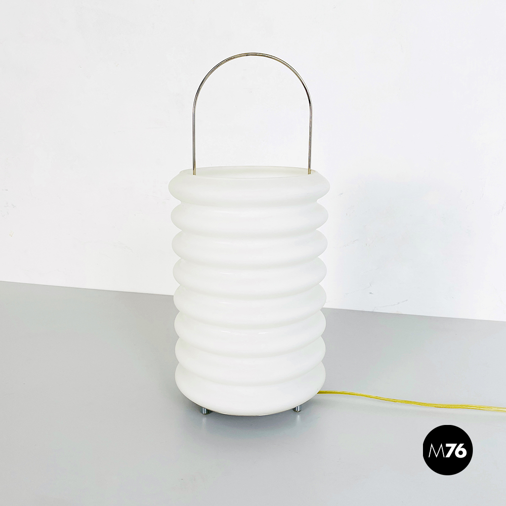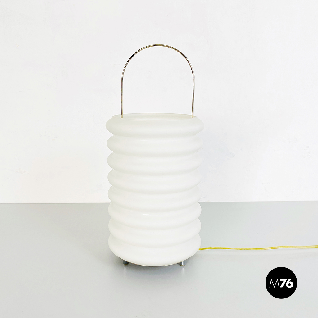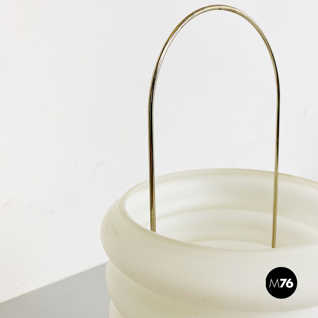 Lampada da tavolo modello Lanterna in vetro di Murano bianco statinato con struttura in metallo e manico in ottone. La lampada nasce per essere da tavolo e da sospensione.