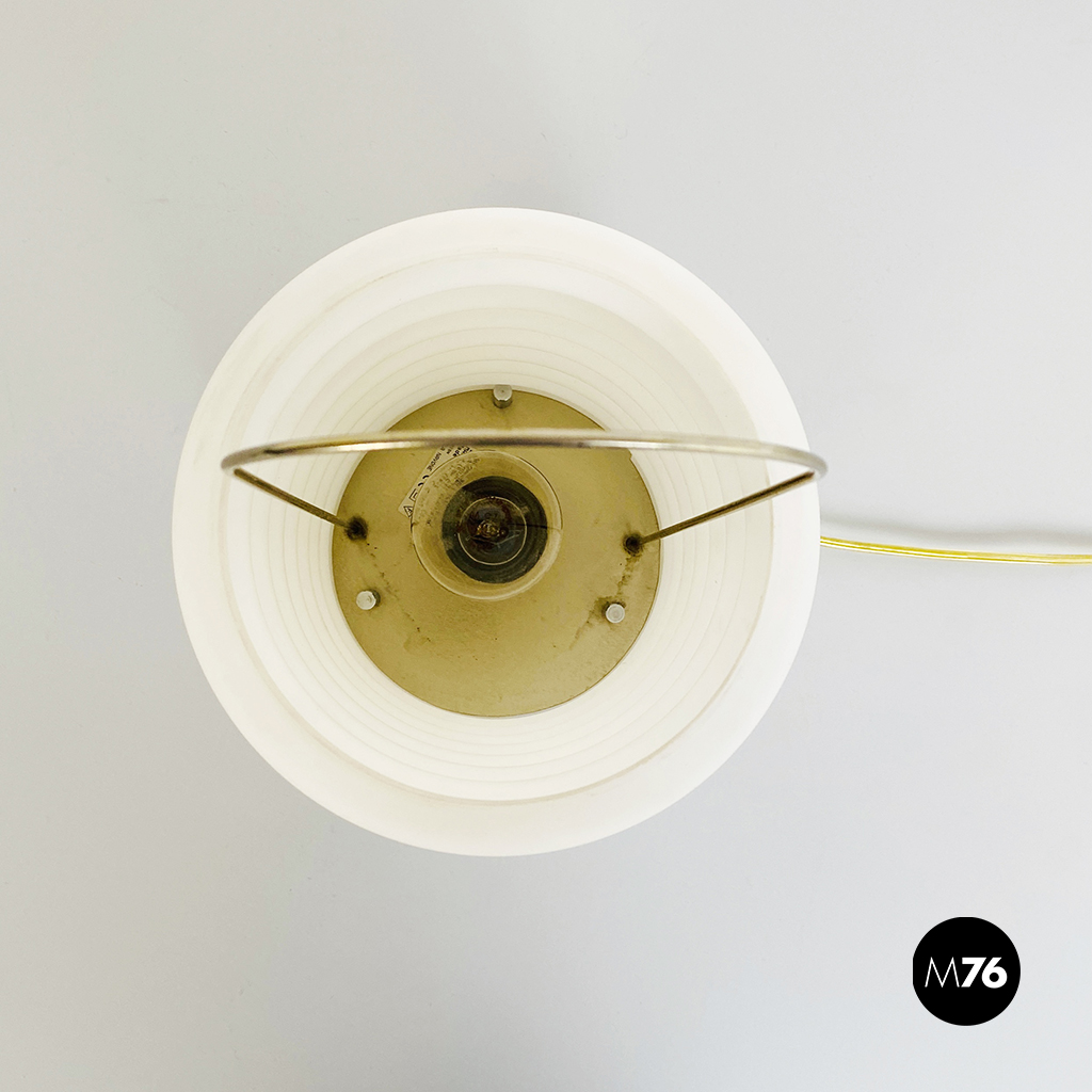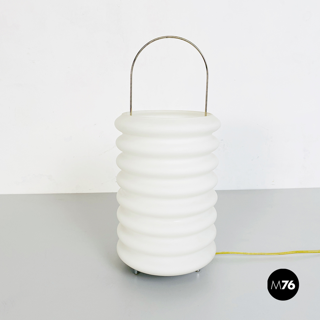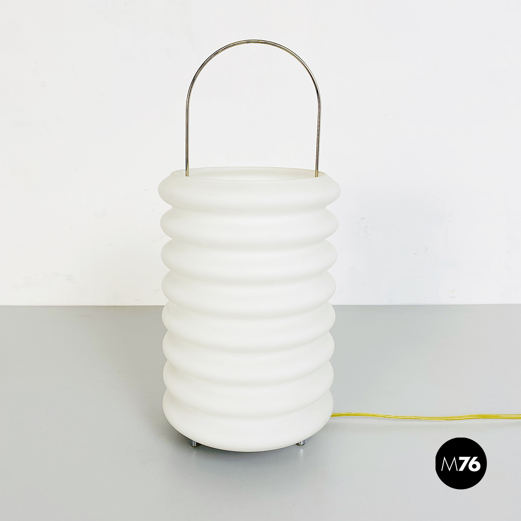 Lampada da tavolo modello Lanterna in vetro di Murano bianco statinato con struttura in metallo e manico in ottone. La lampada nasce per essere da tavolo e da sospensione.