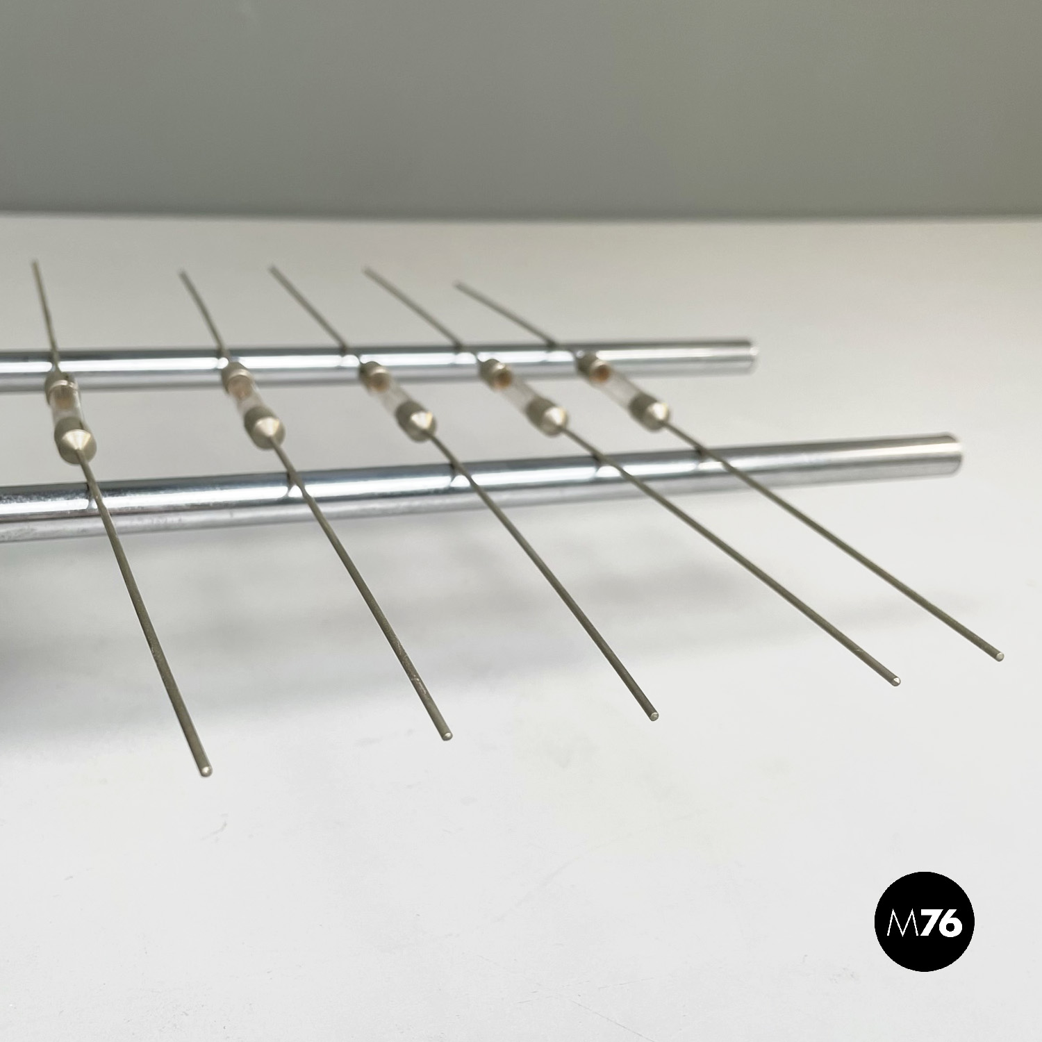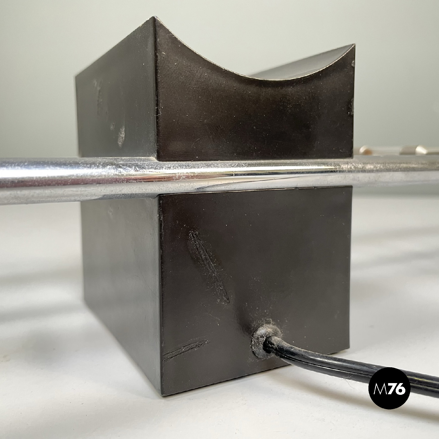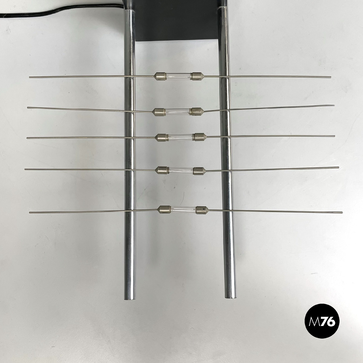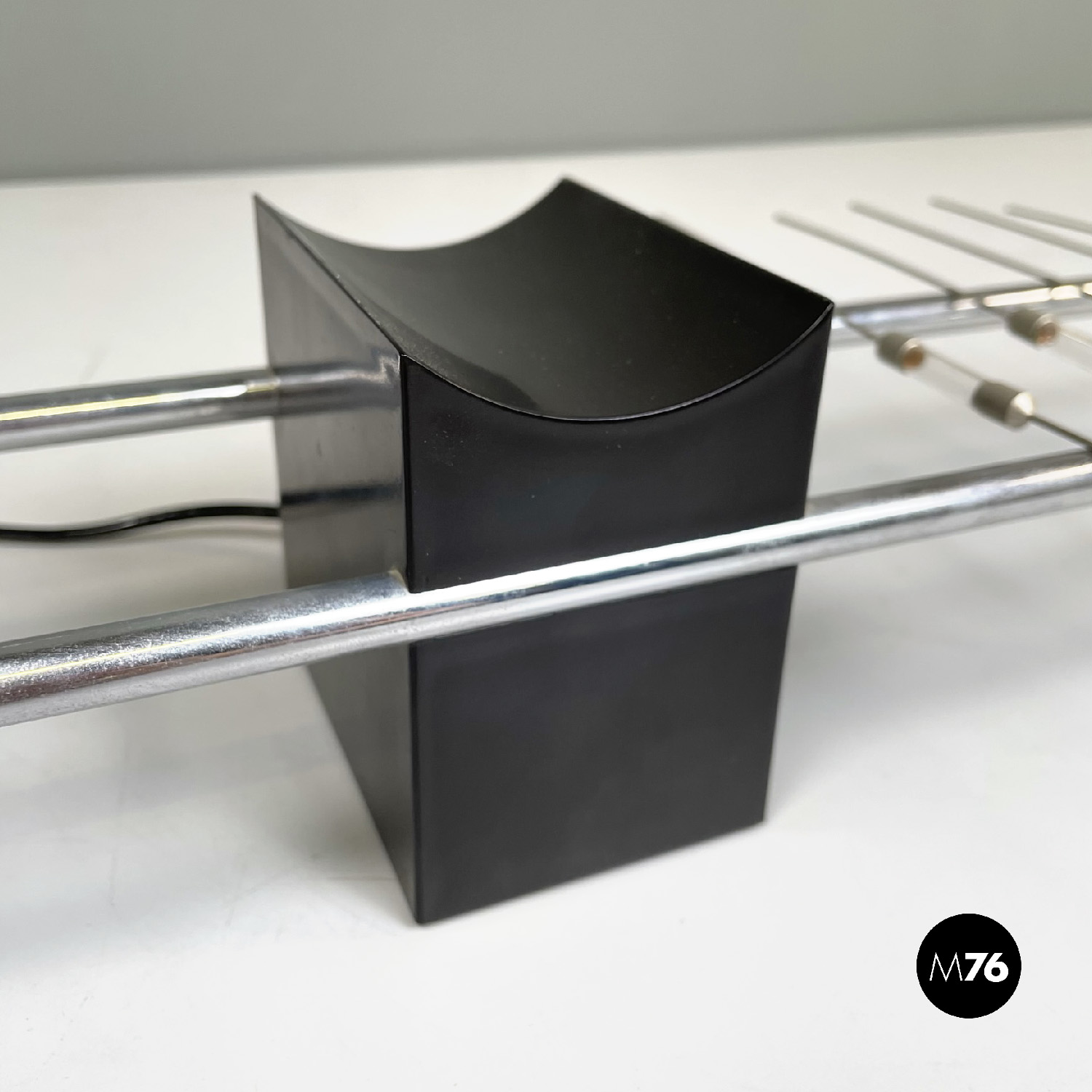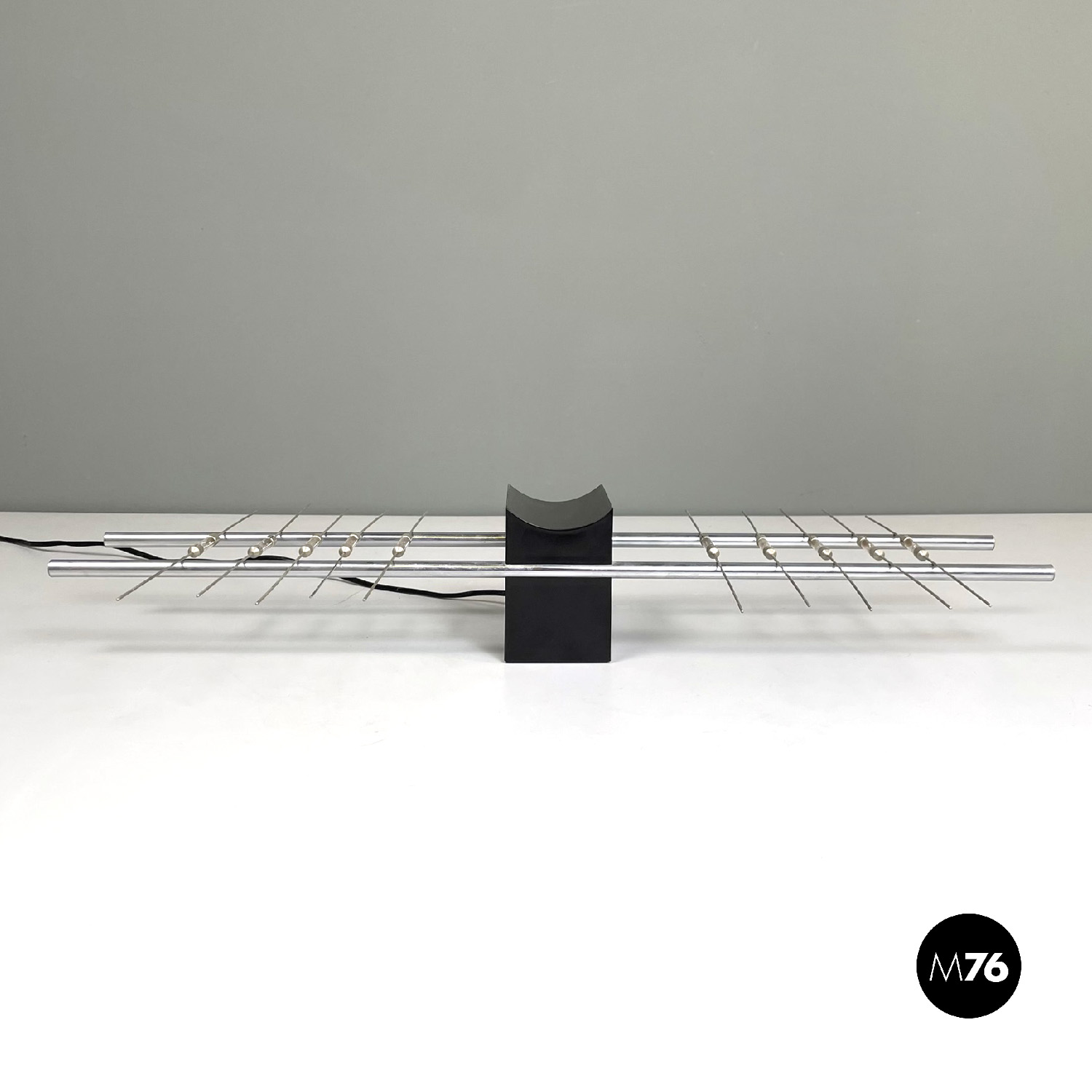 Lampada da tavolo con struttura composta da due tondini in metallo. La base quadrata è in metallo nero. La particolarità è l’accensione attraverso il contatto tra la struttura e le lampadine posizionate su di essa.
