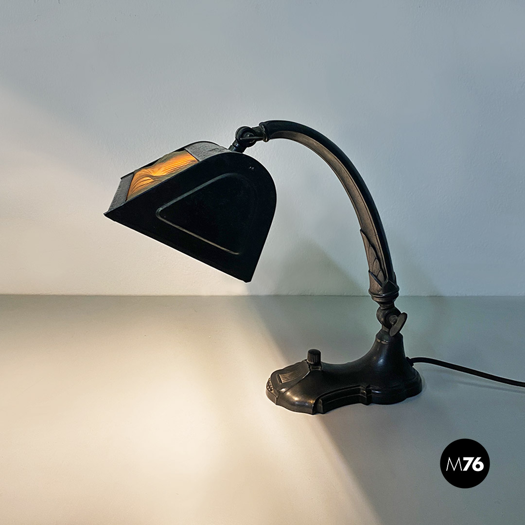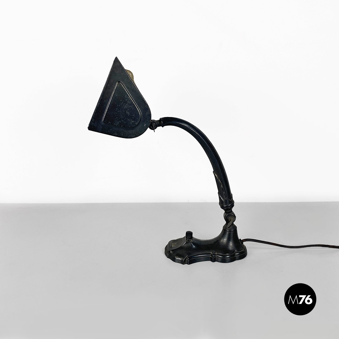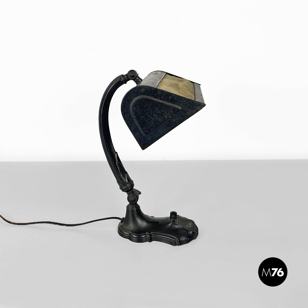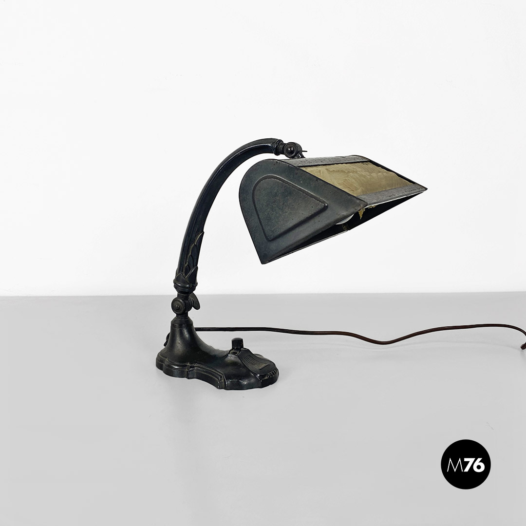 Lampada da tavolo ministeriale in metallo nero e con paralume in metallo e tessuto con interruttore in bachelite originale.
