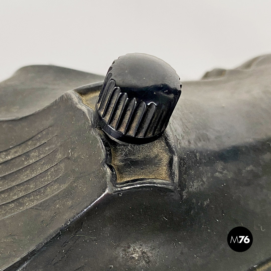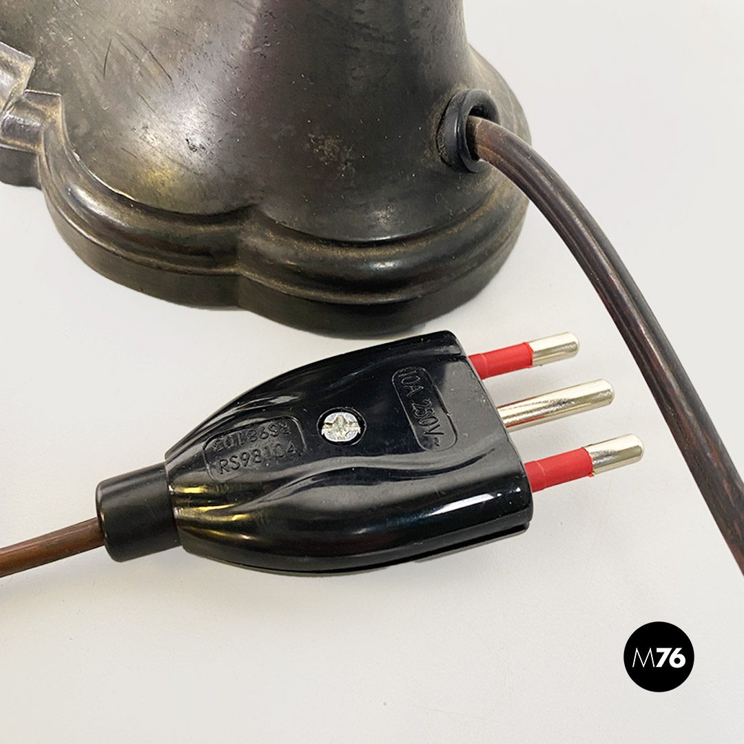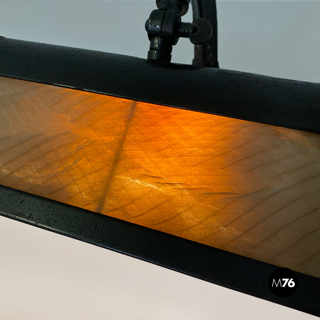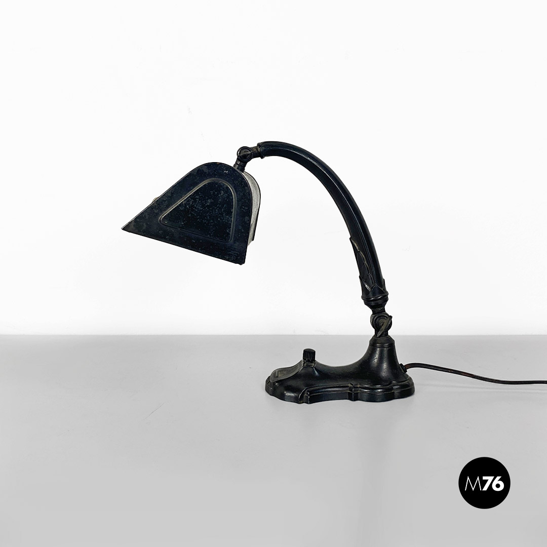 Lampada da tavolo ministeriale in metallo nero e con paralume in metallo e tessuto con interruttore in bachelite originale.