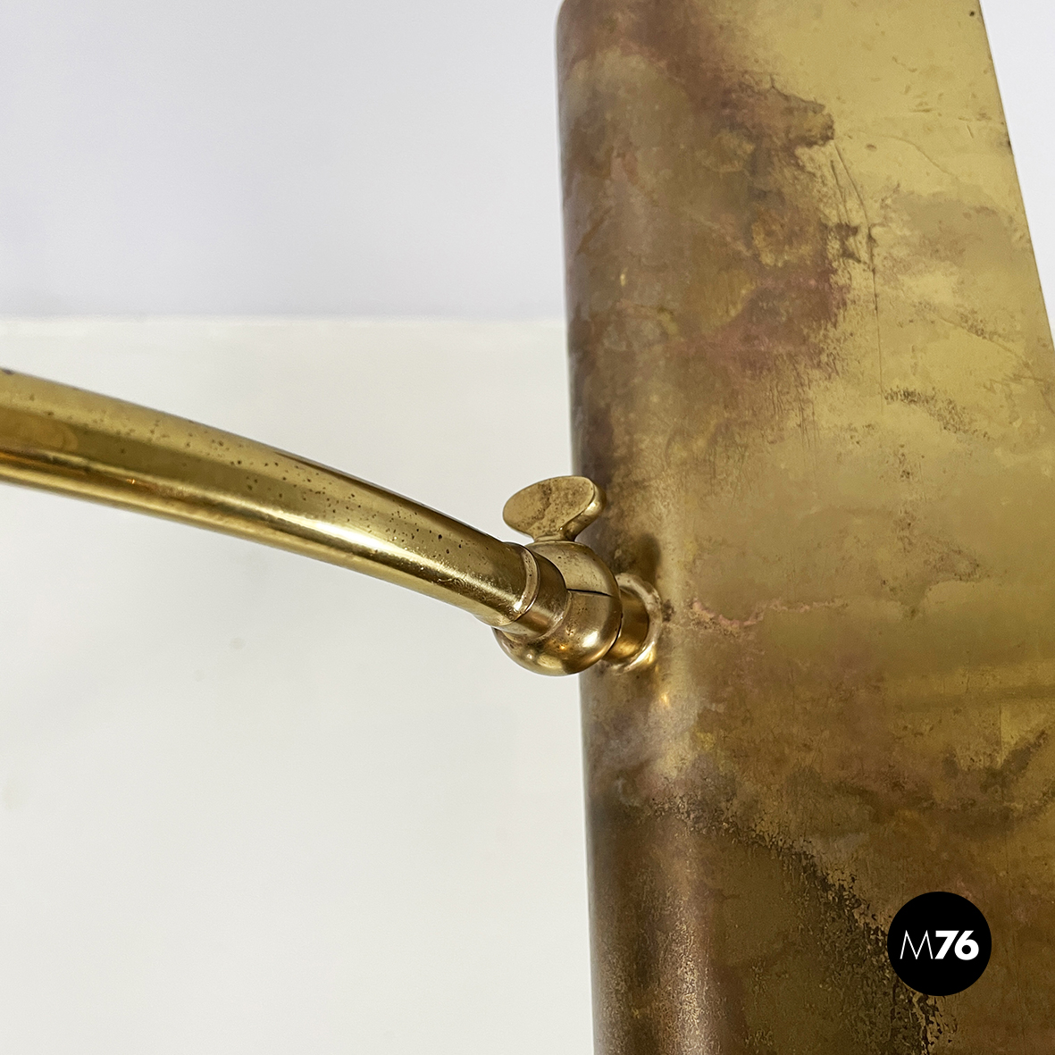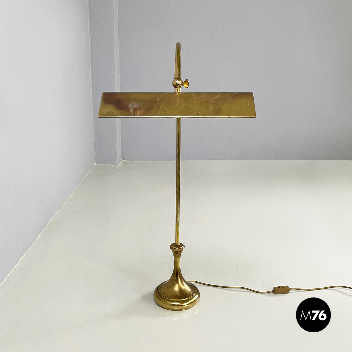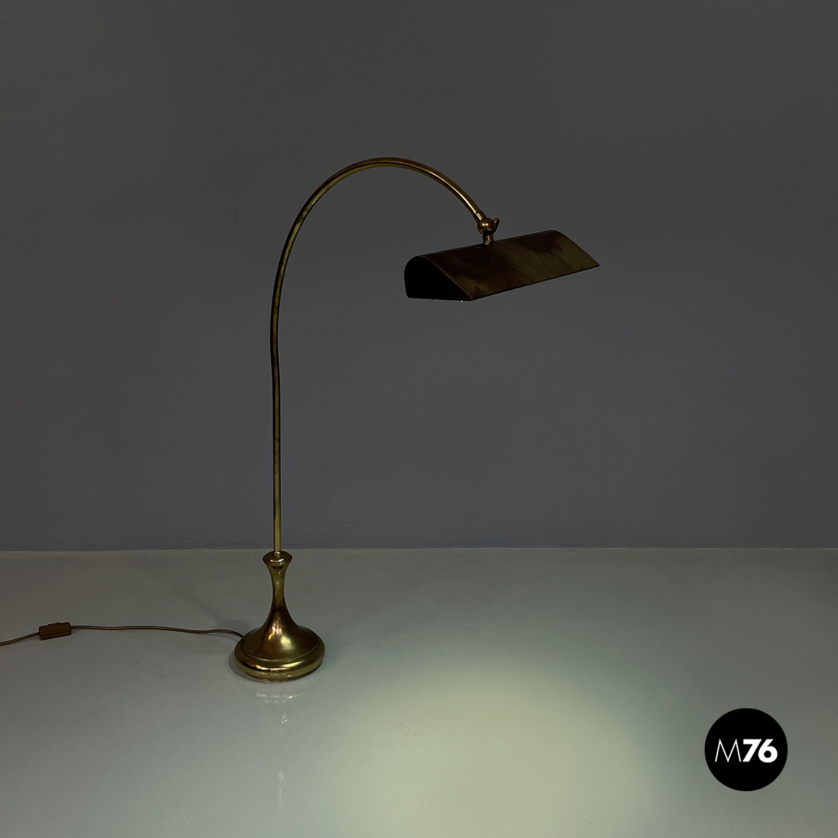 Lampada da tavolo stile ministero con diffusore orientabile in ottone. Il paralume è a base rettangolare e con struttura curvata. Lo stelo è in tondino e a forma di arco. La base è tonda.
