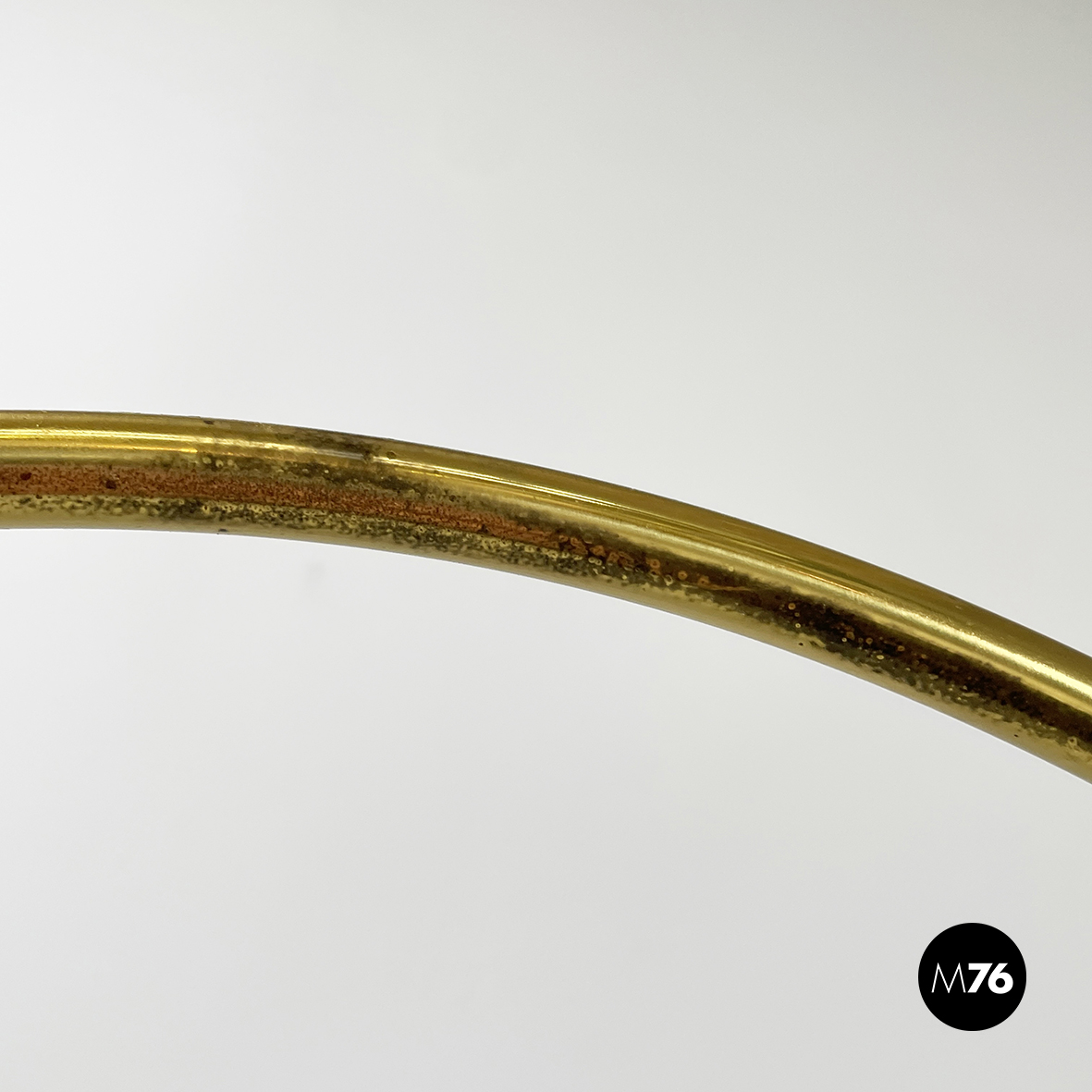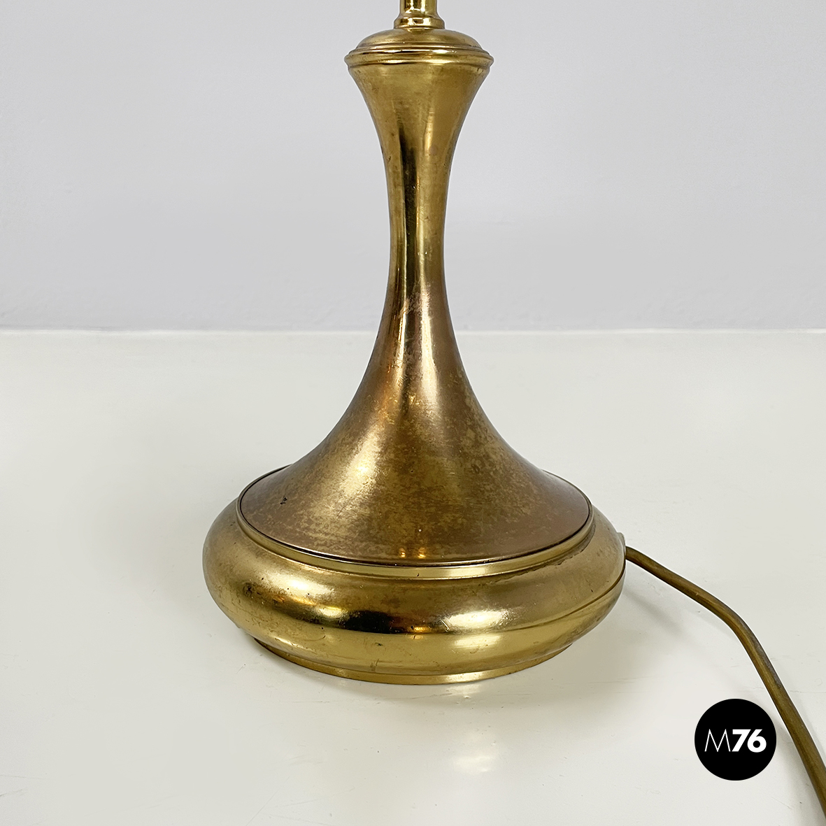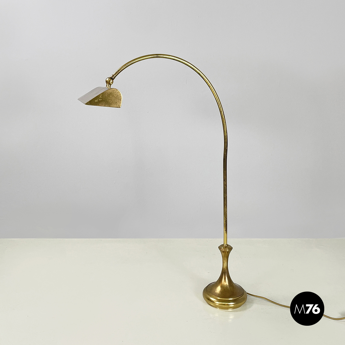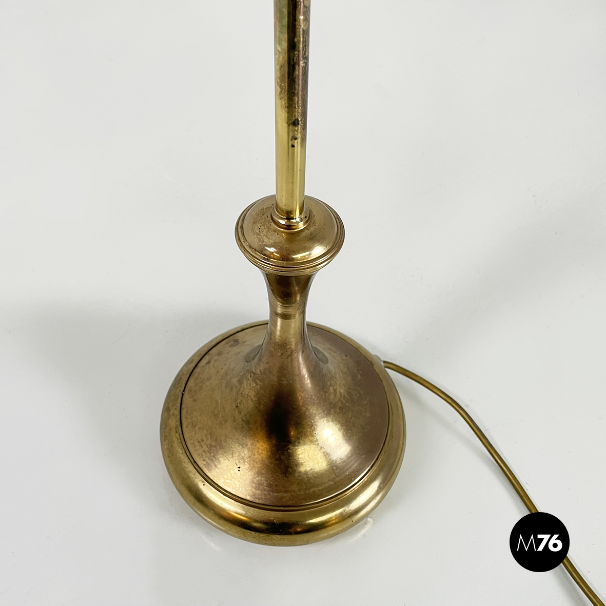 Lampada da tavolo stile ministero con diffusore orientabile in ottone. Il paralume è a base rettangolare e con struttura curvata. Lo stelo è in tondino e a forma di arco. La base è tonda.