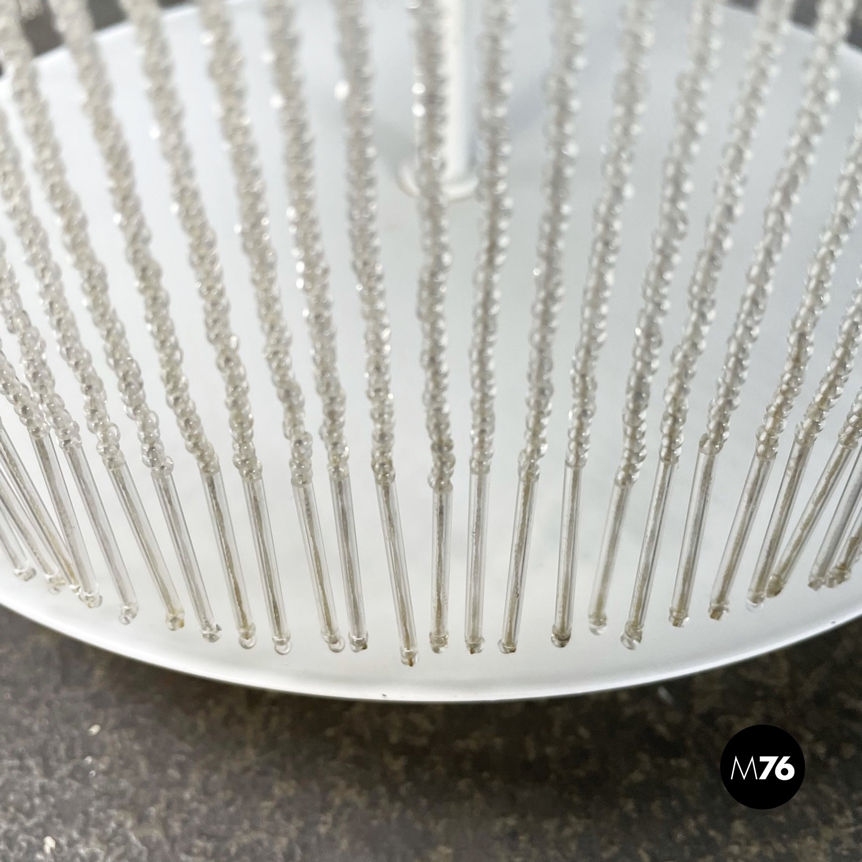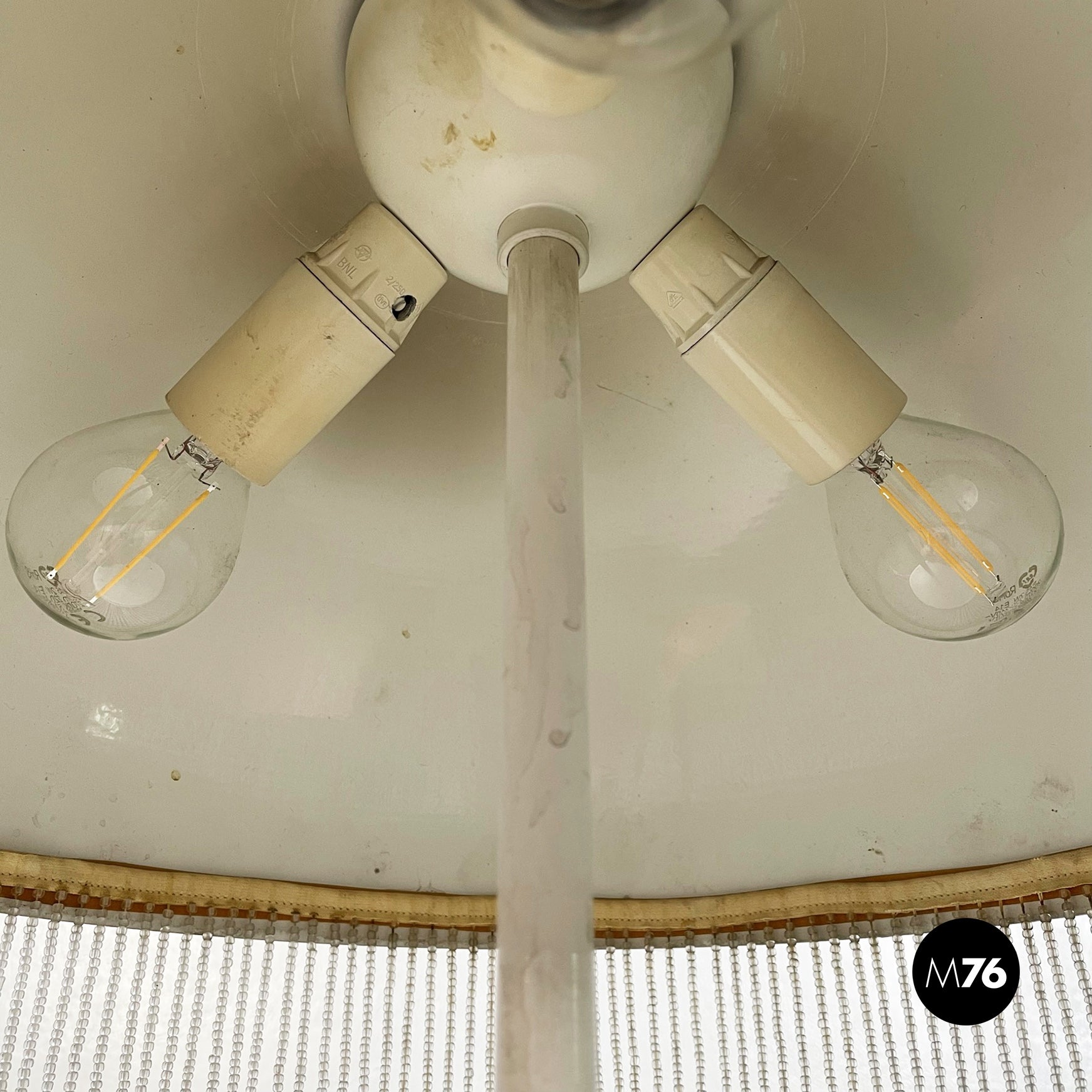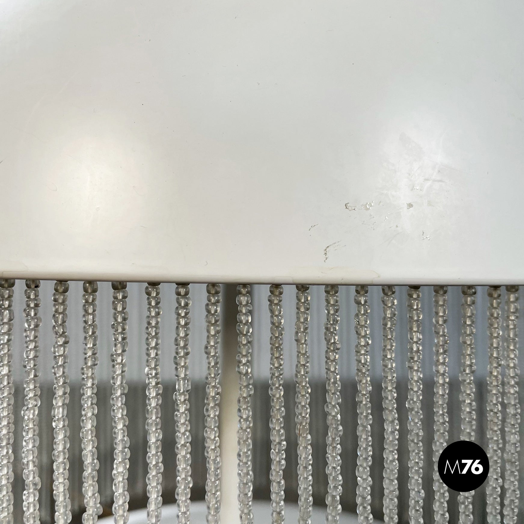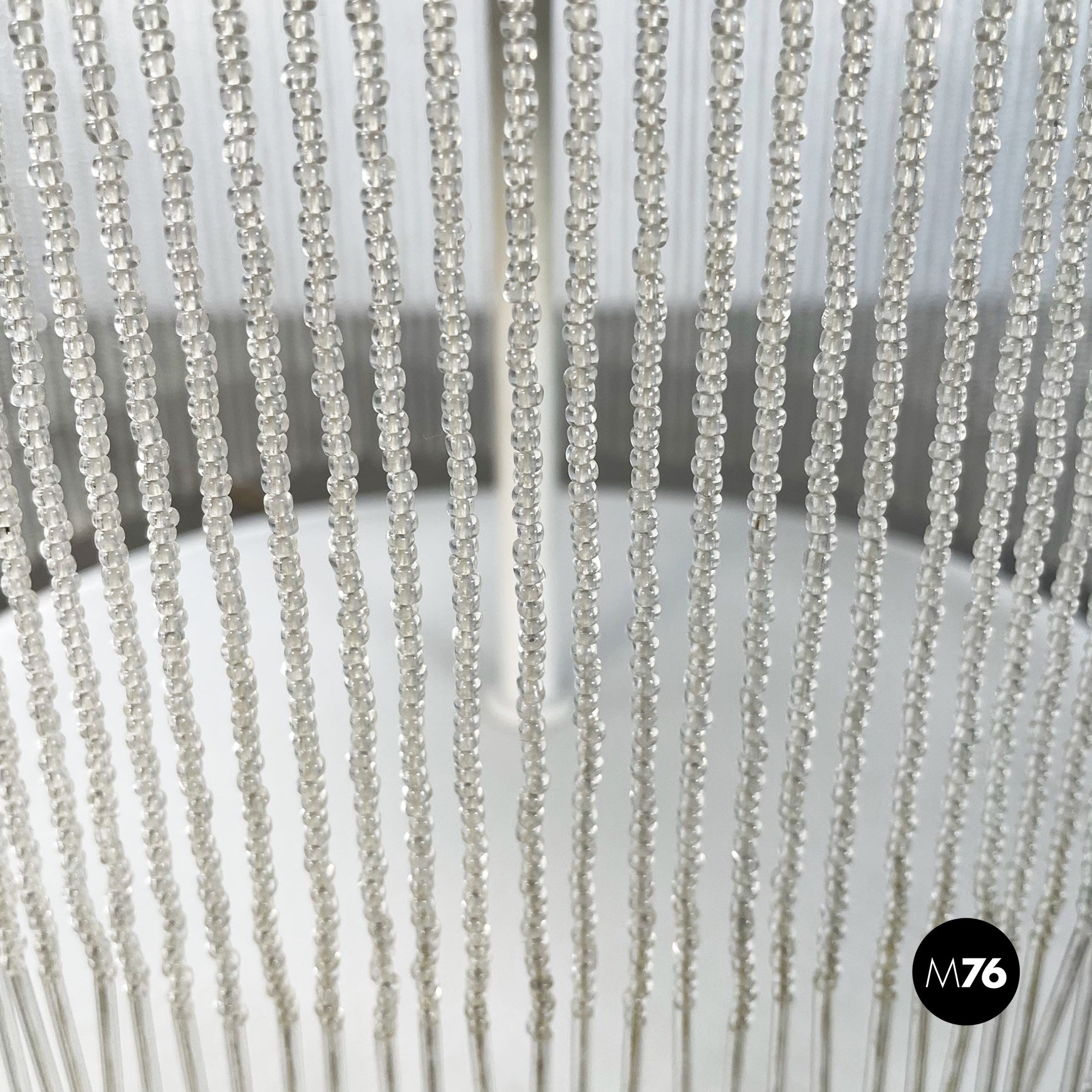 Lampada da tavolo Otero di base tonda in metallo verniciato bianco dal cui paralume di forma semi sferica scendono una fila di perline bianco quasi trasparente.