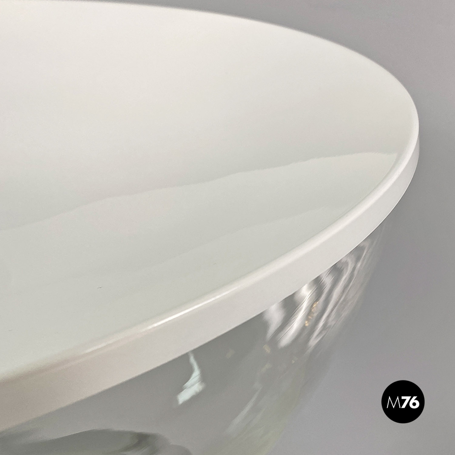 Lampada da tavolo modello Taccia a luce indiretta e riflessa con riflettore in metallo verniciato color bianco lucido e diffusore orientabile in vetro trasparente soffiato. Il diffusore si regge su un corpo sagomato in alluminio di colore nero con base in acciaio lucidato nichelato e zapponato.