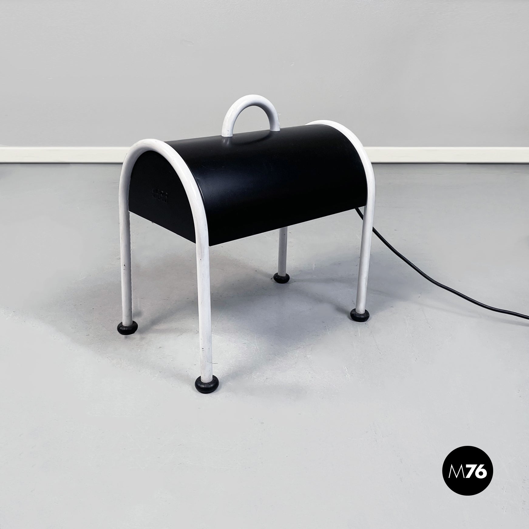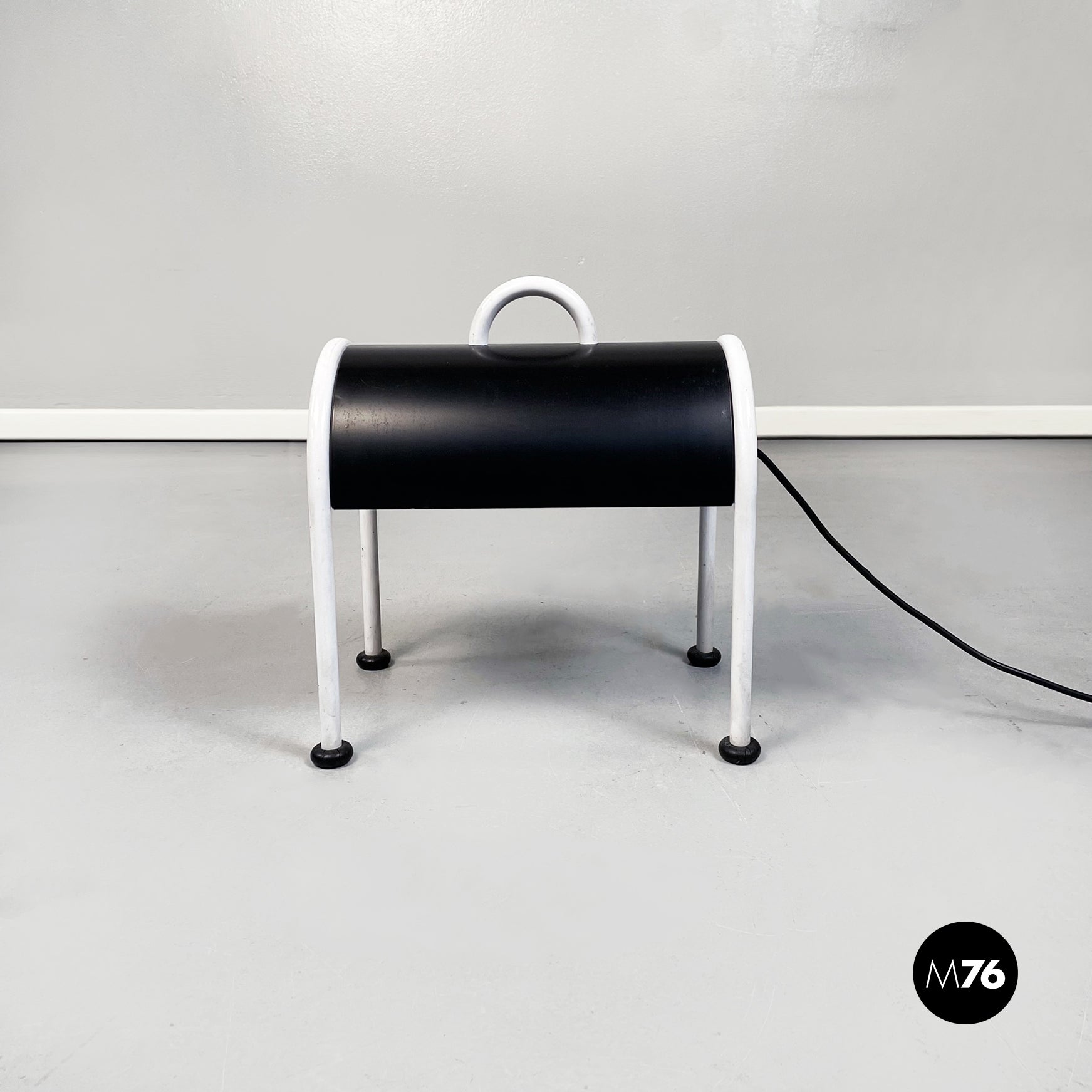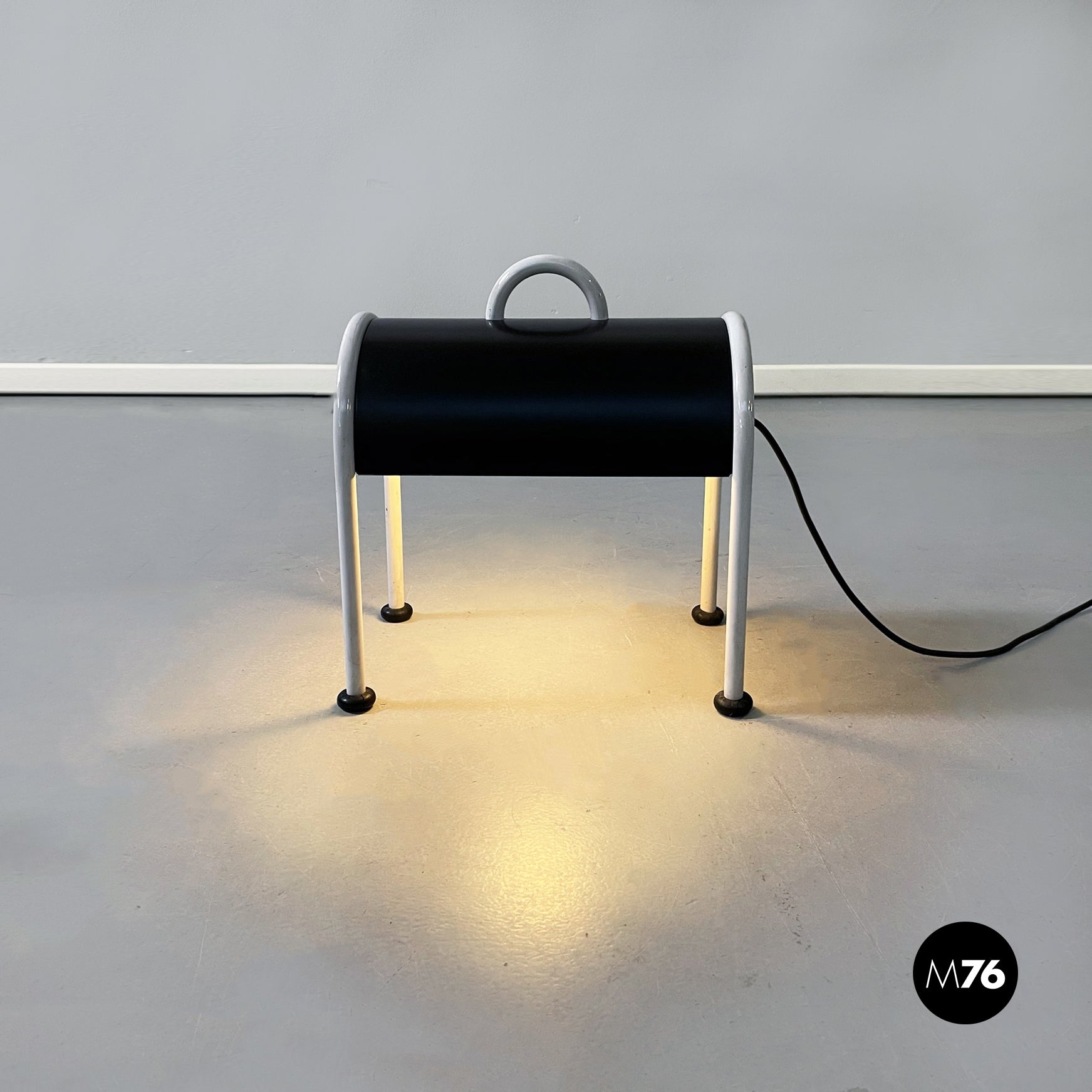Lampada da tavolo o da terra modello Valigia con struttura in tubolare di acciaio verniciato color bianco con paralume in lamiera è bicolor con esterno nero opaco ed interno bianco per permettere una maggiore resa della fonte luminosa. Sopra il paralume presenta una maniglia la quale permette di prendere la lampada e spostarla con facilità chiaro riferimento alla valigia. I piedini sono in gomma nera.
