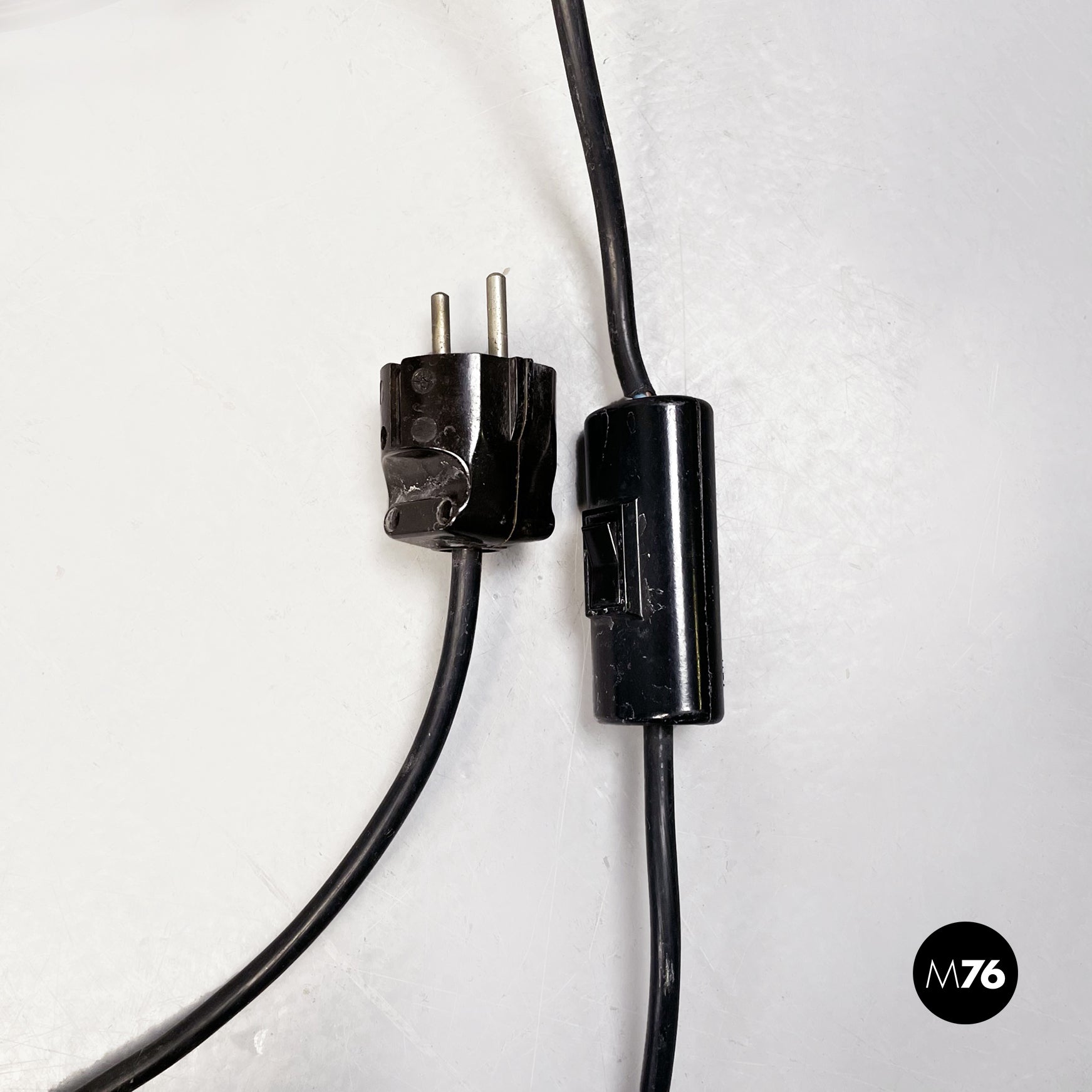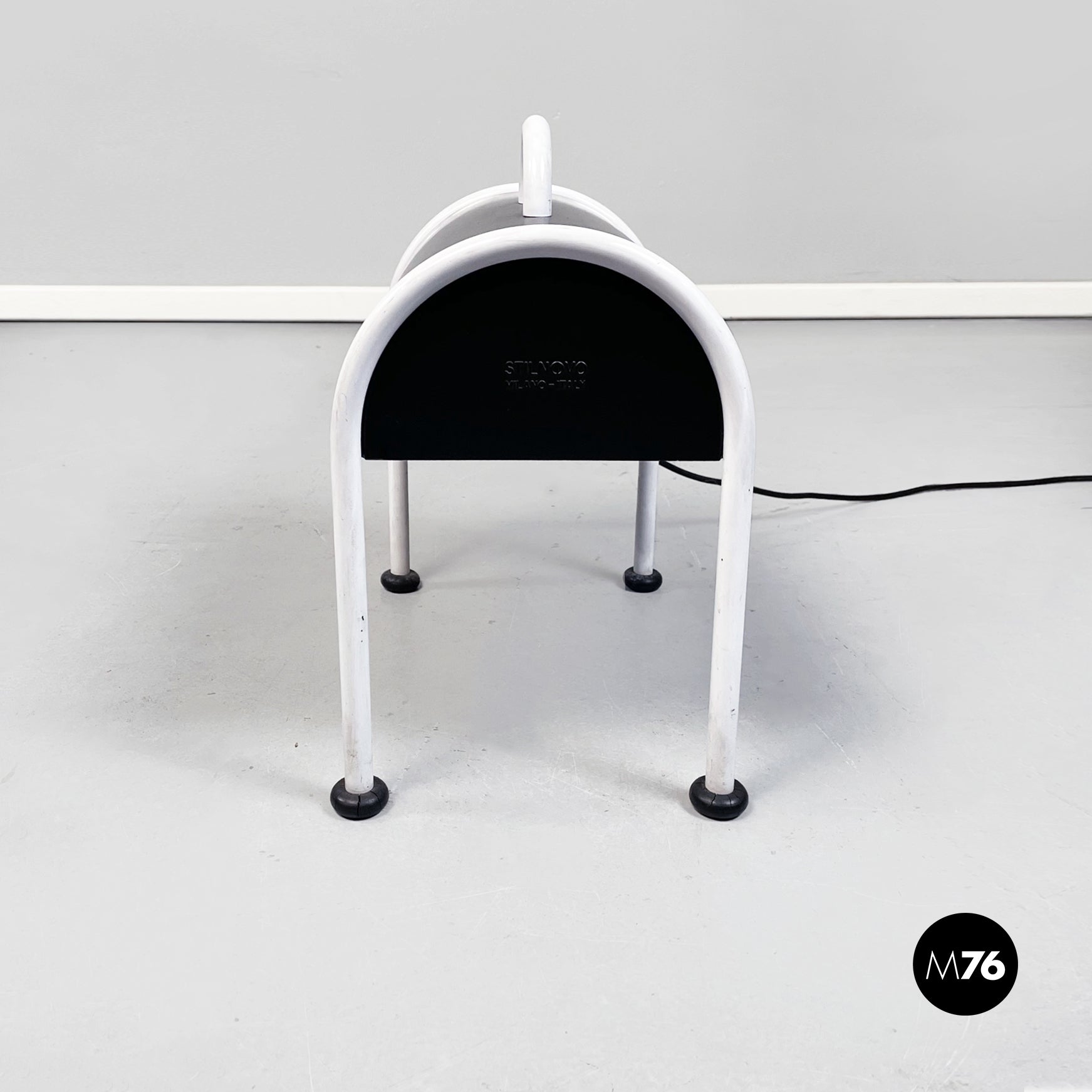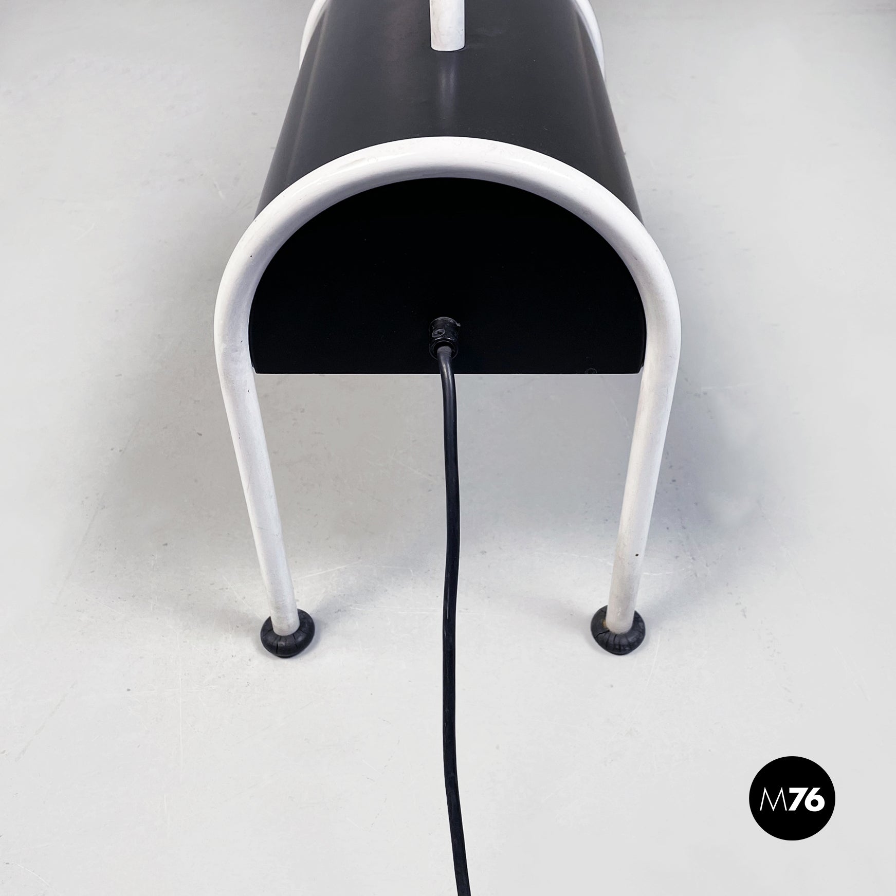 Lampada da tavolo o da terra modello Valigia con struttura in tubolare di acciaio verniciato color bianco con paralume in lamiera è bicolor con esterno nero opaco ed interno bianco per permettere una maggiore resa della fonte luminosa. Sopra il paralume presenta una maniglia la quale permette di prendere la lampada e spostarla con facilità chiaro riferimento alla valigia. I piedini sono in gomma nera.