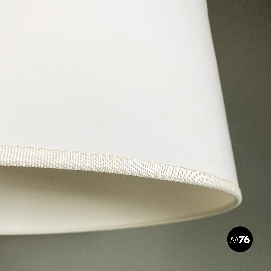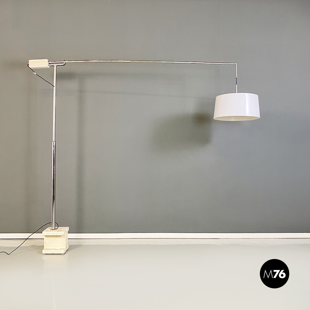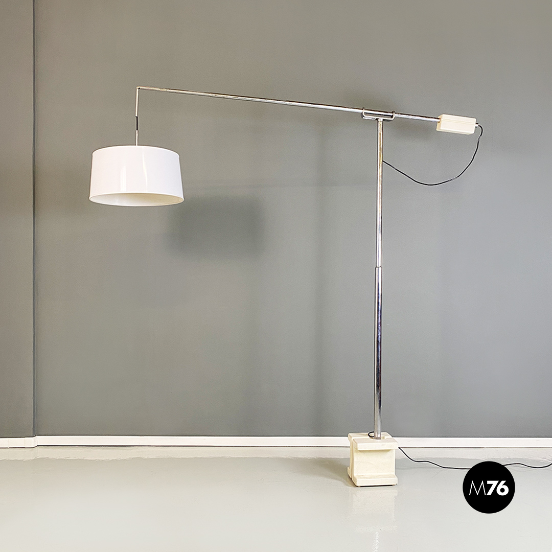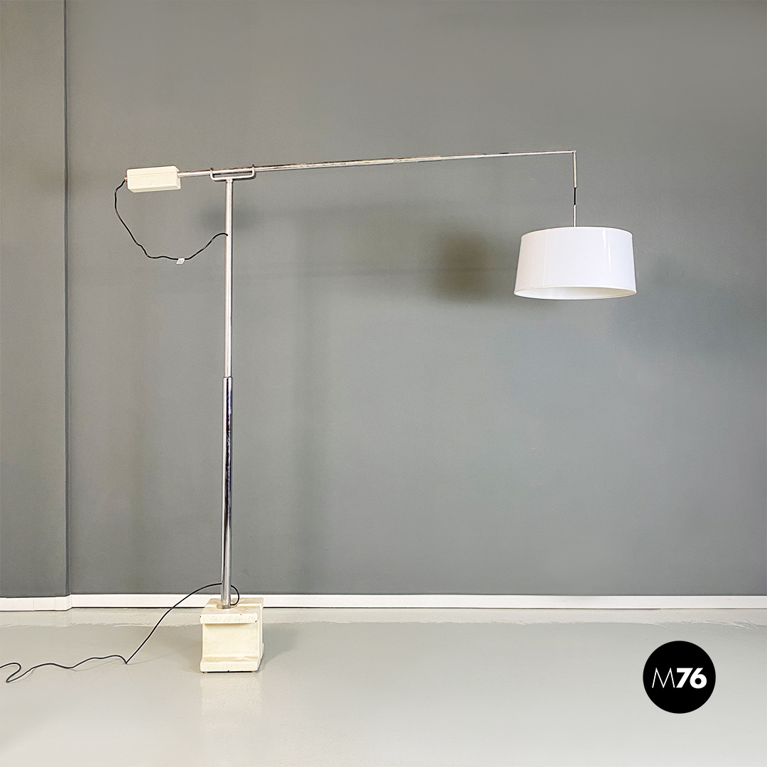 Lampada da terra con base in marmo struttura in acciaio con braccio telescopico e paralume cilindrico con un piccolo segno.