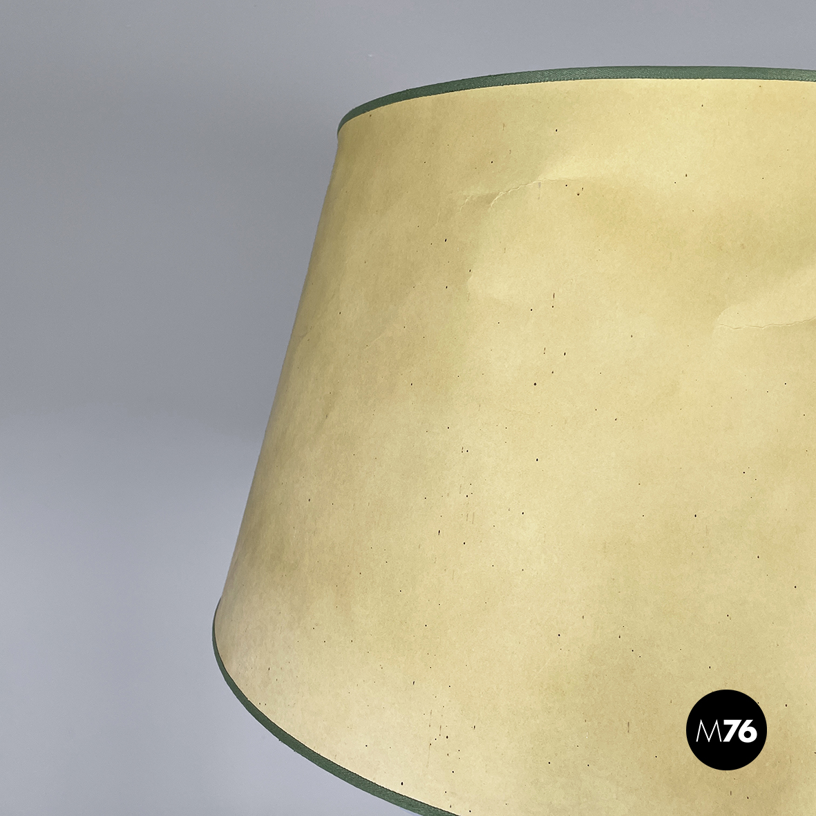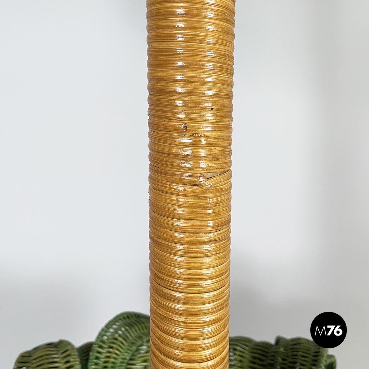 Lampada da terra con paralume a base tonda in carta beige con passamaneria in verde. La struttura è a sezione tonda è rivestiti in vimini. La base ricorda la forma di un ananas in vimini intrecciato con alcuni dettagli in verde per le foglie e parti in rattan.
