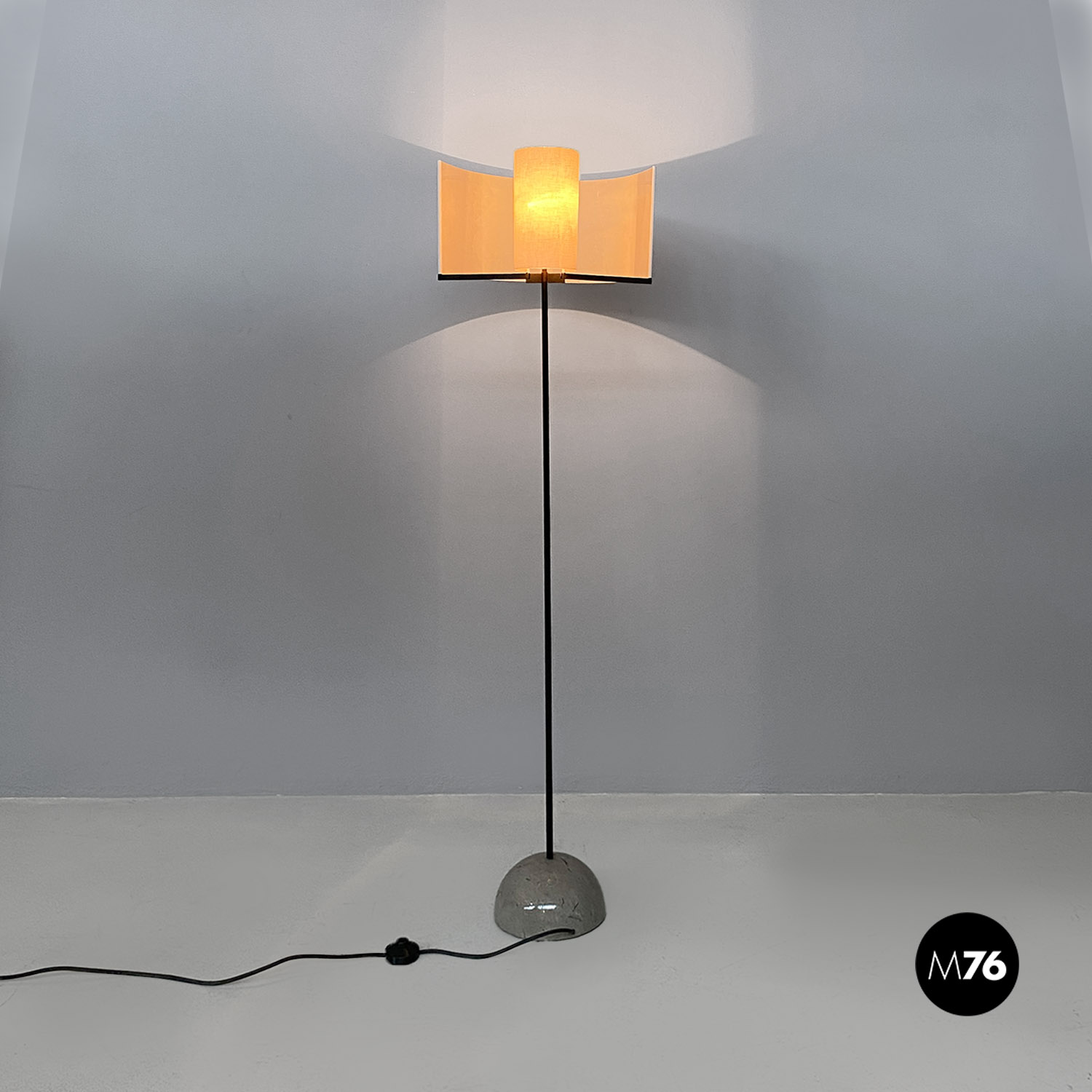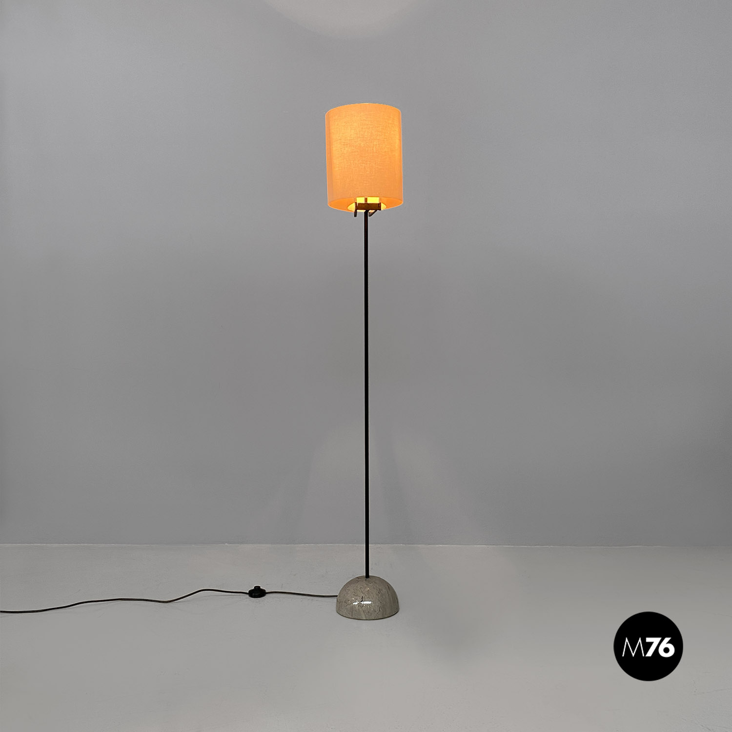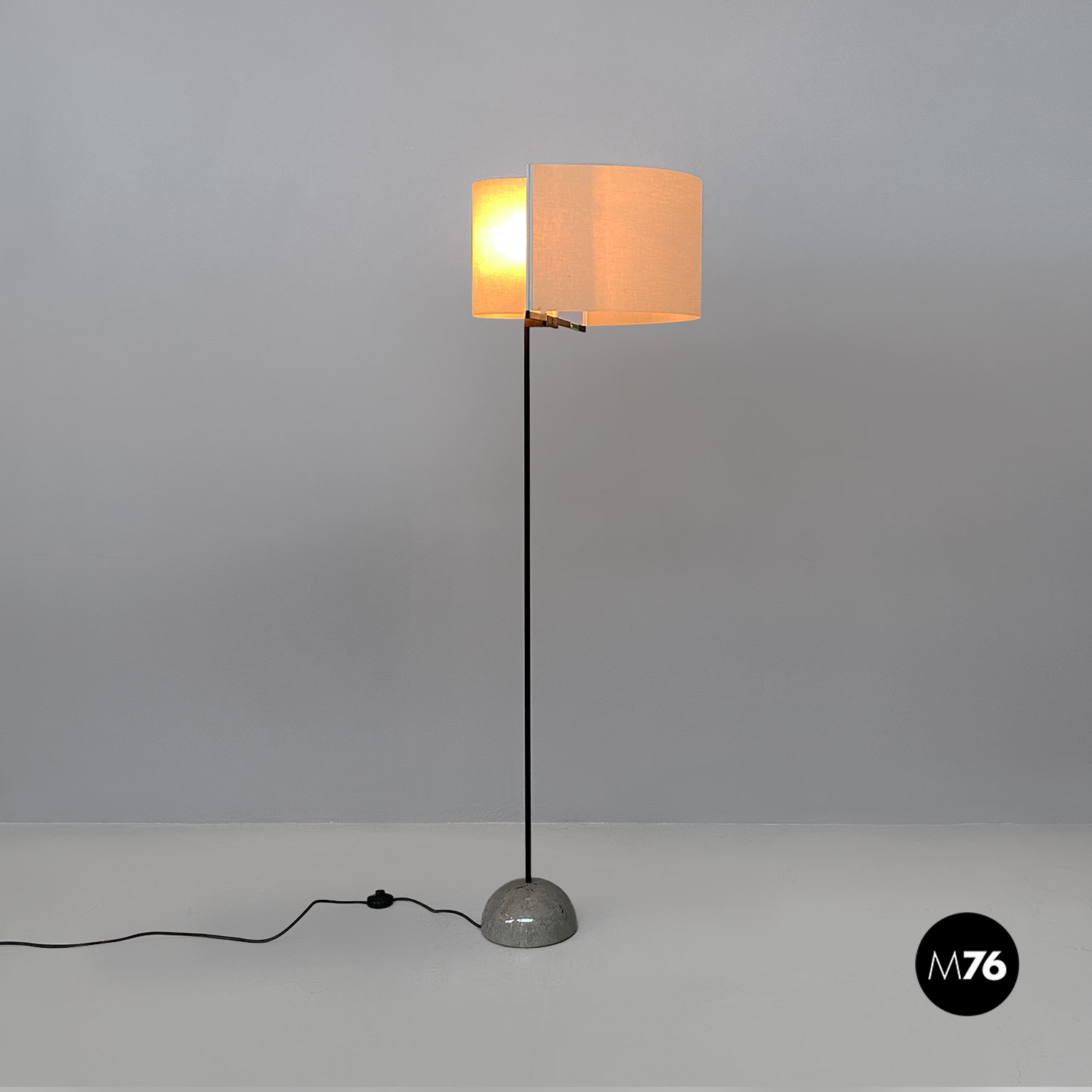 Lampada da terra modello Abate con base in marmo grigio semicircolare e la pianta in acciaio nero. Il paralume in particolare permette di spostarlo come si preferisce.
