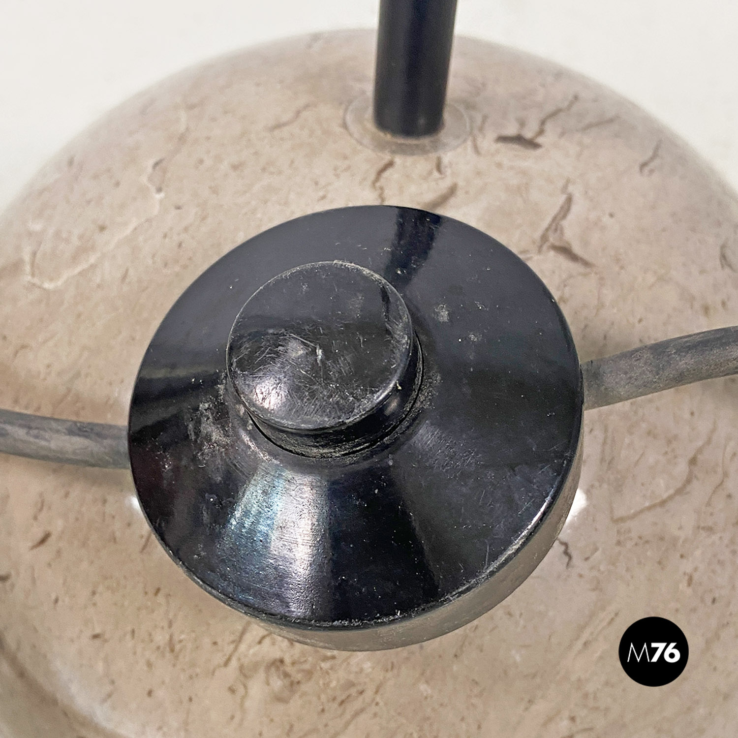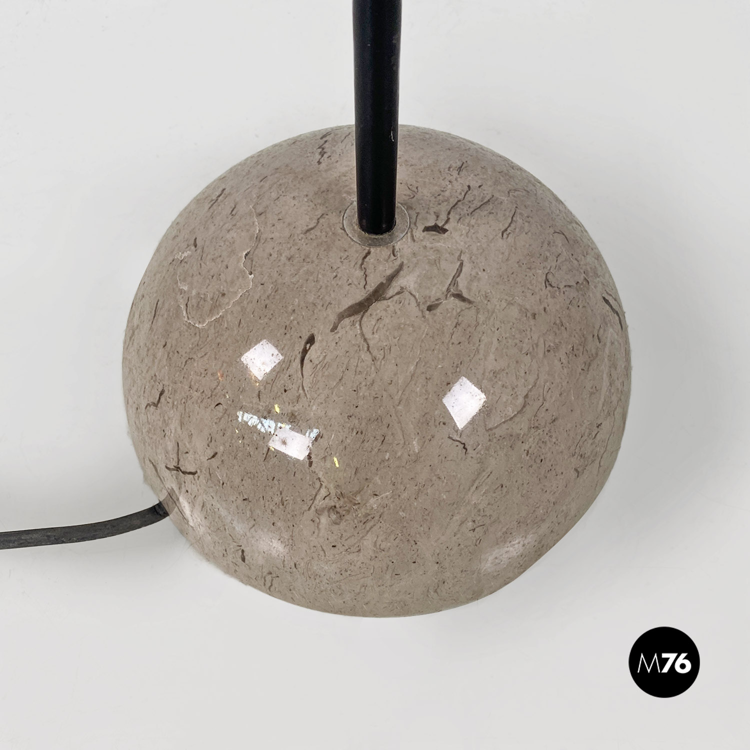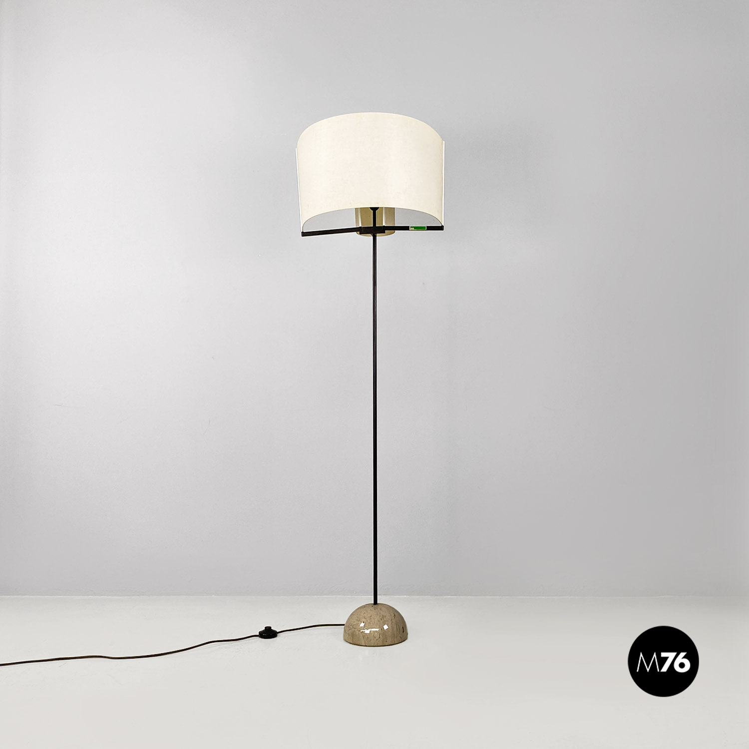 Lampada da terra modello Abate con base in marmo grigio semicircolare e la pianta in acciaio nero. Il paralume in particolare permette di spostarlo come si preferisce.