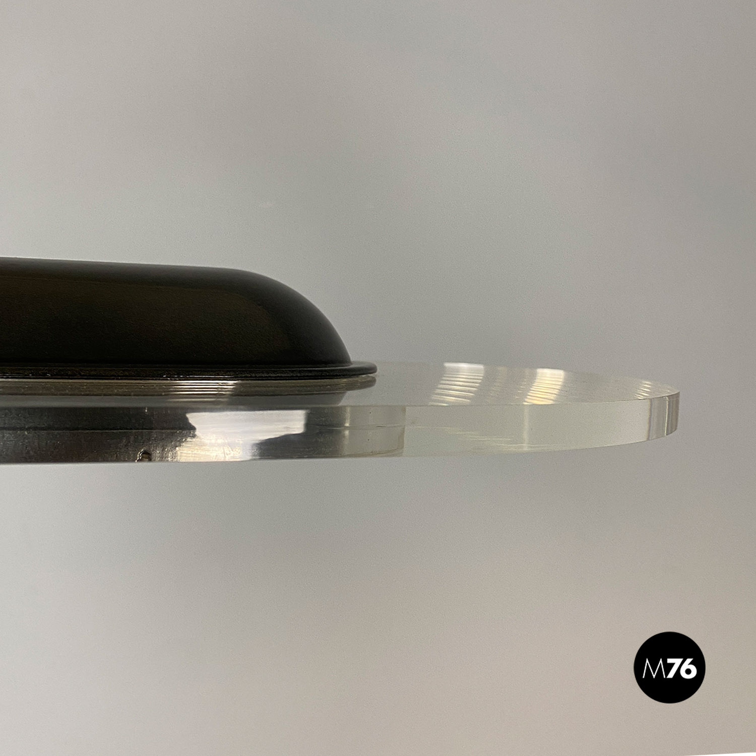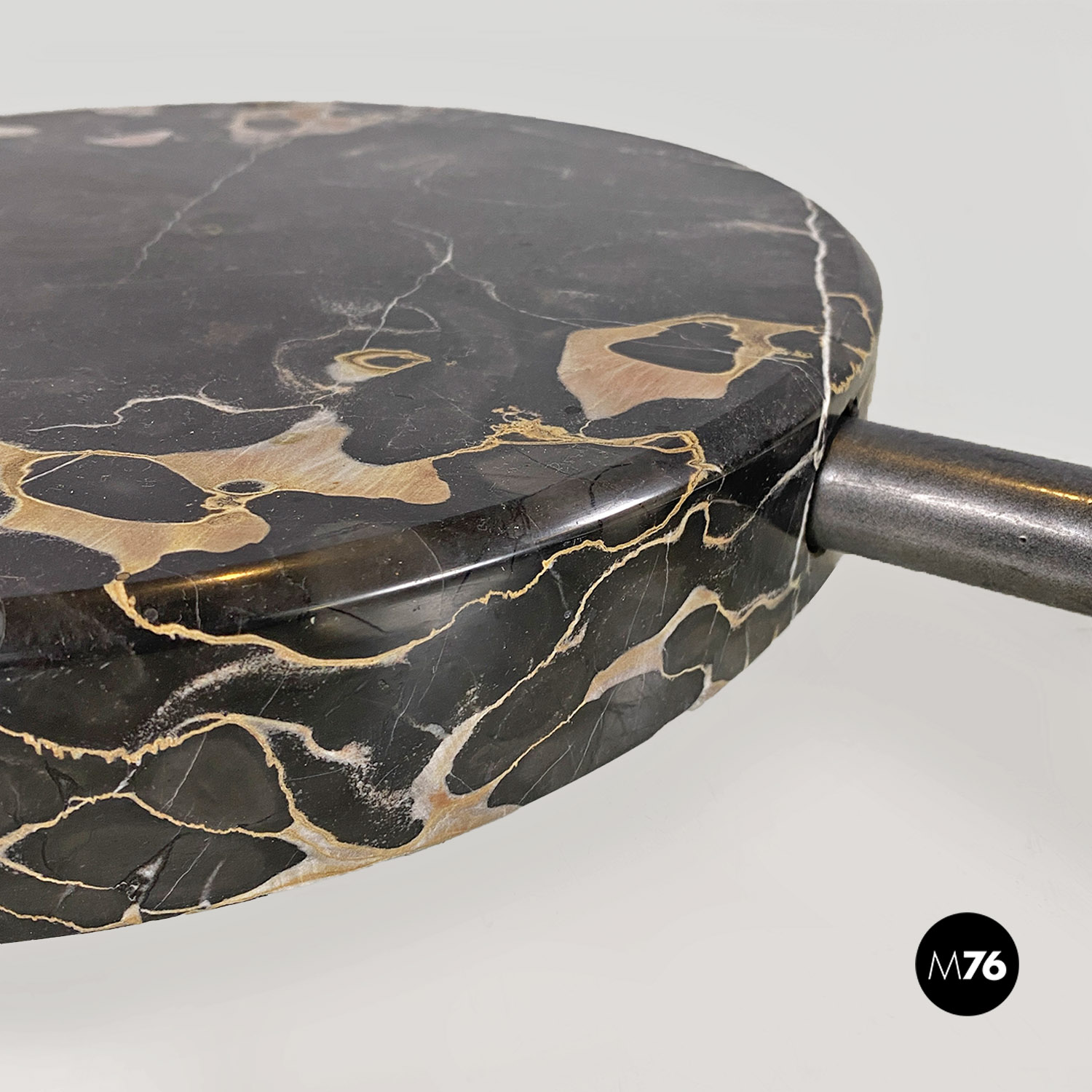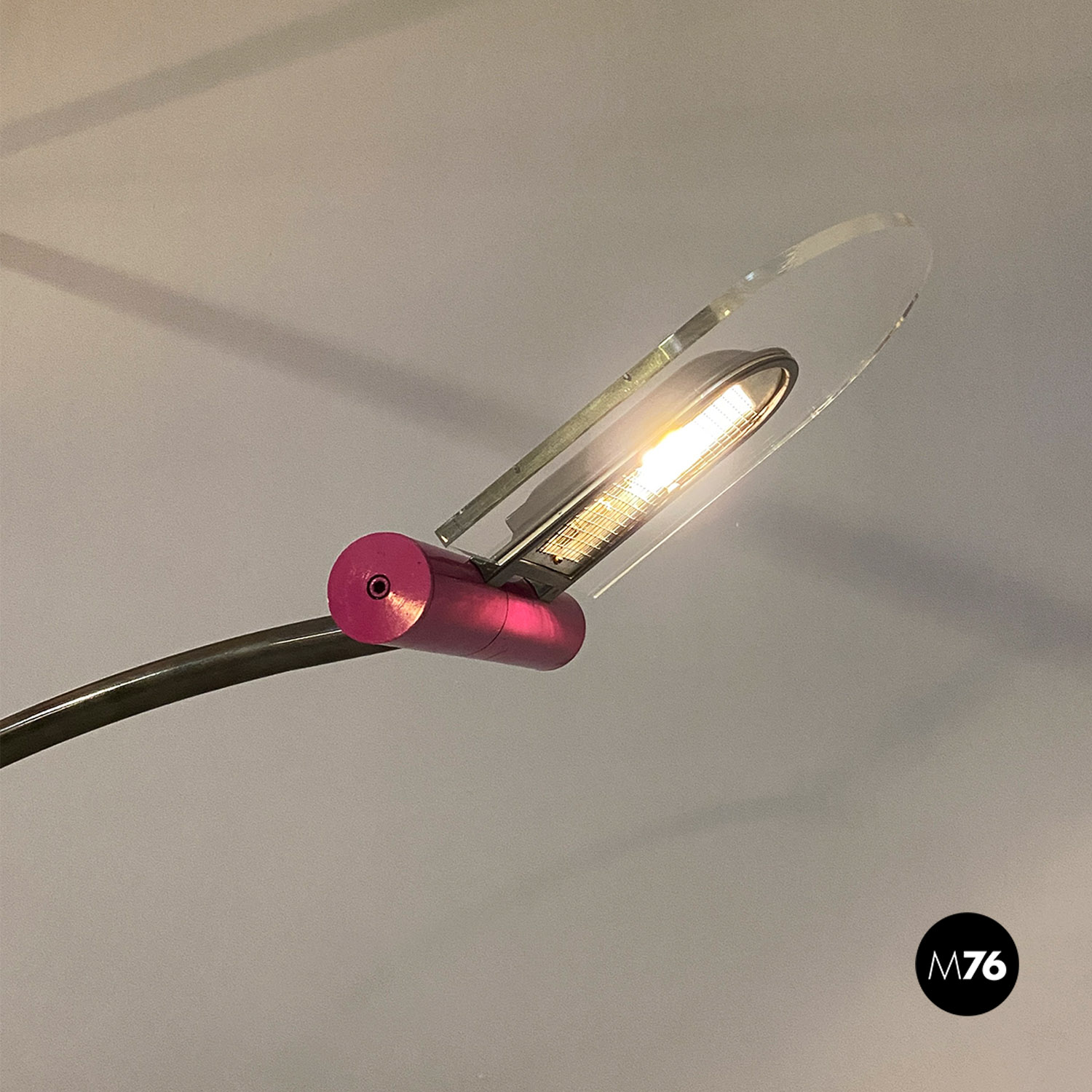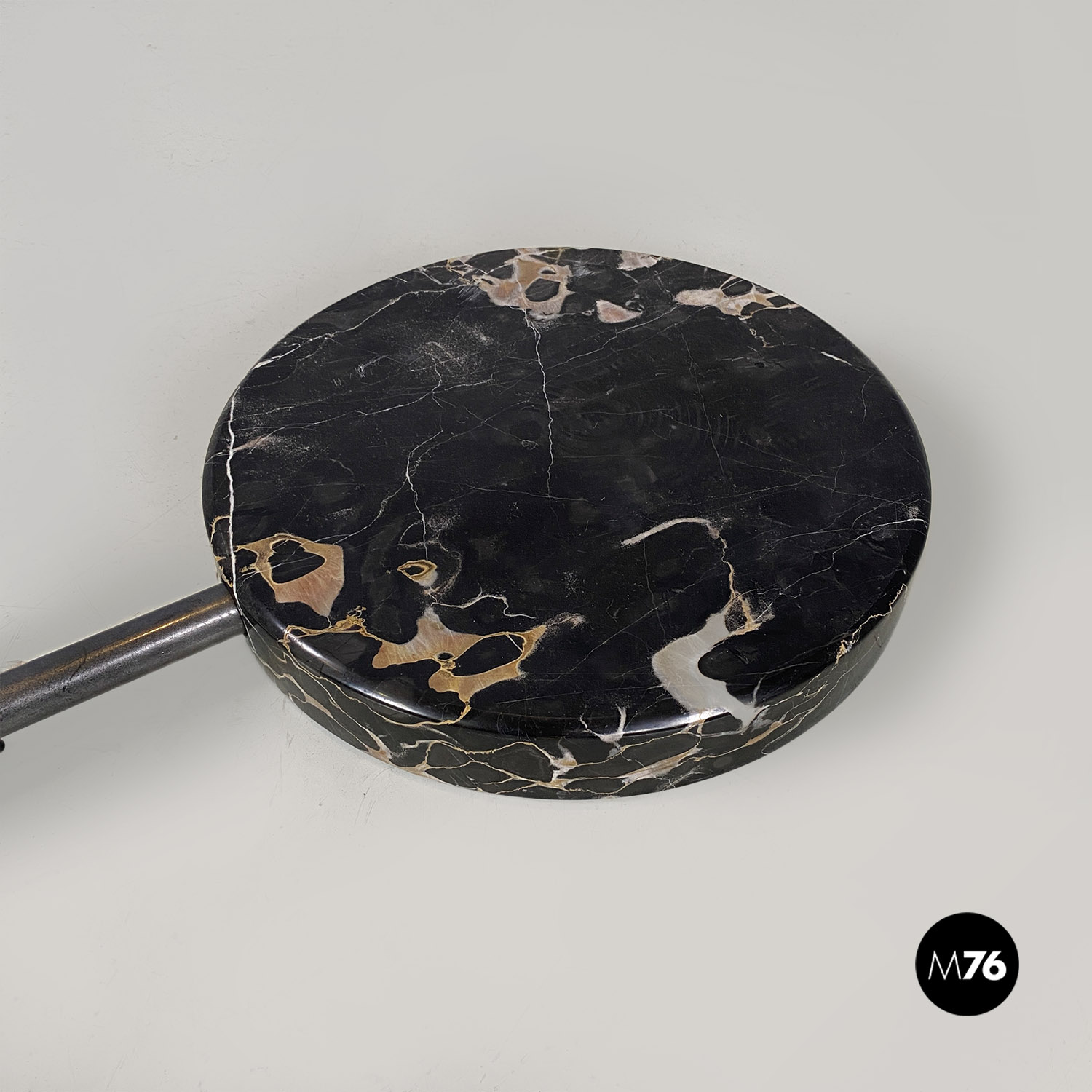Lampada ad arco con struttura in tubolare in metallo curvato color grigio scuro con paralume direzionabile formato da una lastra in plexiglass e base rotonda in marmo nero di Marquinia. L’intero braccio è direzionabile a proprio piacimento.
