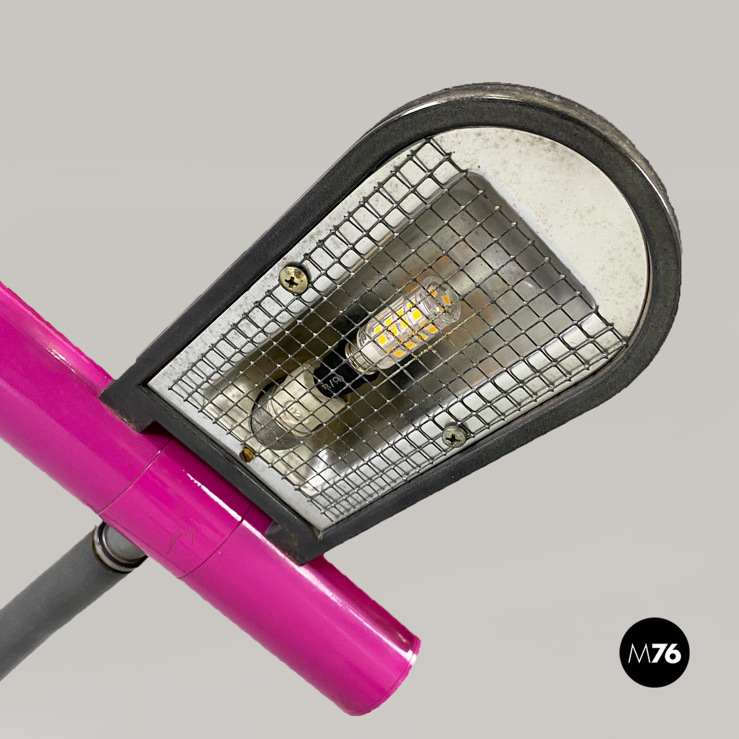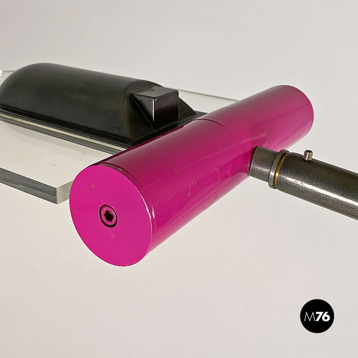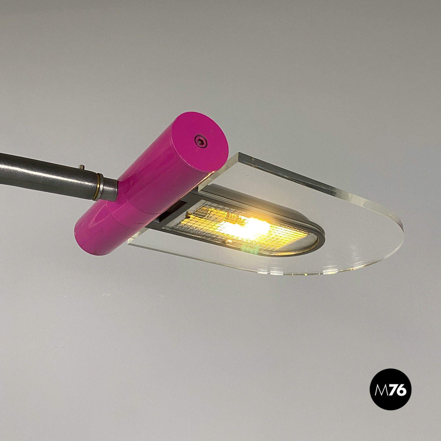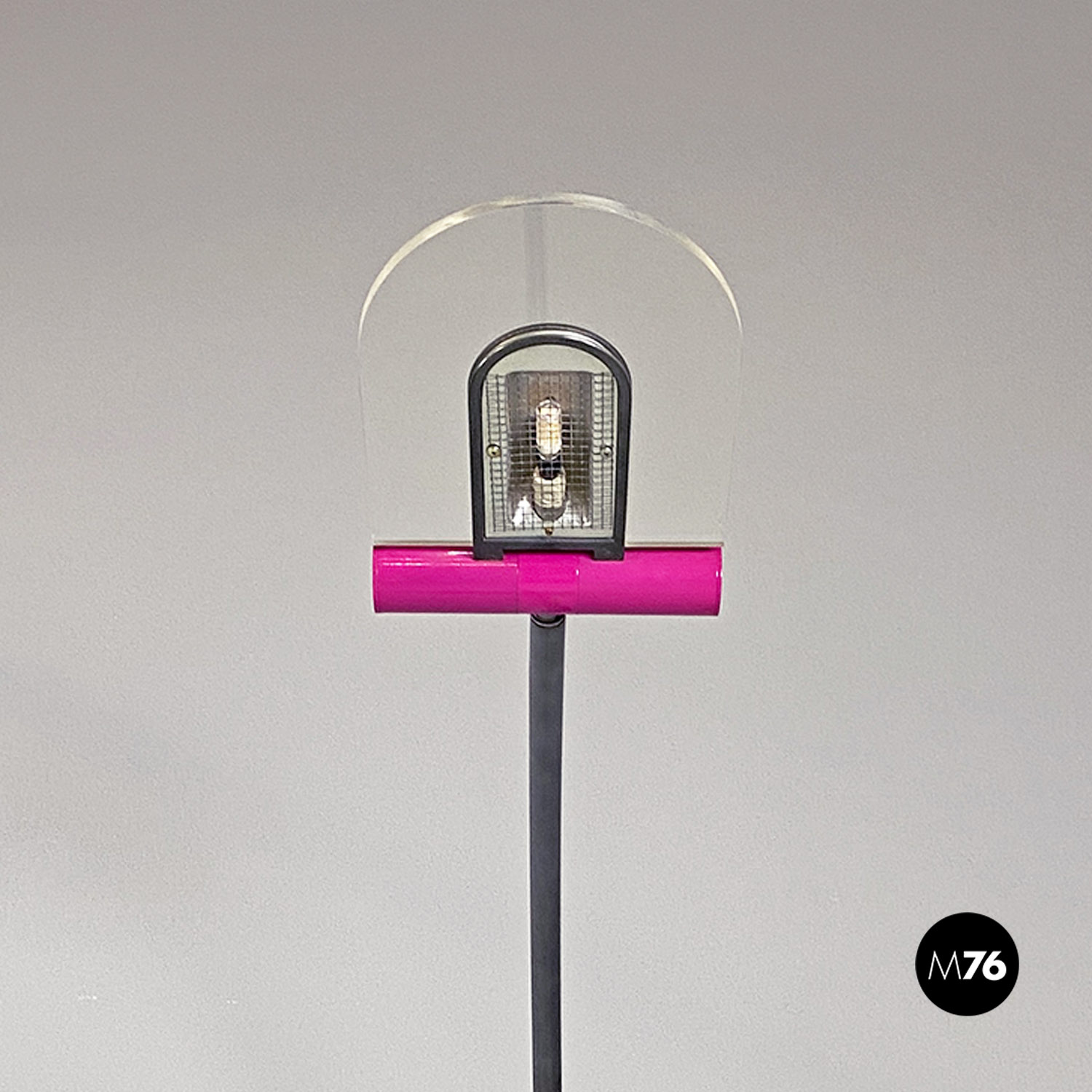 Lampada ad arco con struttura in tubolare in metallo curvato color grigio scuro con paralume direzionabile formato da una lastra in plexiglass e base rotonda in marmo nero di Marquinia. L’intero braccio è direzionabile a proprio piacimento.