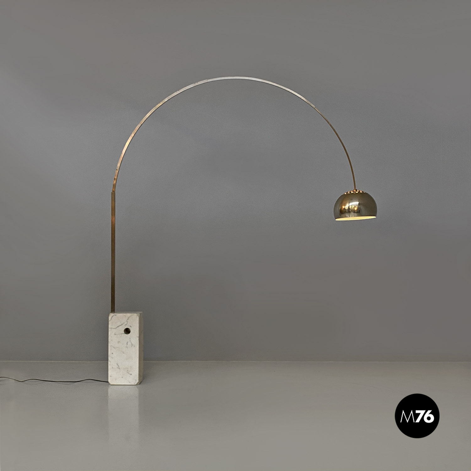 Lampada da terra modello Arco a luce diretta con base in marmo bianco di Carrara e stelo telescopico in acciaio inossidabile satinato. Riflettore orientabile e regolabile in altezza in alluminio stampato lucidato e zapponato.
