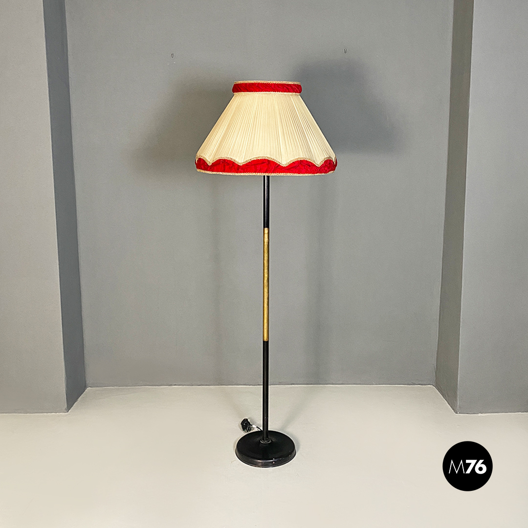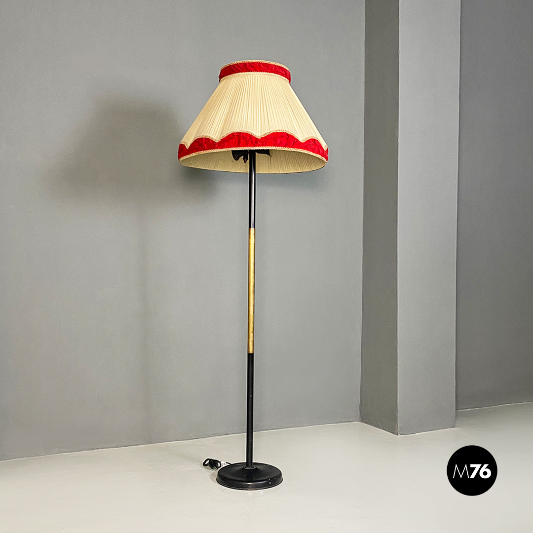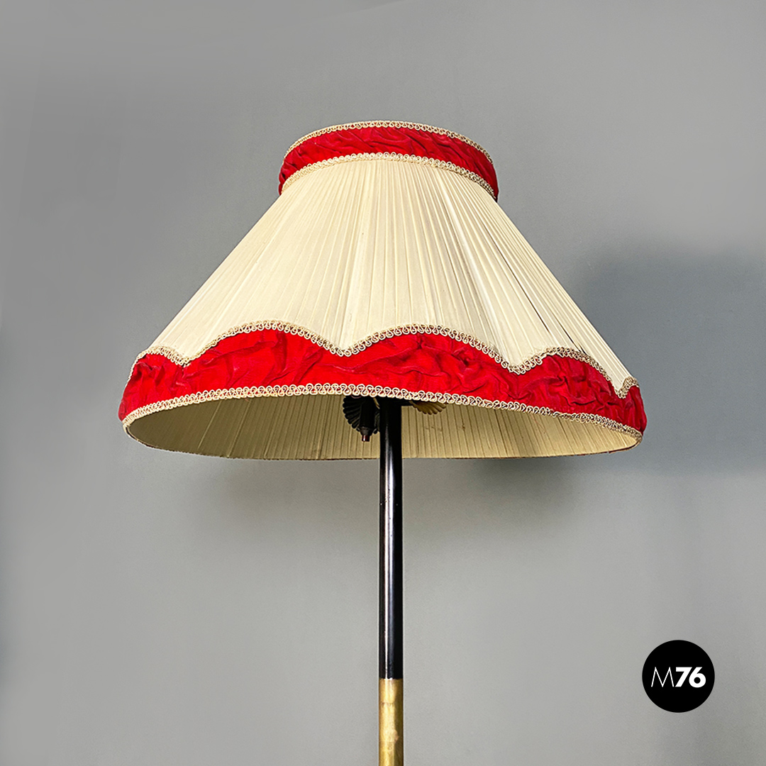 Lampada da terra con base tonda in metallo nero stelo in metallo ed ottone e paralume in tessuto plissettato a tronco di cono sui toni del beige con parte superiore ed inferiore del diffusore in velluto rosso.