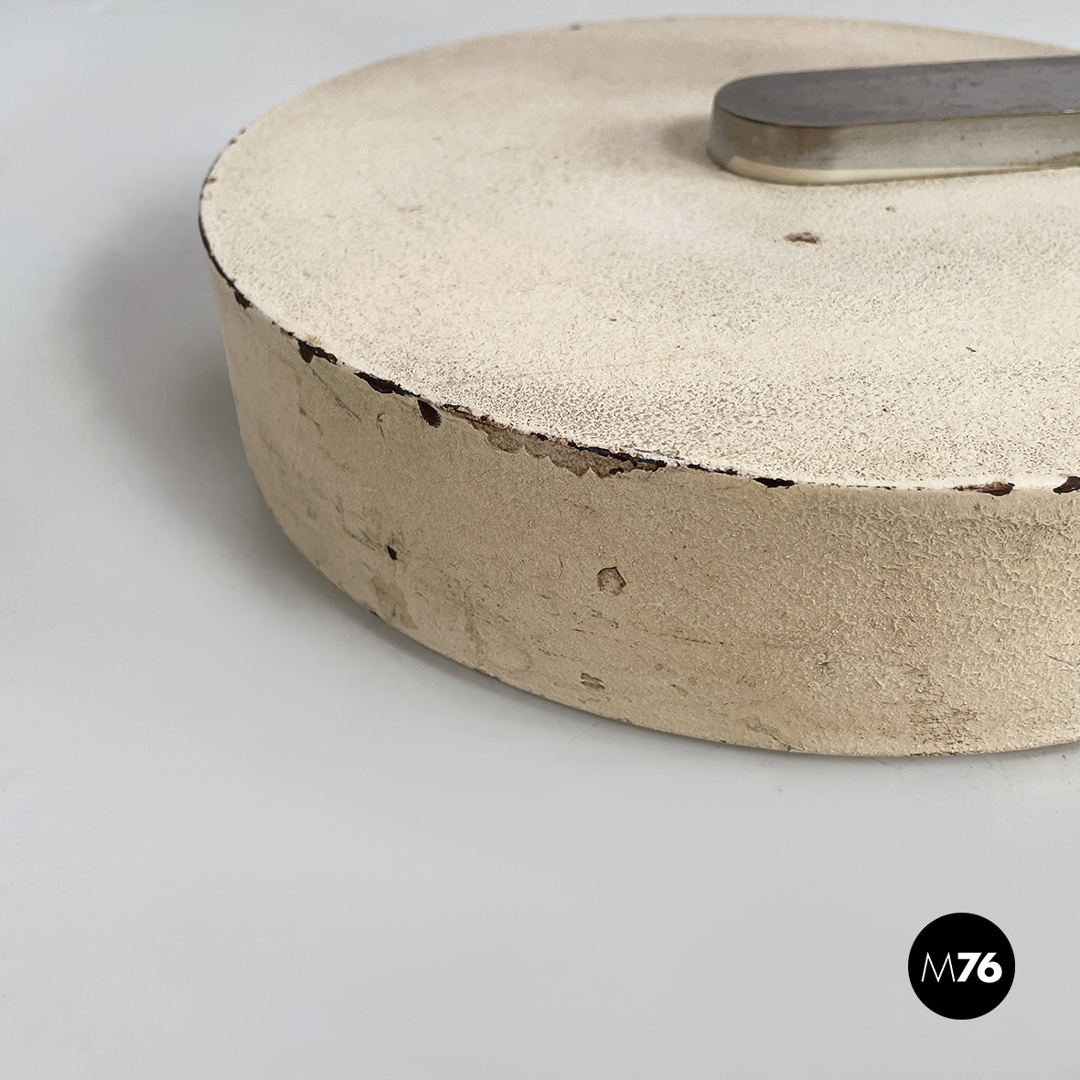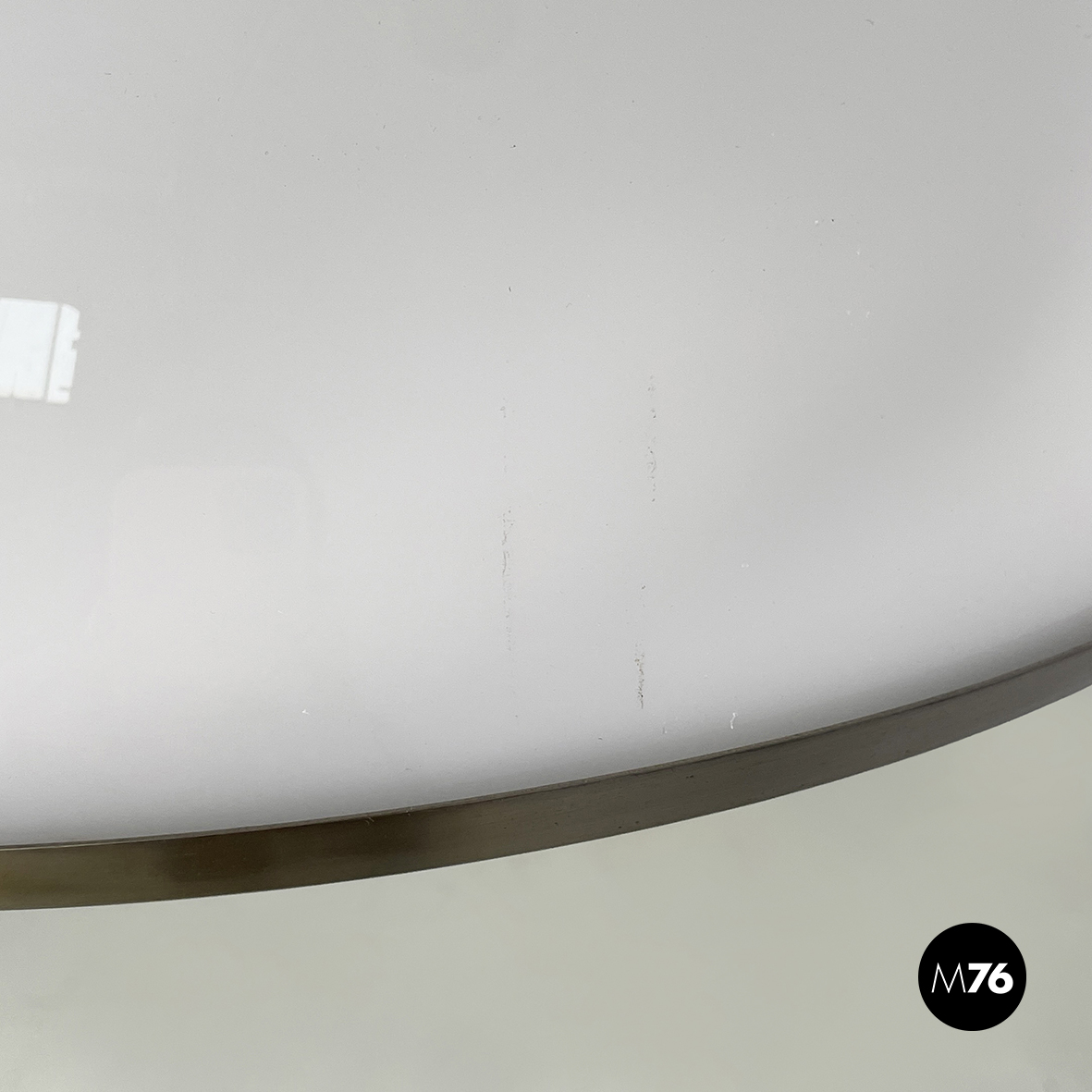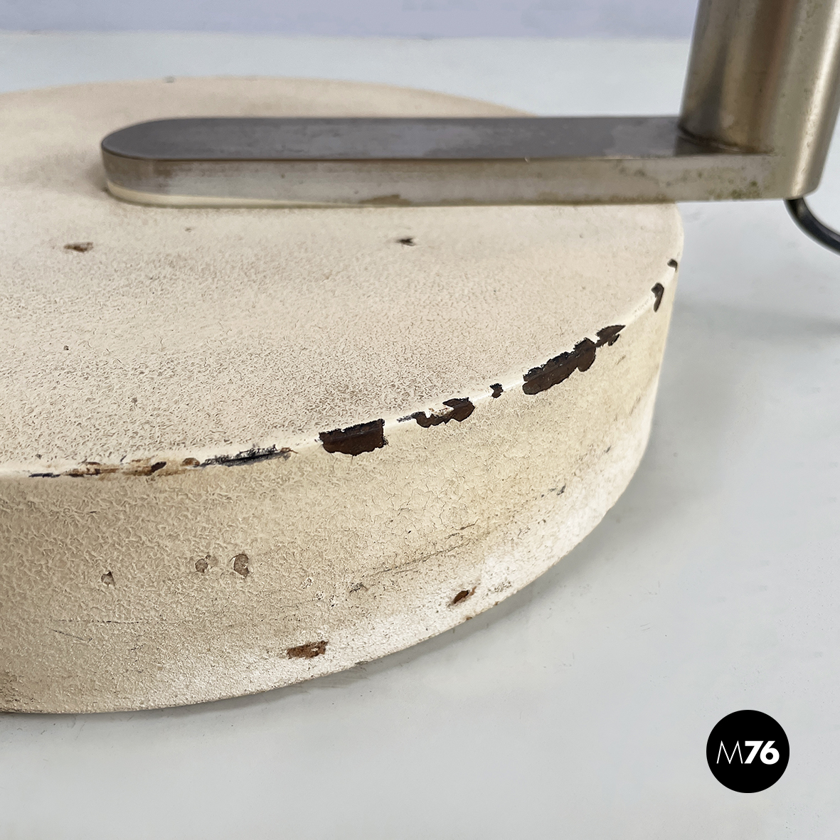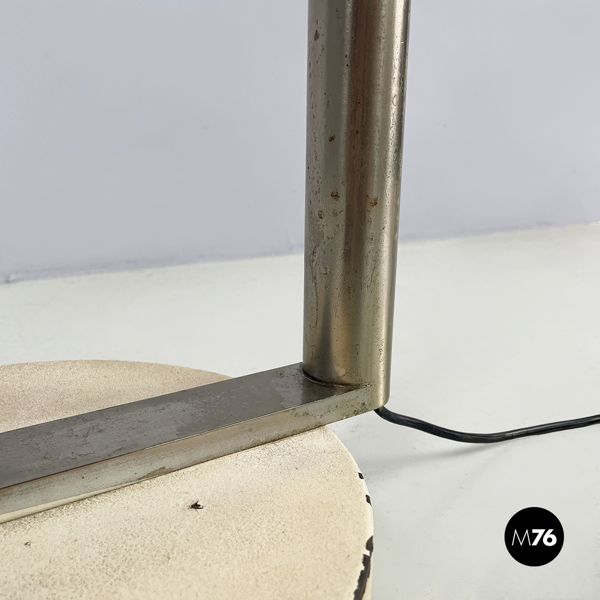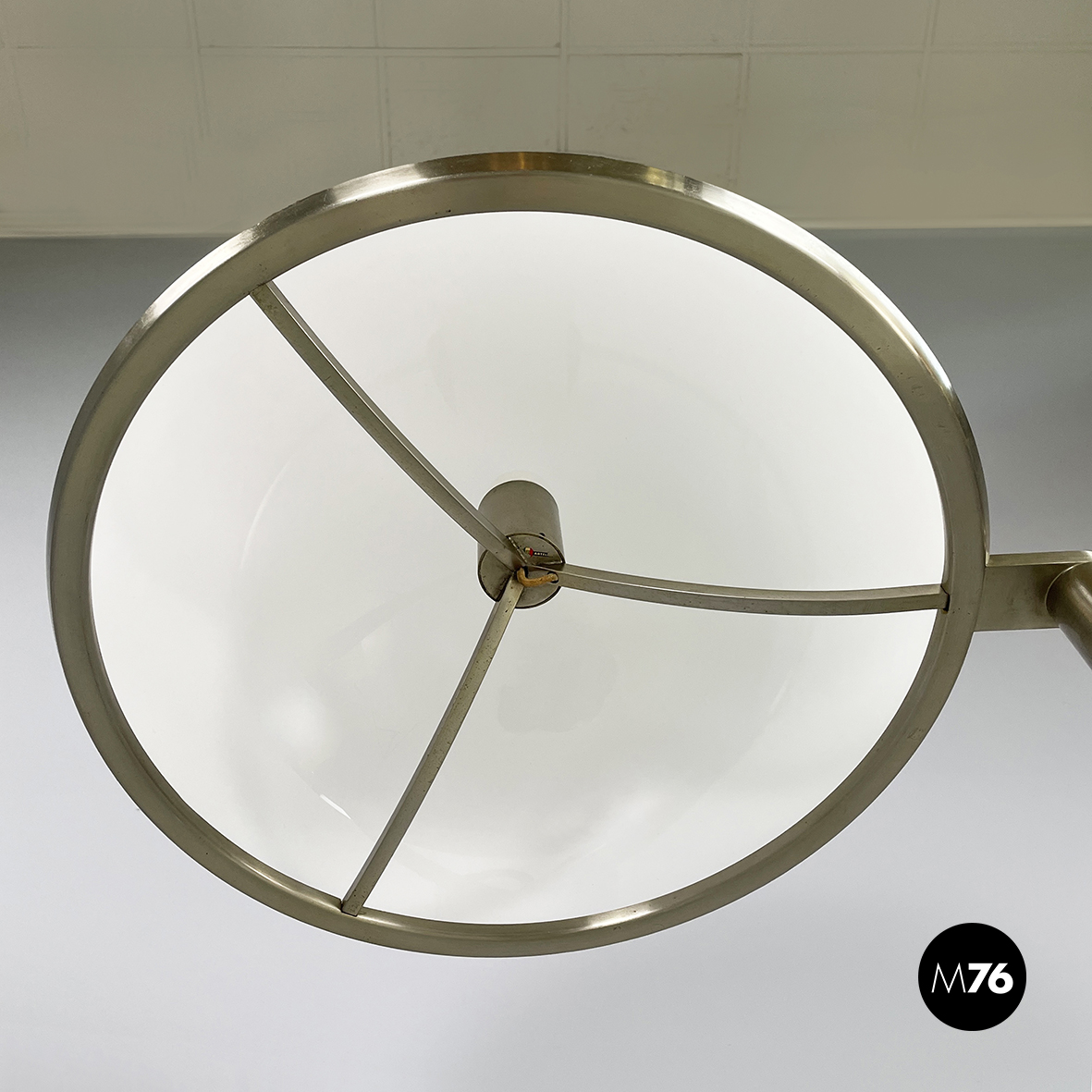 Lampada da terra con paralume a cupola in plastica opalina con profilo inferiore metallico. La lampadina è sostenuta da tre bracci metallici. La struttura a sezione tonda in metallo è a forma di C. Sulla struttura è presente l’interruttore. Base tonda in metallo verniciato beige. Proveniente dal periodo Space Age.