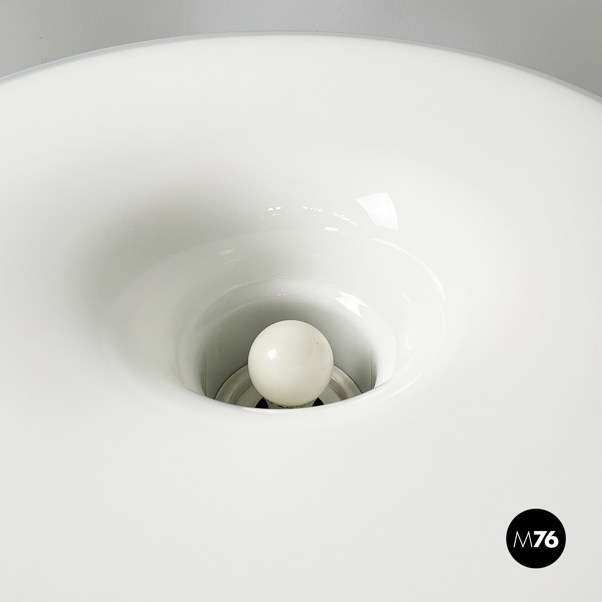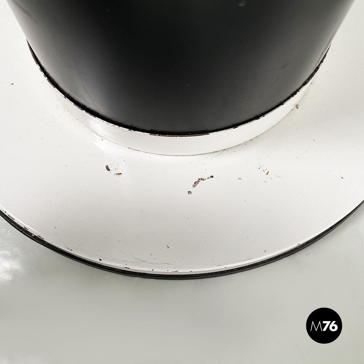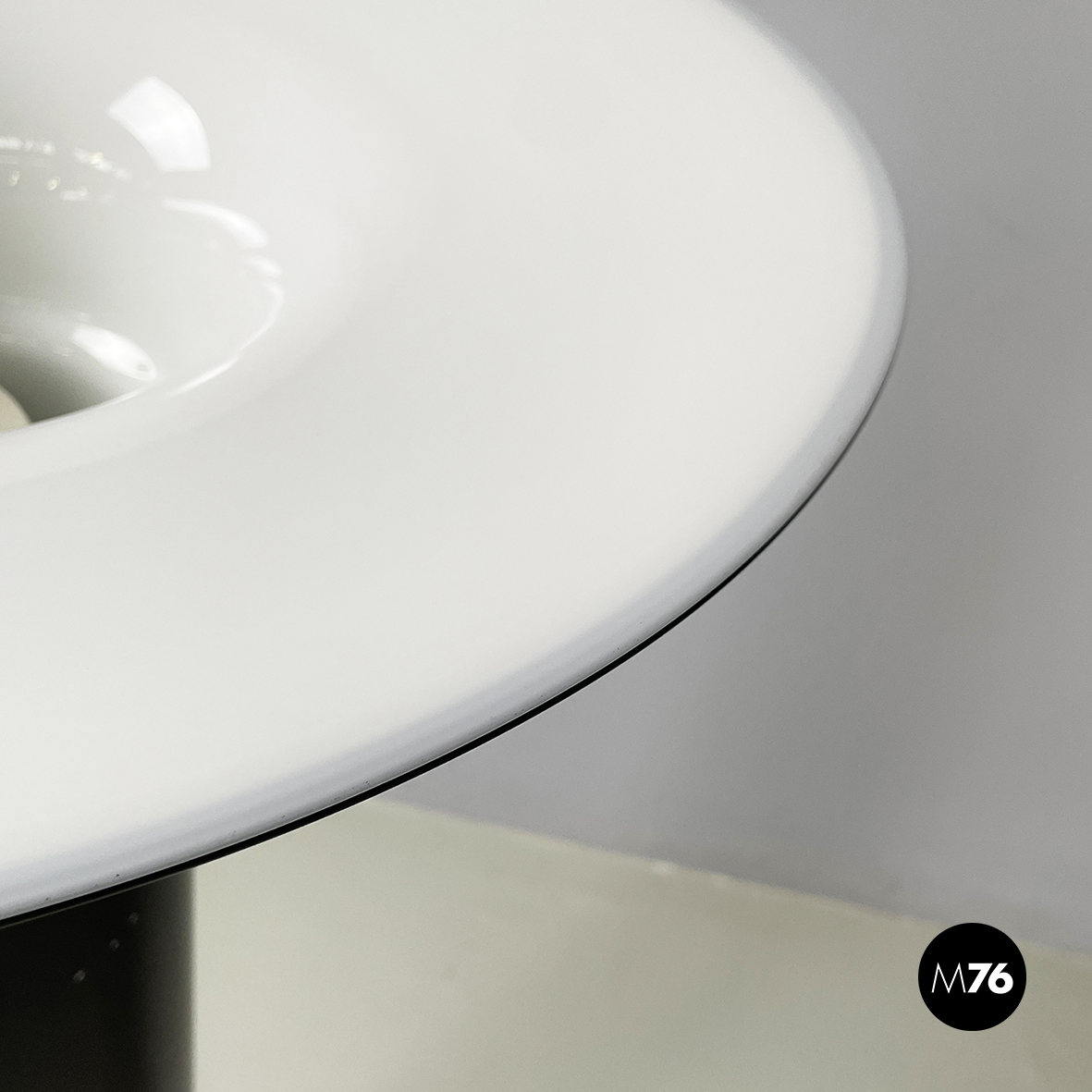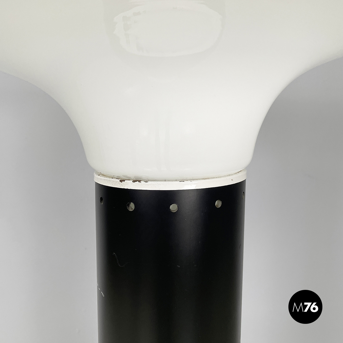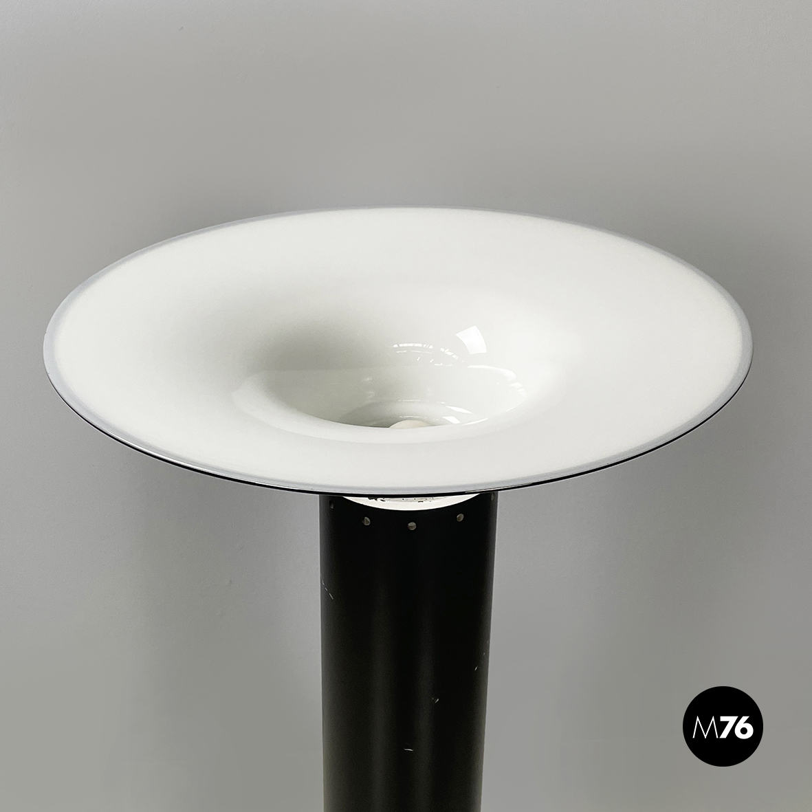 Lampada da terra con diffusore tondo in vetro opalino e profilo nero. La struttura è a sezione tonda in plastica verniciata nera con profili in metallo verniciato bianco. Base tonda in metallo verniciato bianco.