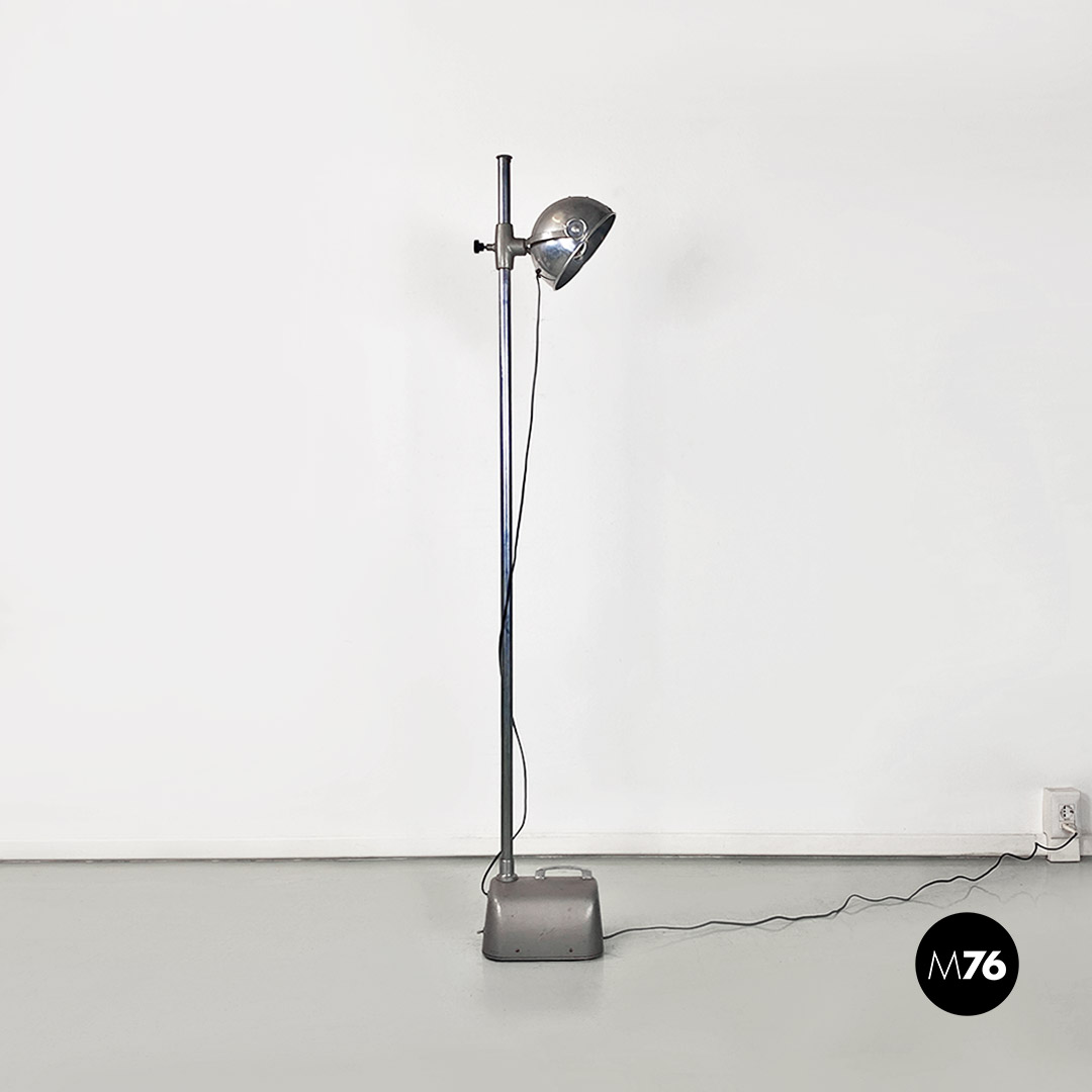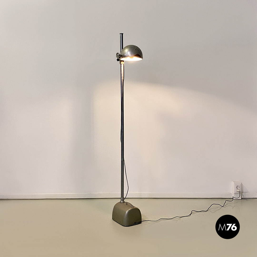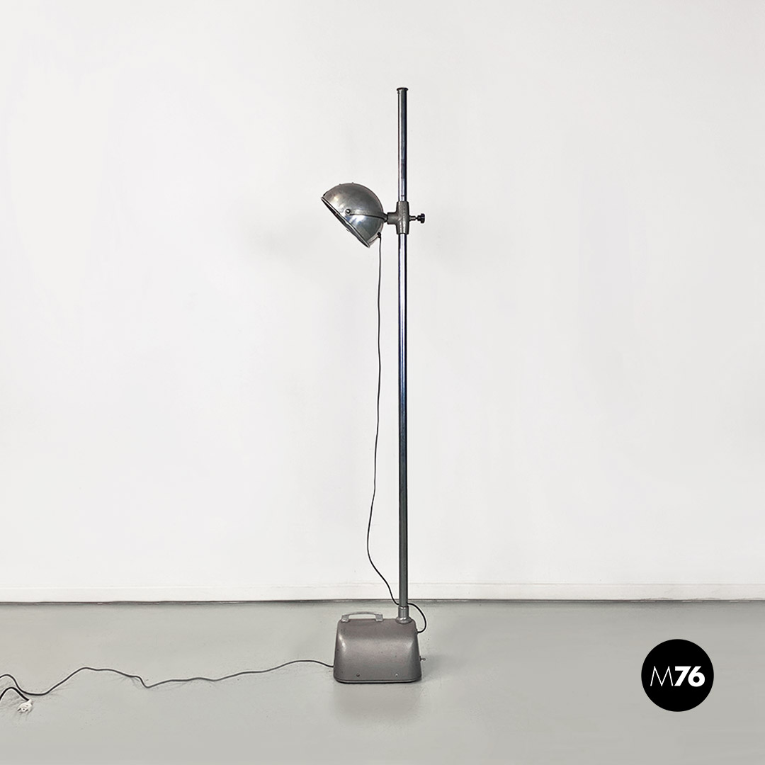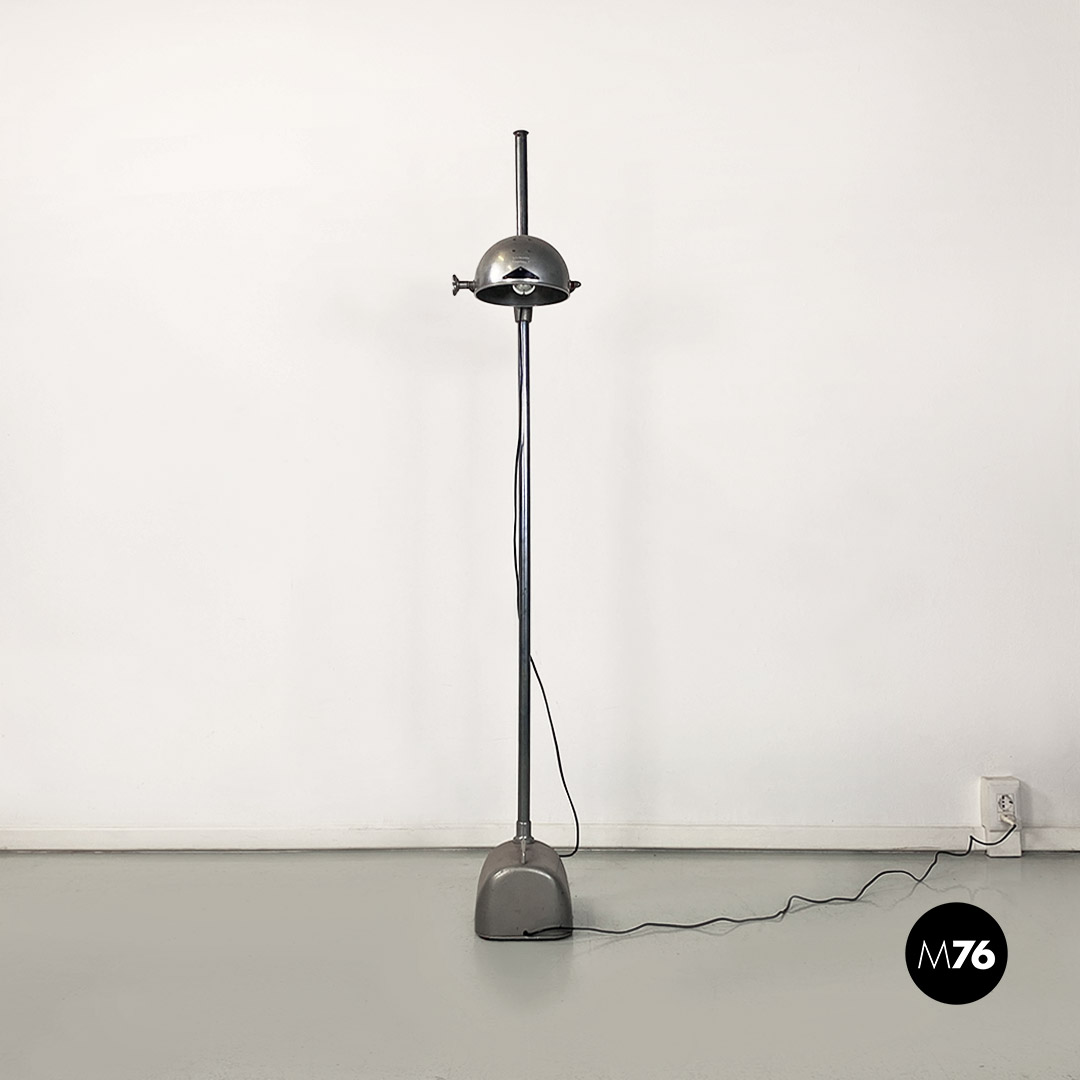 Lampada da terra industriale di provenienza tedesca con base in metallo con maniglia in acciaio e interruttore sul retro stelo sempre in acciaio a sezione tonda su cui scorre e si fissa il paralume tramite una manopola. Paralume semisferico e orientabile in tutte le direzioni.